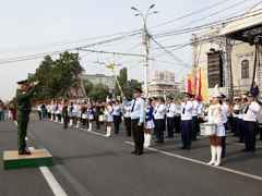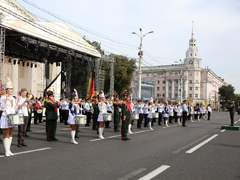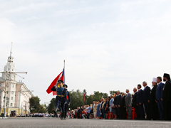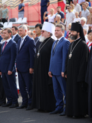 В 10:00 началась торжественная церемония открытия праздника – сводный духовой оркестр, которым дирижировал старший преподаватель Военного университета Министерства обороны РФ, Заслуженный артист России, полковник Александр Халилов. Музыканты исполнили произведения «Славься» и «Прощание славянки». В небо отправились десятки белых голубей, а на площадь Ленина знаменосцы торжественно внесли флаги Российской Федерации, региона и города.