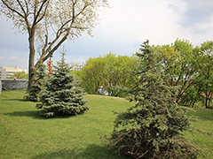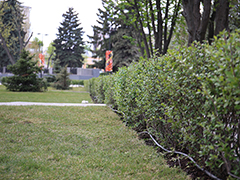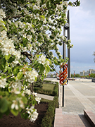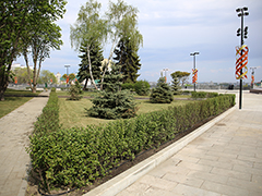 Уже завершено озеленение площади Победы – более 11 тысяч однолетников (бегоний и цинерарий) украсили клумбы на входе и выходе с территории братской могилы №100 (так еще называется площадь Победы). На склоне высажены растения — 500 кустов девичьего винограда. Он выполняет, кроме эстетической (вертикальное озеленение), важную практическую функцию - закрепляет грунт. Основная часть площади, где оставалась открытая поверхность, укрыта рулонным газоном (более 4 000 квадратных метров). Зонирование территории выполнено кустарником кизильника. Вся территория оснащена системой автополива, имеющей протяженность около двух километров и оборудованной более 100 форсунками.