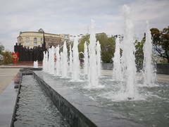 Главный акцент площади Победы – фонтанный комплекс. Это переливной фонтан, который состоит из трех двойных чаш, композиционно повторяющих геометрию площади.