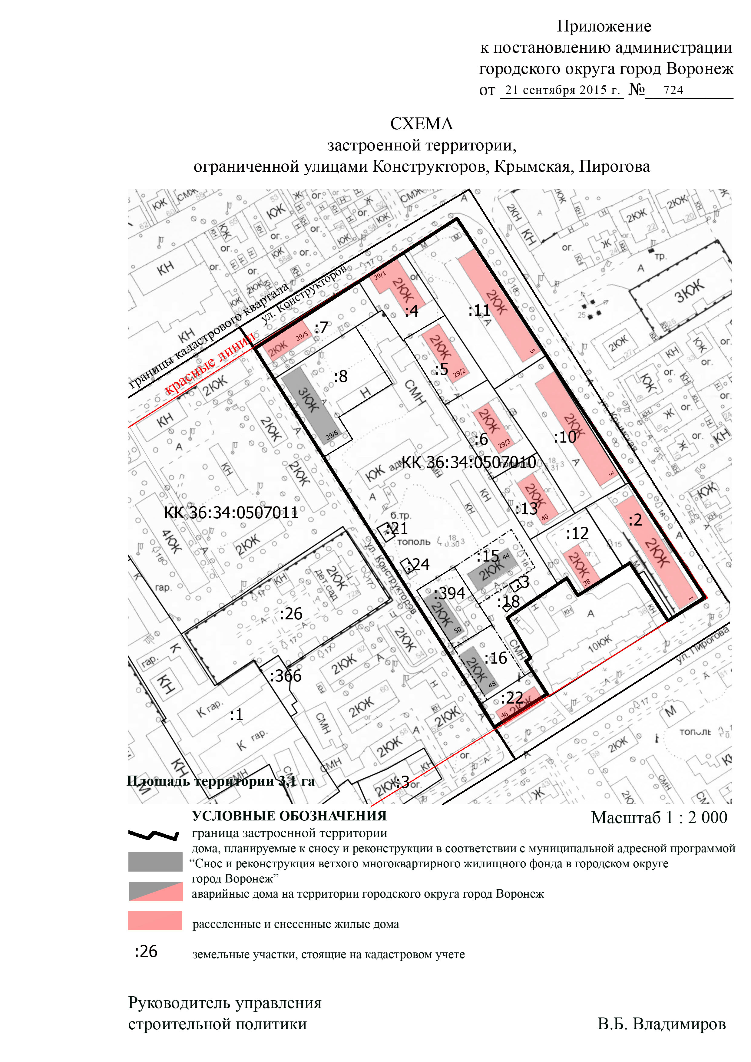 1. Принять решение о развитии застроенной территории, ограниченной улицами Конструкторов – Крымская – Пирогова в городском округе город Воронеж, ориентировочной площадью 3,1 га согласно схеме (приложение к настоящему постановлению), в соответствии с градостроительным регламентом Ж 8, установленным Правилами землепользования и застройки городского округа город Воронеж.