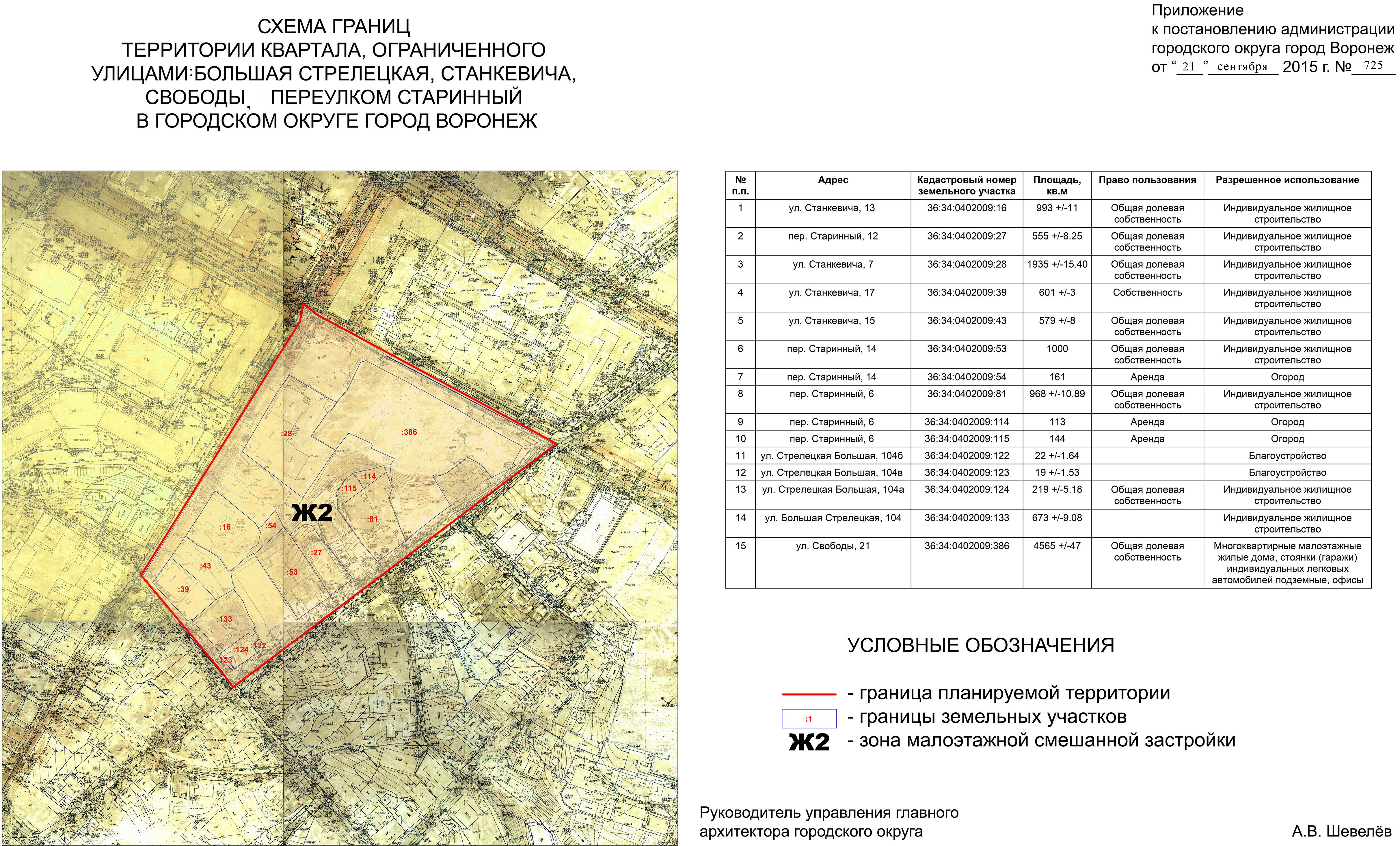 2.2. Обеспечить подготовку в соответствии с утвержденным заданием проекта планировки территории квартала, ограниченного улицами: Большая Стрелецкая, Станкевича, Свободы, переулком Старинный в городском округе город Воронеж согласно прилагаемой схеме.