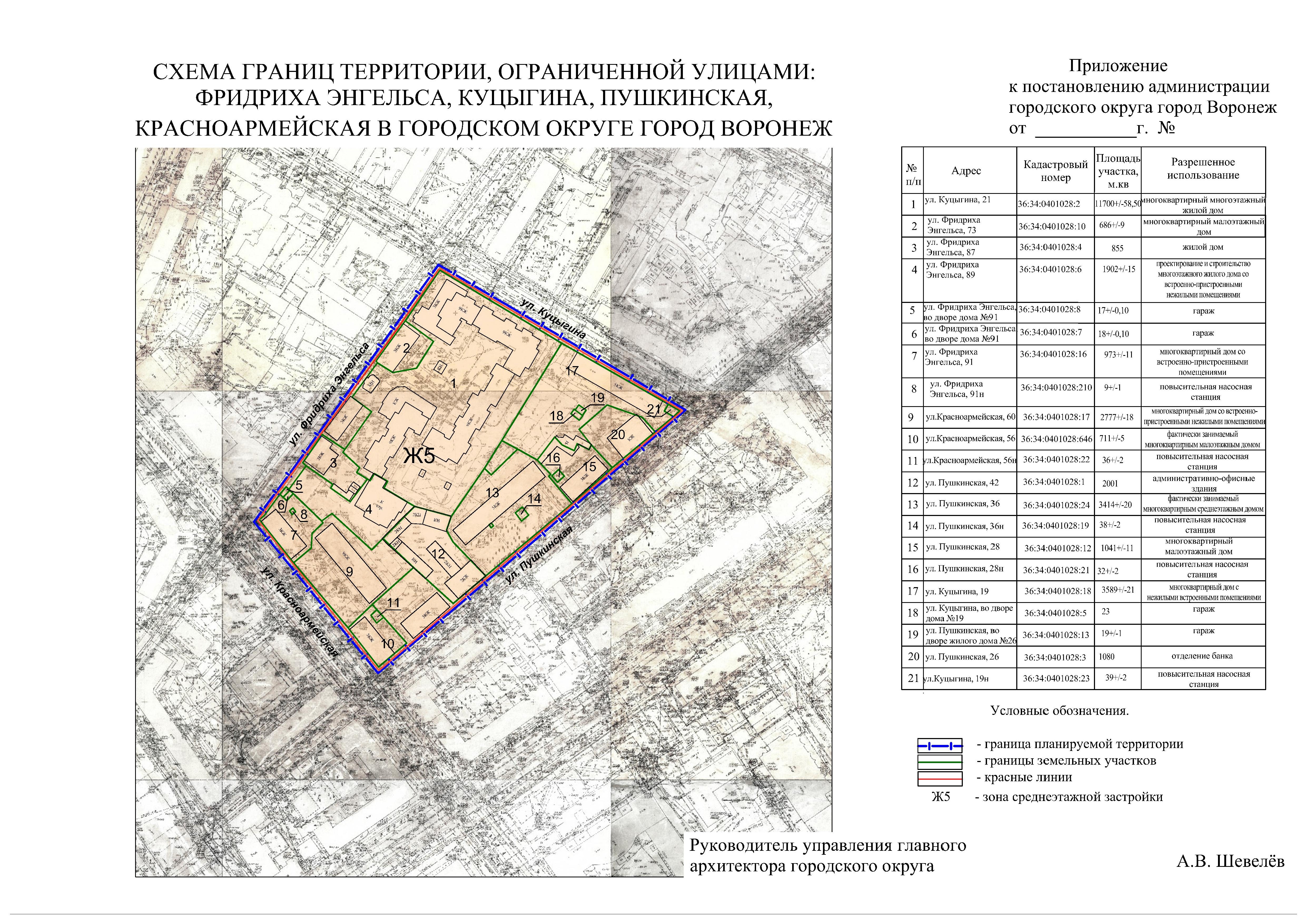 2.1. Подготовить в соответствии с утвержденным заданием, указанным в пункте 1 настоящего постановления, проект планировки территории, ограниченной улицами: Фридриха Энгельса, Куцыгина, Пушкинская, Красноармейская в городском округе город Воронеж согласно прилагаемой схеме.