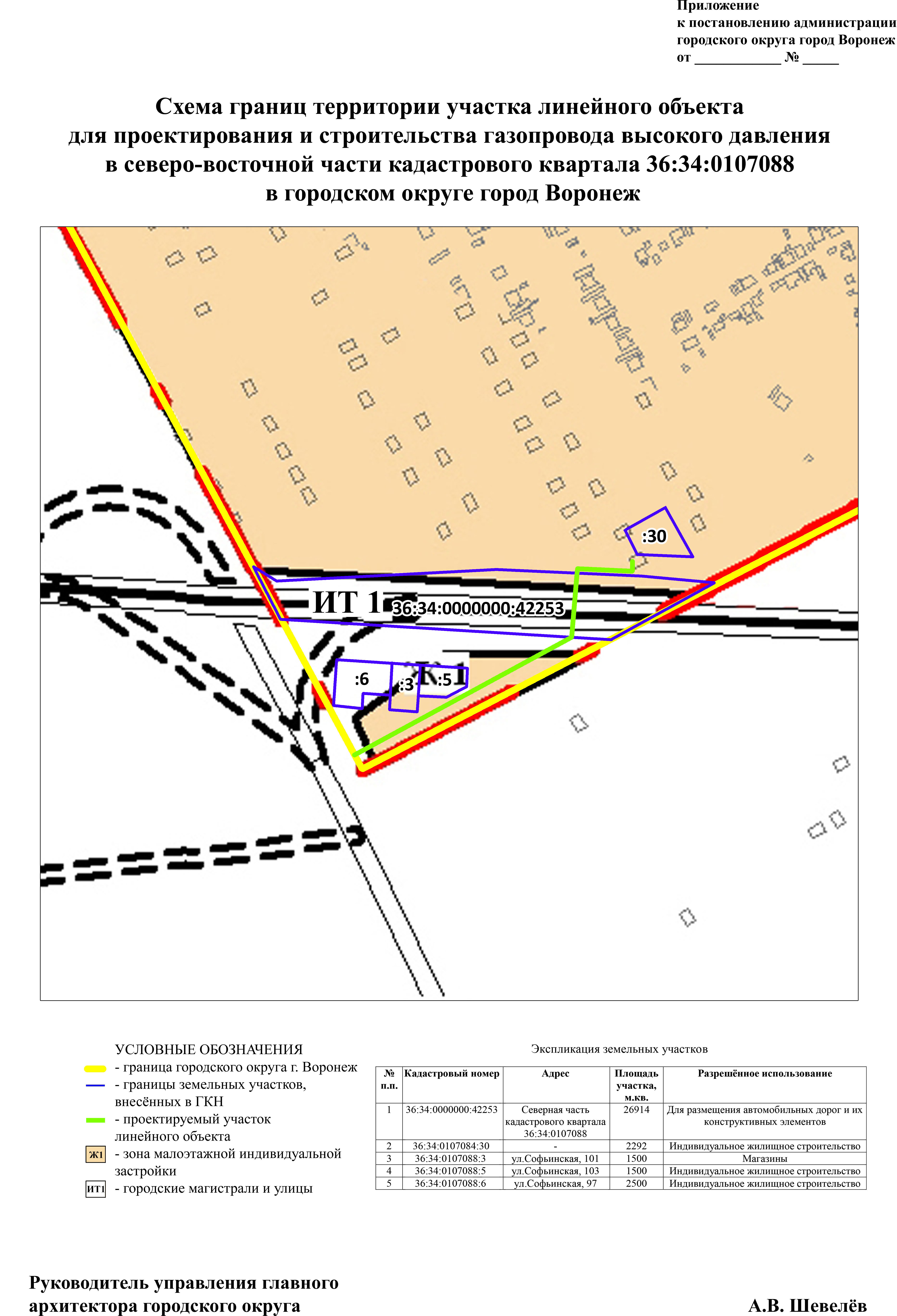 2.1. Подготовить в соответствии с утвержденным заданием документацию по планировке территории участка линейного объекта для проектирования и строительства газопровода высокого давления в северо-восточной части кадастрового квартала 36:34:0107088 в городском округе город Воронеж согласно прилагаемой схеме.