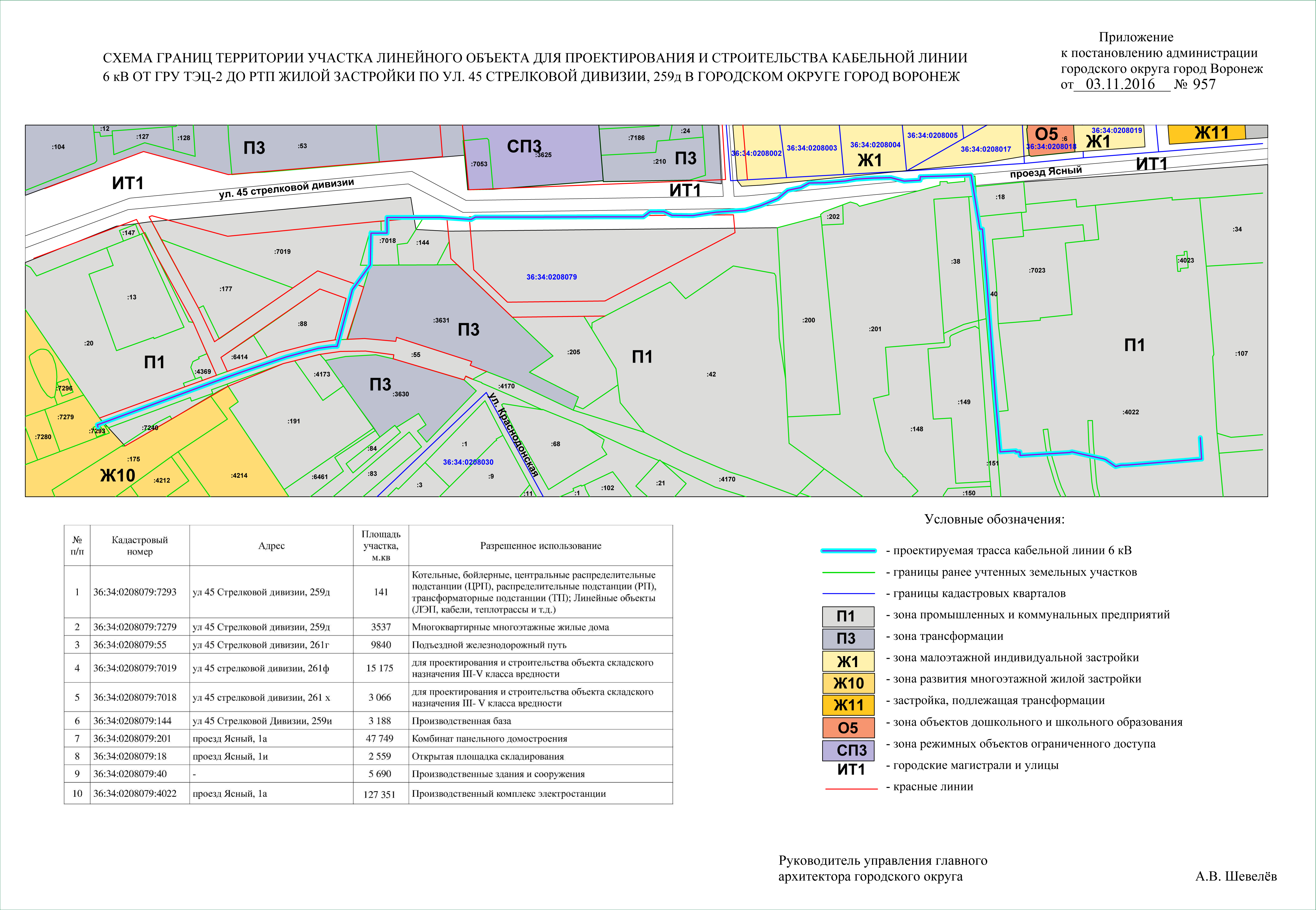 2.1. Подготовить в соответствии с утвержденным заданием документацию по планировке территории участка линейного объекта для проектирования и строительства кабельной линии 6 кВ от ГРУ ТЭЦ-2 до РТП жилой застройки по ул. 45 стрелковой дивизии, 259д в городском округе город Воронеж согласно прилагаемой схеме.