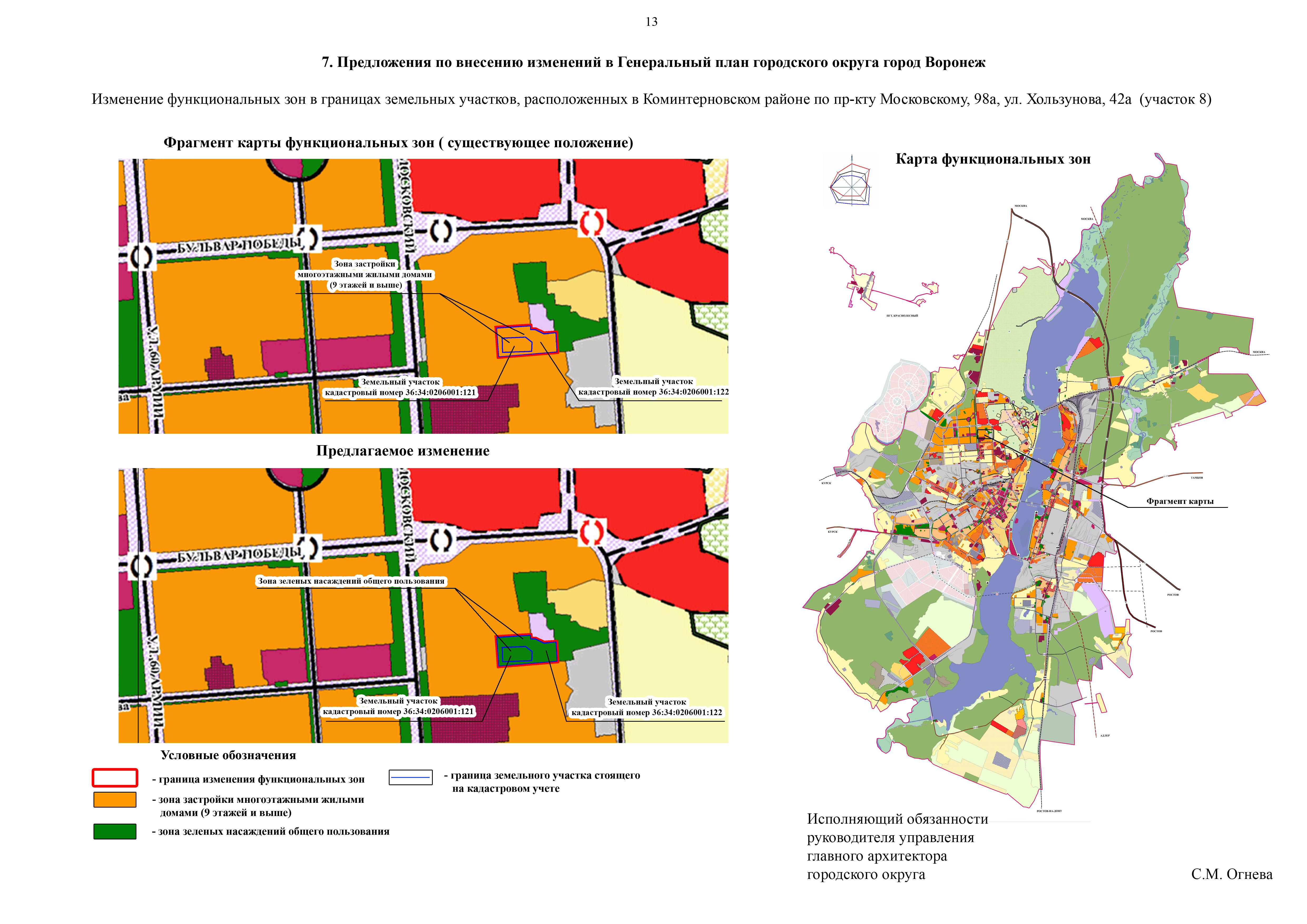 1.1. Проекту внесения изменений в Генеральный план городского округа город Воронеж в части изменения границ функциональных зон с целью отнесения к функциональной зоне зеленых насаждений общего пользования земельных участков, расположенных по адресам: пр-кт Московский, 98а (кадастровый номер 36:34:0206001:121), ул. Хользунова, 42а (участок 8) (кадастровый номер 36:34:0206001:122) (приложение № 1 к настоящему постановлению).