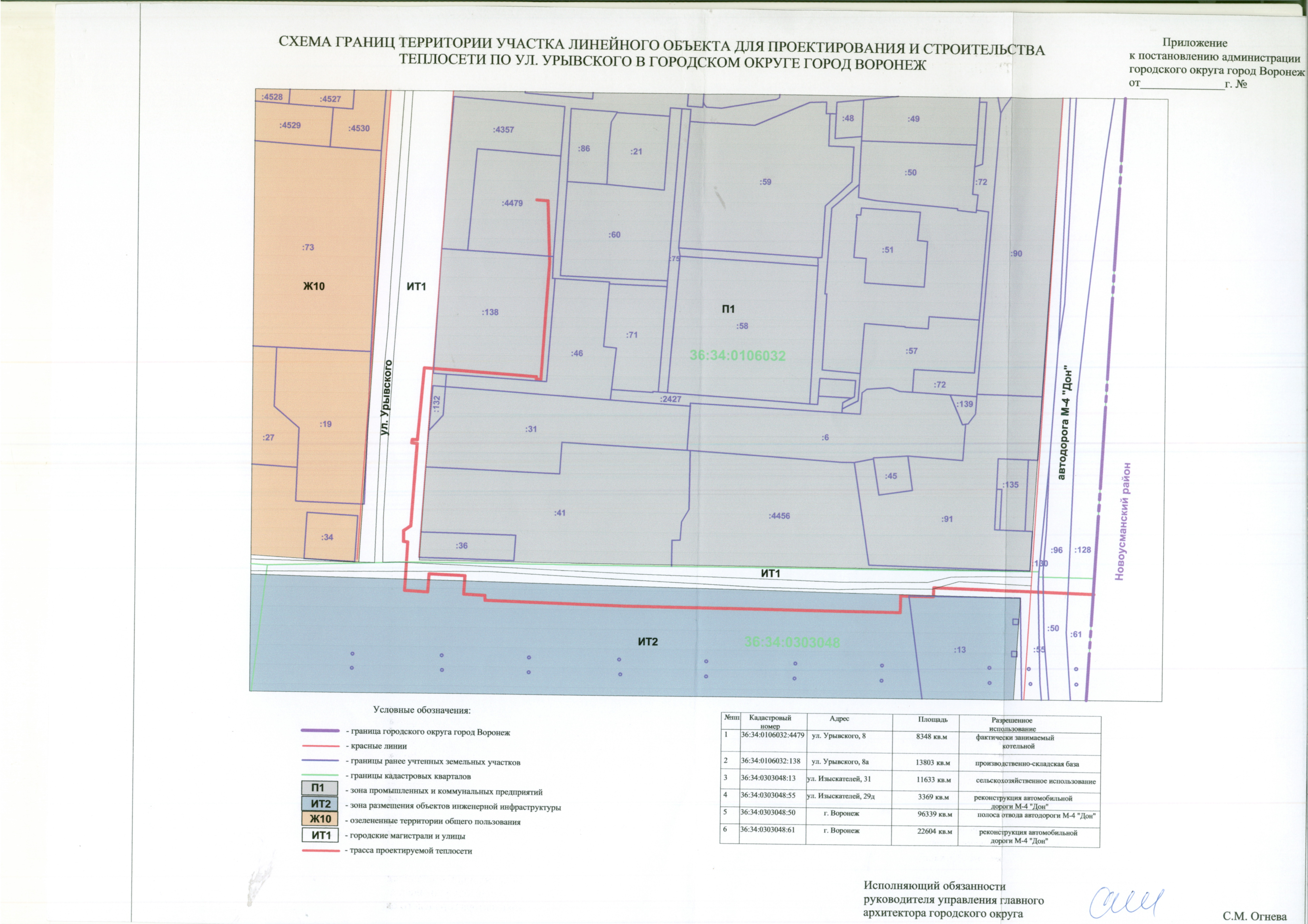 2.1. Подготовить в соответствии с утвержденным заданием документацию по планировке территории участка линейного объекта для проектирования и строительства теплосети по ул. Урывского в городском округе город Воронеж согласно прилагаемой схеме.