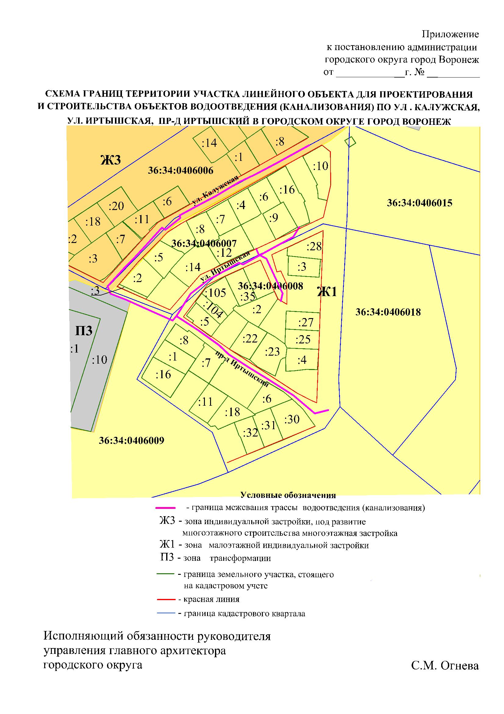 2.1. Подготовить в соответствии с утвержденным заданием проект межевания территории участка линейного объекта для проектирования и строительства объектов водоотведения (канализования) по ул. Калужская, ул. Иртышская, пр-д Иртышский в городском округе город Воронеж согласно прилагаемой схеме.