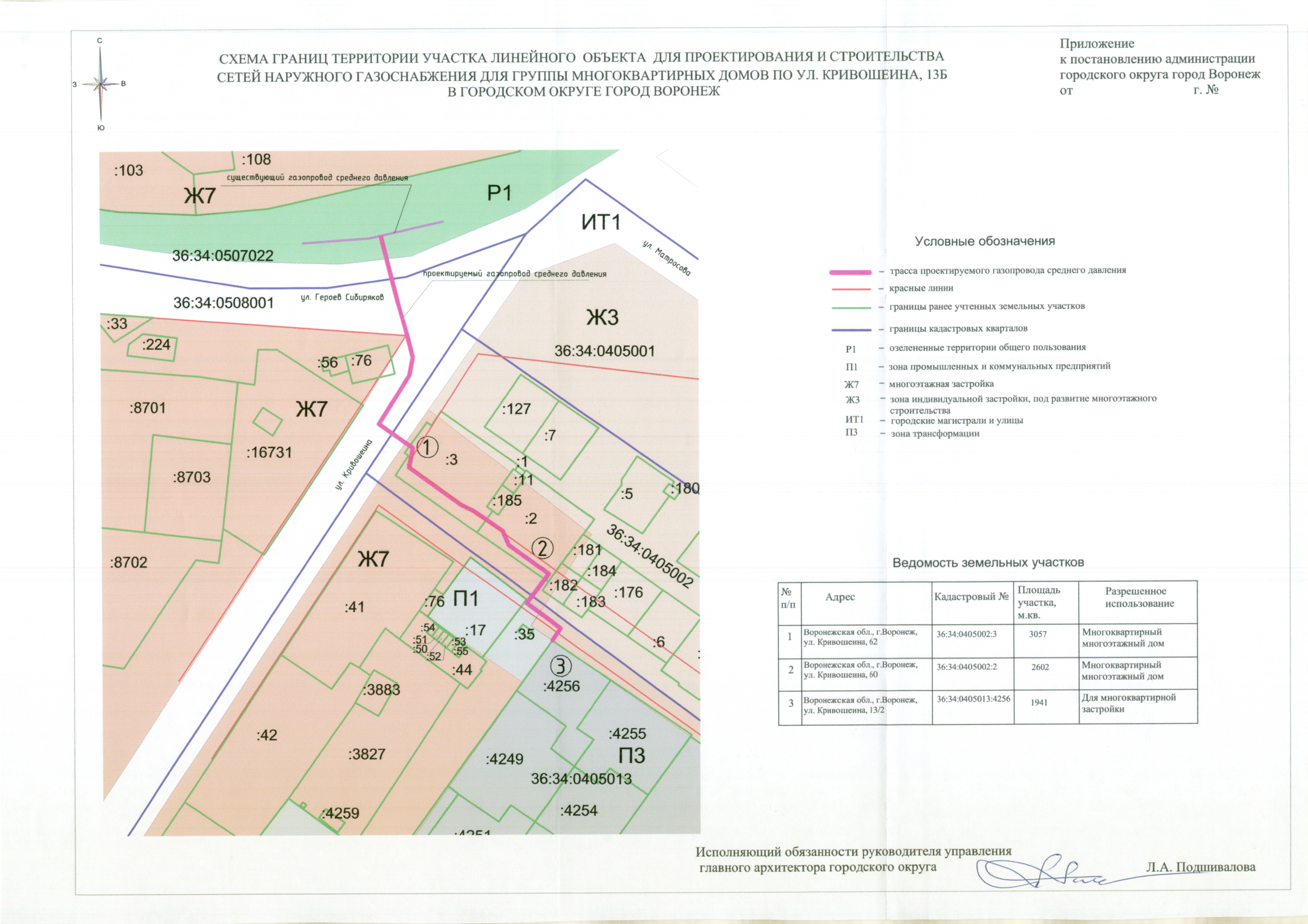2.1. Подготовить в соответствии с утвержденным заданием документацию по планировке территории участка линейного объекта для проектирования и строительства сетей наружного газоснабжения для группы многоквартирных домов по ул. Кривошеина, 13б в городском округе город Воронеж согласно прилагаемой схеме.