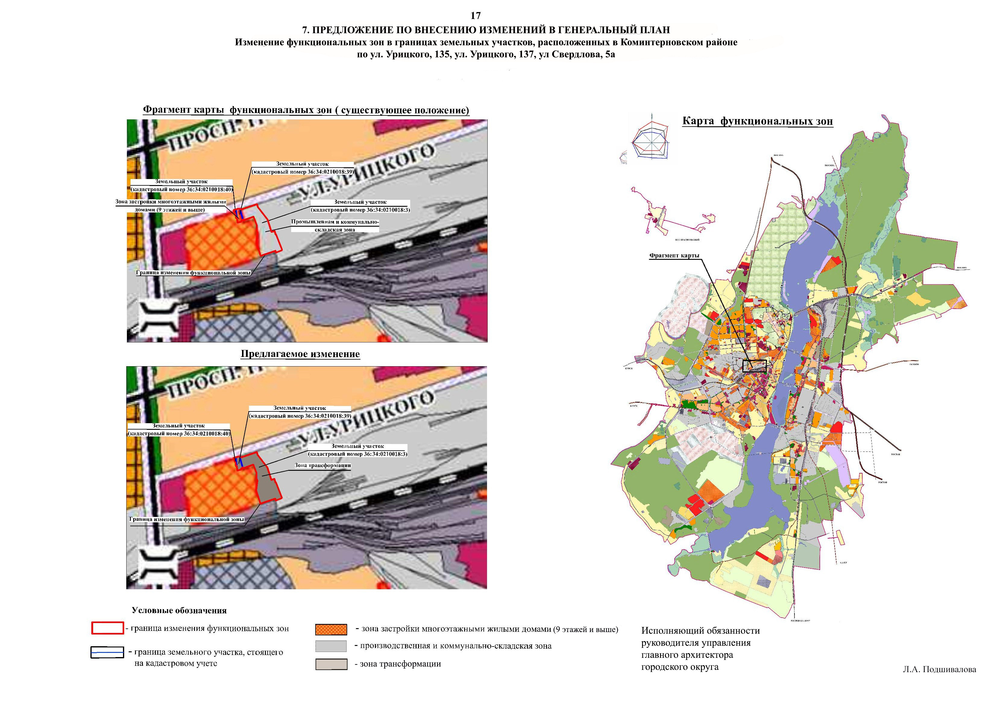 - по проекту внесения изменений в Генеральный план городского округа город Воронеж в части изменения функциональной производственной и коммунально-складской зоны на зону трансформации для земельного участка, расположенного по ул. Свердлова, 5а (кадастровый номер 36:34:0210018:3), а также в части изменения функциональной зоны застройки многоэтажными жилыми домами (9 этажей и выше) на зону трансформации для земельных участков, расположенных по ул. Урицкого, 135 (кадастровый номер 36:34:0210018:39), ул. Урицкого, 137 (кадастровый номер 36:34:0210018:40) (приложение № 1 к настоящему постановлению);