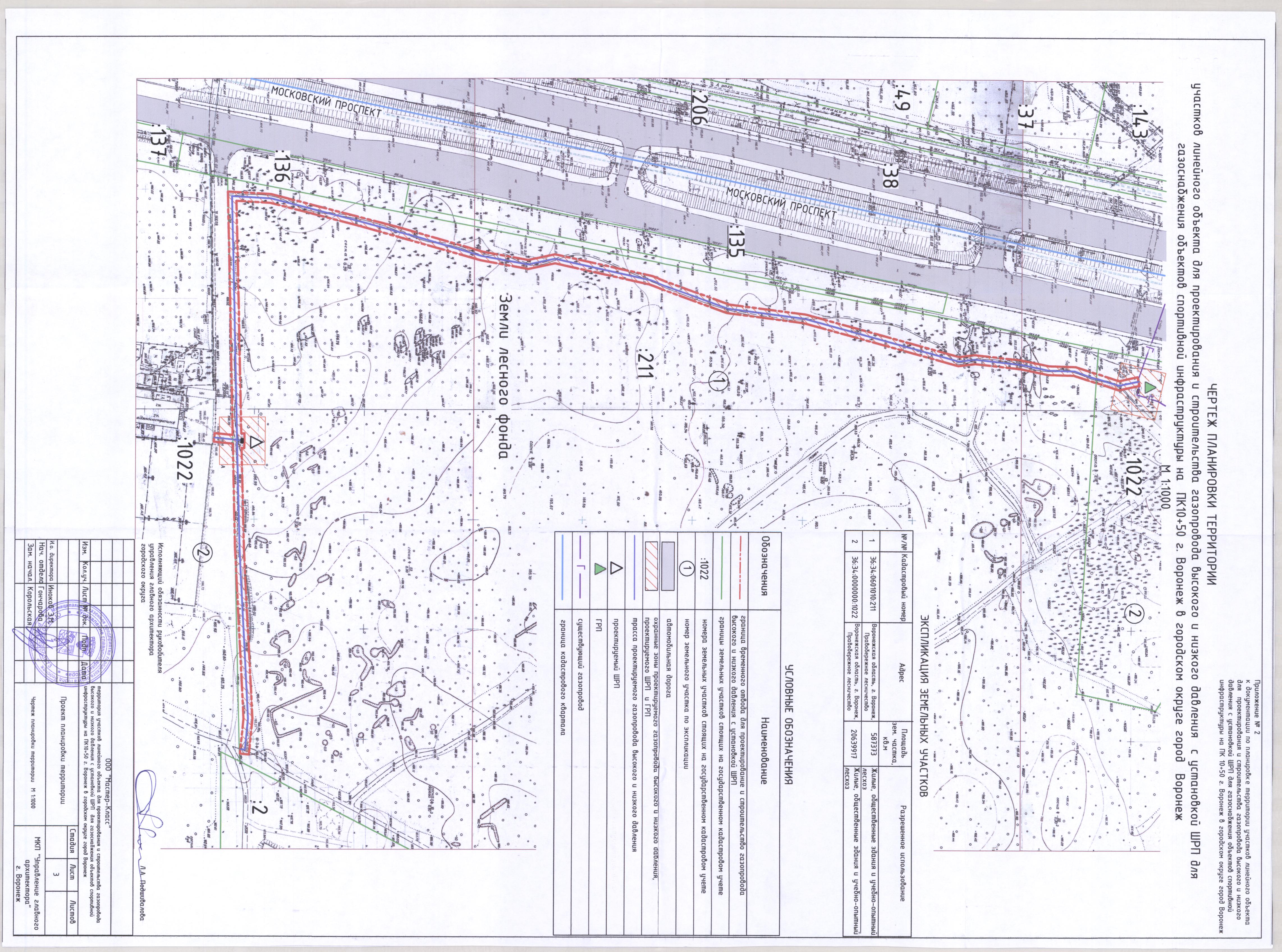 В соответствии с Градостроительным кодексом Российской Федерации, Федеральным законом от 06.10.2003 № 131-ФЗ «Об общих принципах организации местного самоуправления в Российской Федерации», постановлением Воронежской городской Думы от 27.10.2004 № 150-I «Об Уставе городского округа город Воронеж», в целях реализации Генерального плана городского округа город Воронеж, утвержденного решением Воронежской городской Думы от 19.12.2008 № 422-II «Об утверждении Генерального плана городского округа город Воронеж», на основании заявления Открытого акционерного общества «Газпром газораспределение Воронеж» (ИНН 3664000885), в связи с исполнением постановления администрации городского округа город Воронеж от 23.11.2016 № 1018 «О подготовке документации по планировке территории участков линейного объекта для проектирования и строительства газопровода высокого и низкого давления с установкой ШРП для газоснабжения объектов спортивной инфраструктуры на ПК10+50 г. Воронеж в городском округе город Воронеж» администрация городского округа город Воронеж постановляет: