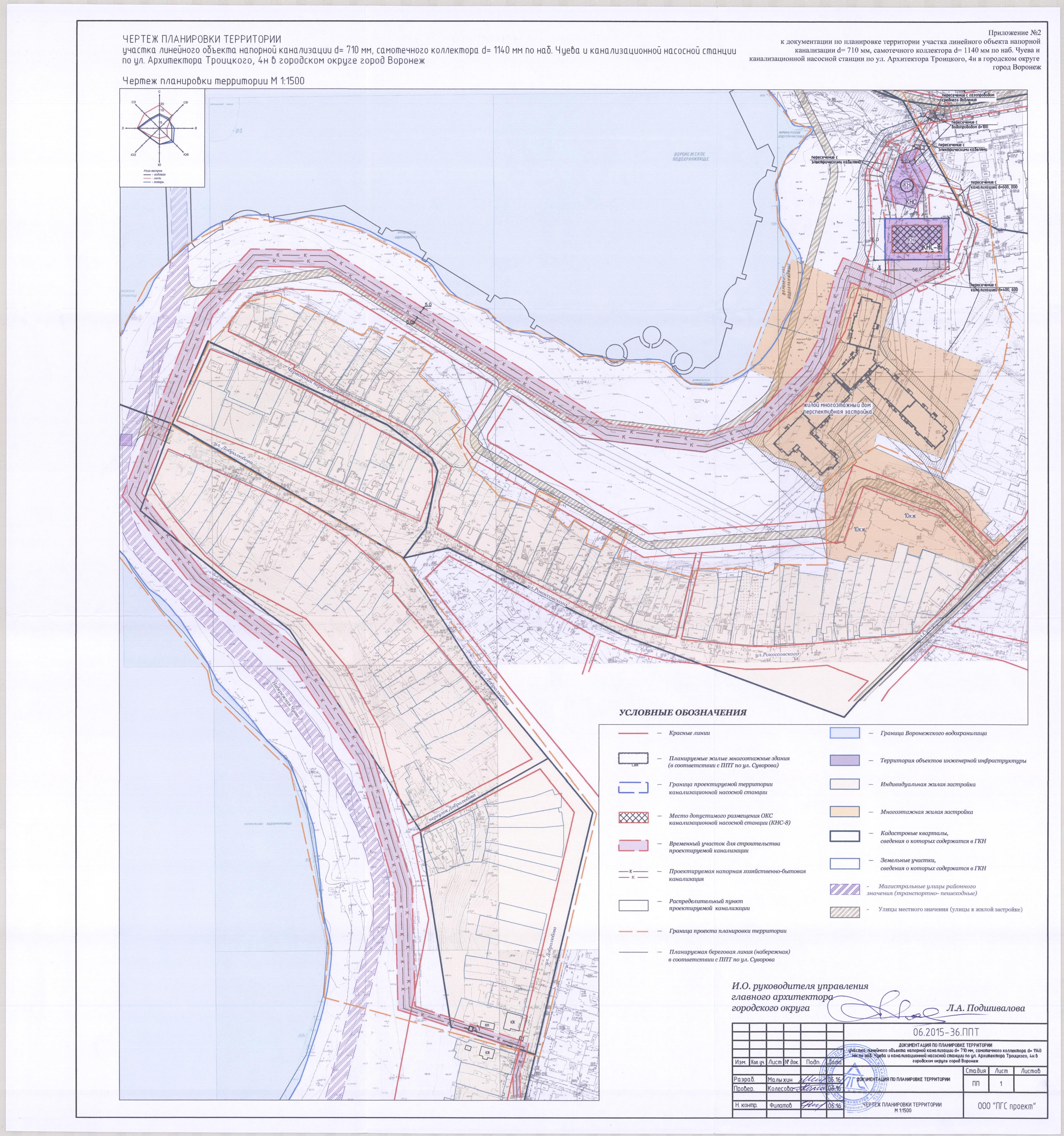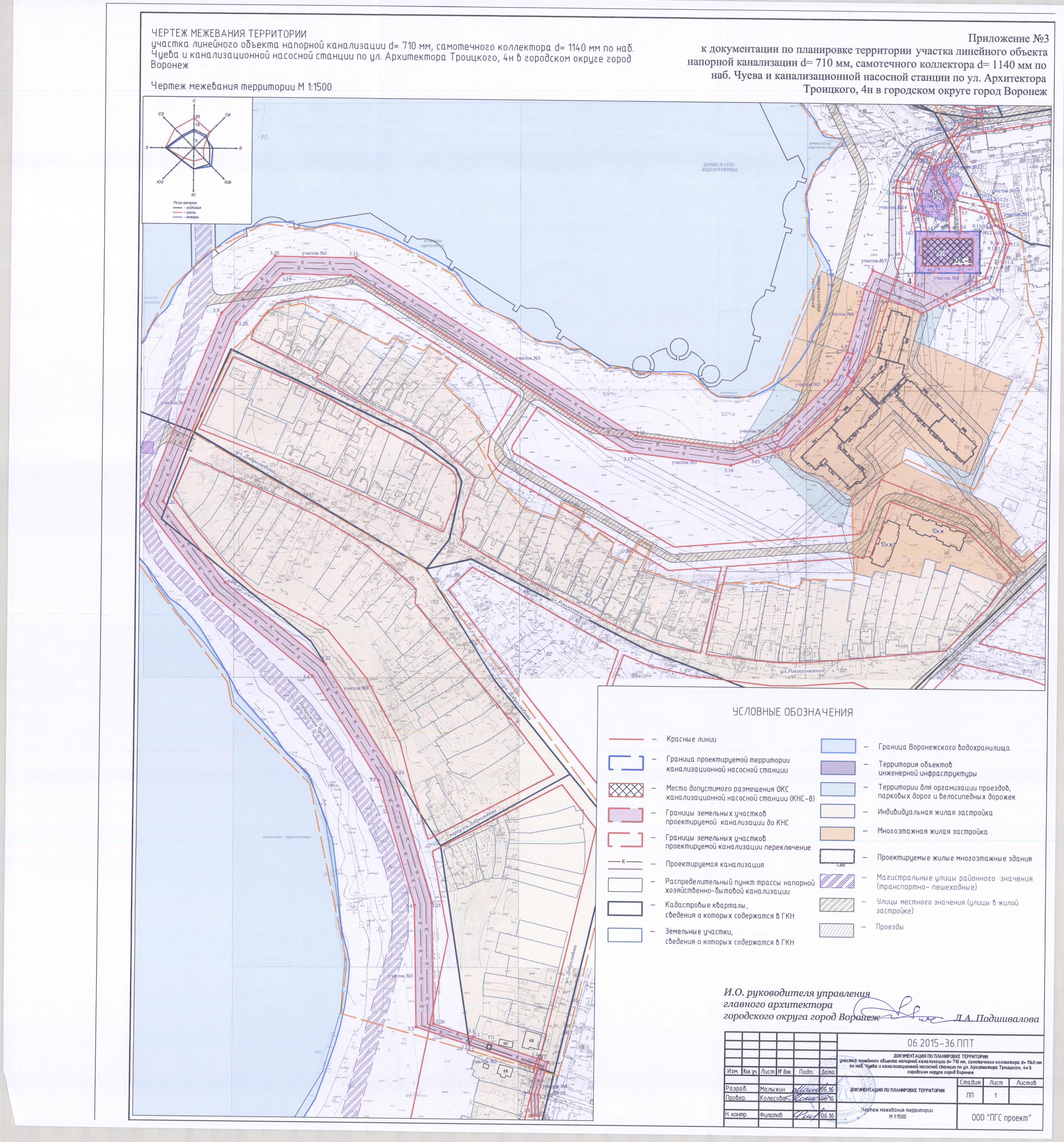 утвердить прилагаемую документацию по планировке территории участка линейного объекта напорной канализации d = 710 мм, самотечного коллектора d = 1140 мм по наб. Чуева и канализационной насосной станции по ул. Архитектора Троицкого, 4н в городском округе город Воронеж.