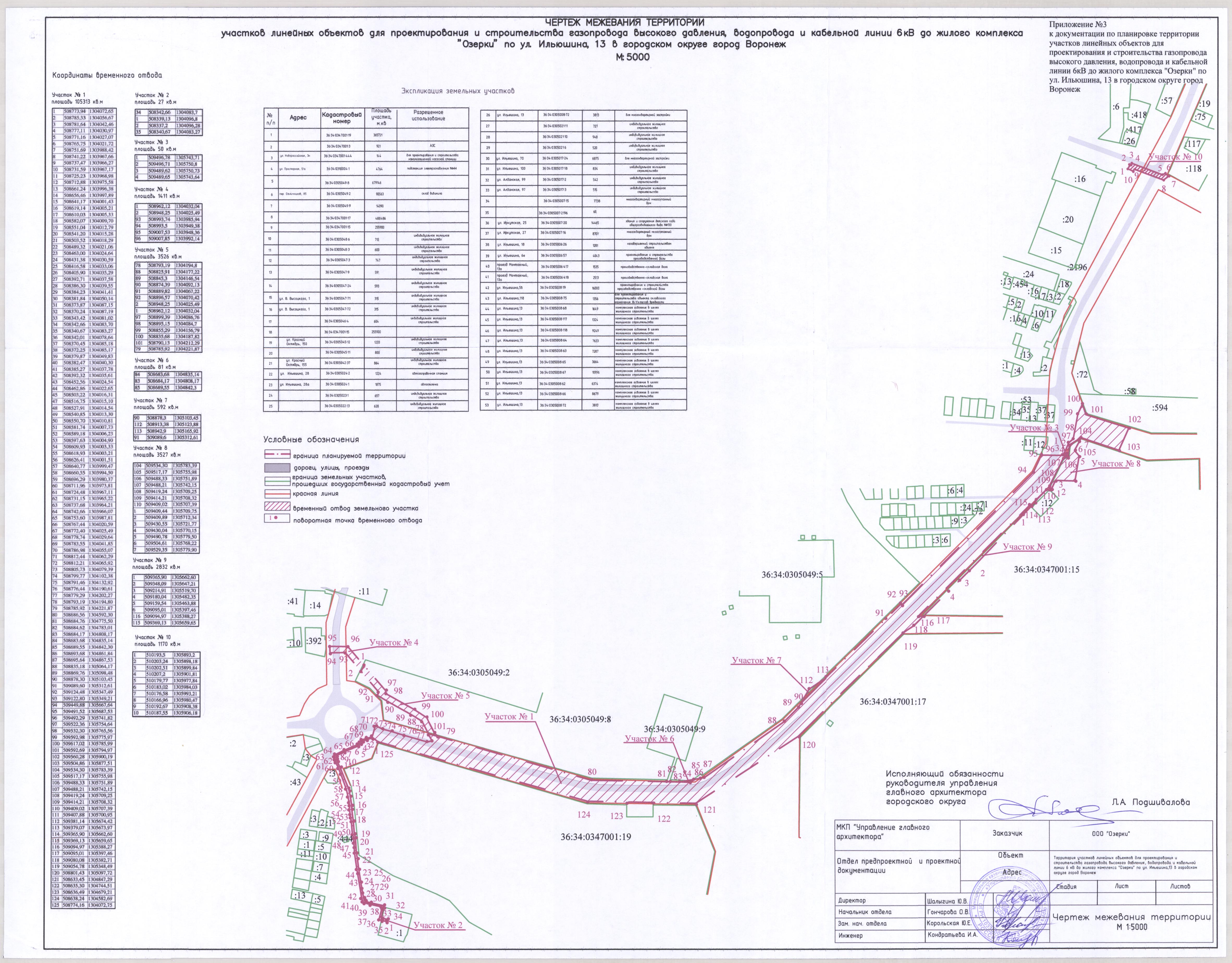 В соответствии с Градостроительным кодексом Российской Федерации, Федеральным законом от 06.10.2003 № 131-ФЗ «Об общих принципах организации местного самоуправления в Российской Федерации», постановлением Воронежской городской Думы от 27.10.2004 № 150-I «Об Уставе городского округа город Воронеж», в целях реализации Генерального плана городского округа город Воронеж, утвержденного решением Воронежской городской Думы от 19.12.2008 № 422-II «Об утверждении Генерального плана городского округа город Воронеж», на основании заявления Общества с ограниченной ответственностью «Озерки» (ИНН 3662178344), в связи с исполнением постановления администрации городского округа город Воронеж от 27.01.2016 № 36 «О подготовке документации по планировке территории участков линейных объектов для проектирования и строительства газопровода высокого давления, водопровода и кабельной линии 6 кВ до жилого комплекса «Озерки» по ул. Ильюшина, 13 в городском округе город Воронеж», с учетом заключения от 17.05.2017 о результатах публичных слушаний по проекту планировки территории и проекту межевания территории, подготовленным в составе документации по планировке территории участков линейных объектов для проектирования и строительства газопровода высокого давления, водопровода и кабельной линии 6 кВ до жилого комплекса «Озерки» по ул. Ильюшина, 13 в городском округе город Воронеж, администрация городского округа город Воронеж постановляет: