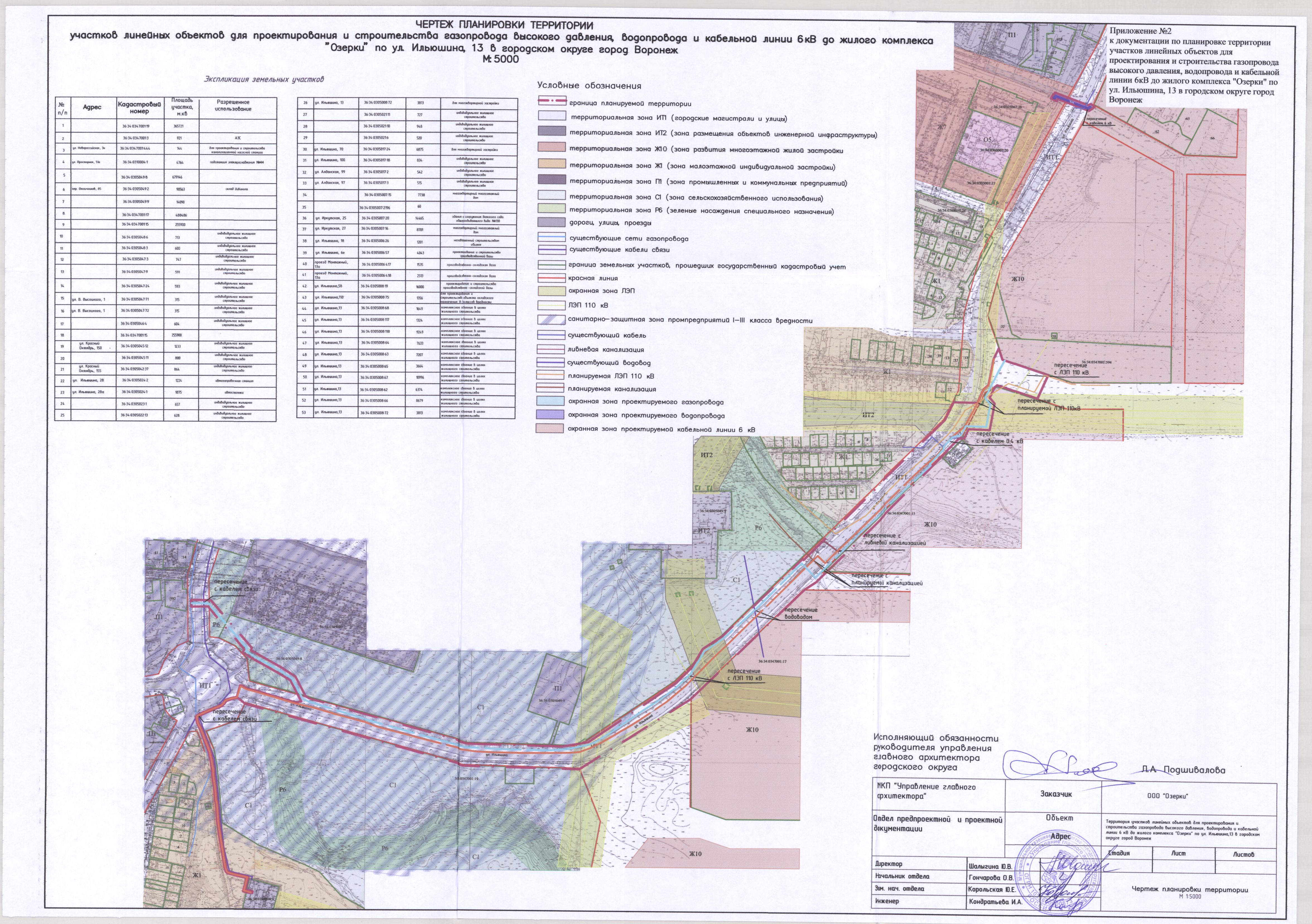 утвердить прилагаемую документацию по планировке территории участков линейных объектов для проектирования и строительства газопровода высокого давления, водопровода и кабельной линии 6 кВ до жилого комплекса «Озерки» по ул. Ильюшина, 13 в городском округе город Воронеж.