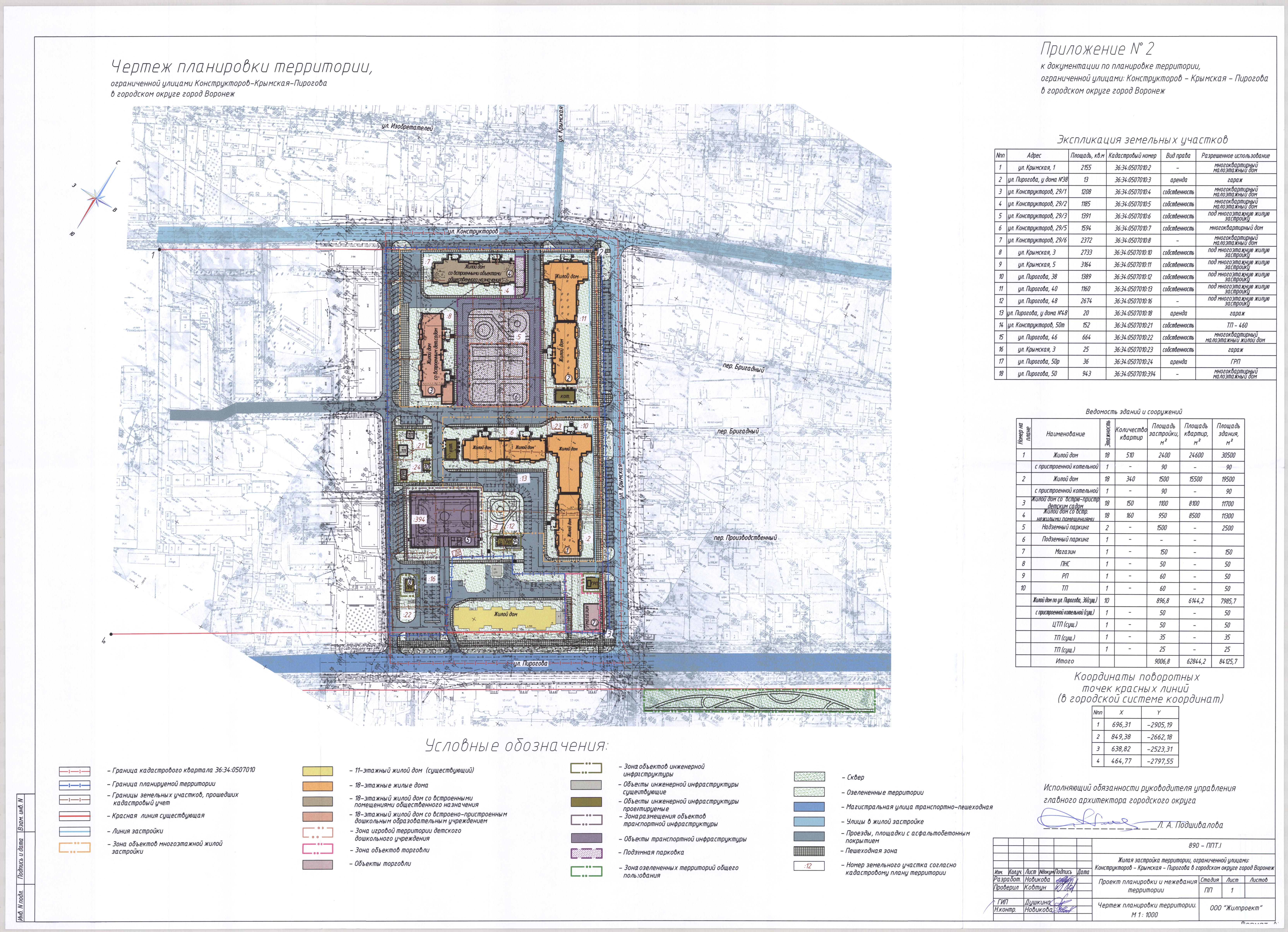 В соответствии с Градостроительным кодексом Российской Федерации, Федеральным законом от 06.10.2003 № 131-ФЗ «Об общих принципах организации местного самоуправления в Российской Федерации», постановлением Воронежской городской Думы от 27.10.2004 № 150-I «Об Уставе городского округа город Воронеж», в целях реализации Генерального плана городского округа город Воронеж, утвержденного решением Воронежской городской Думы от 19.12.2008 № 422-II «Об утверждении Генерального плана городского округа город Воронеж», на основании заявления Общества с ограниченной ответственностью «РемСтрой» (ИНН 3665063221), постановления администрации городского округа город Воронеж от 21.09.2015 № 724 «О развитии застроенной территории, ограниченной улицами Конструкторов – Крымская – Пирогова в городском округе город Воронеж», договора о развитии застроенной территории от 20.11.2015, с учетом заключения от 28.06.2017 о результатах публичных слушаний по проекту планировки территории и проекту межевания территории, подготовленным в составе документации по планировке территории, ограниченной улицами Конструкторов – Крымская – Пирогова в городском округе город Воронеж, администрация городского округа город Воронеж постановляет: