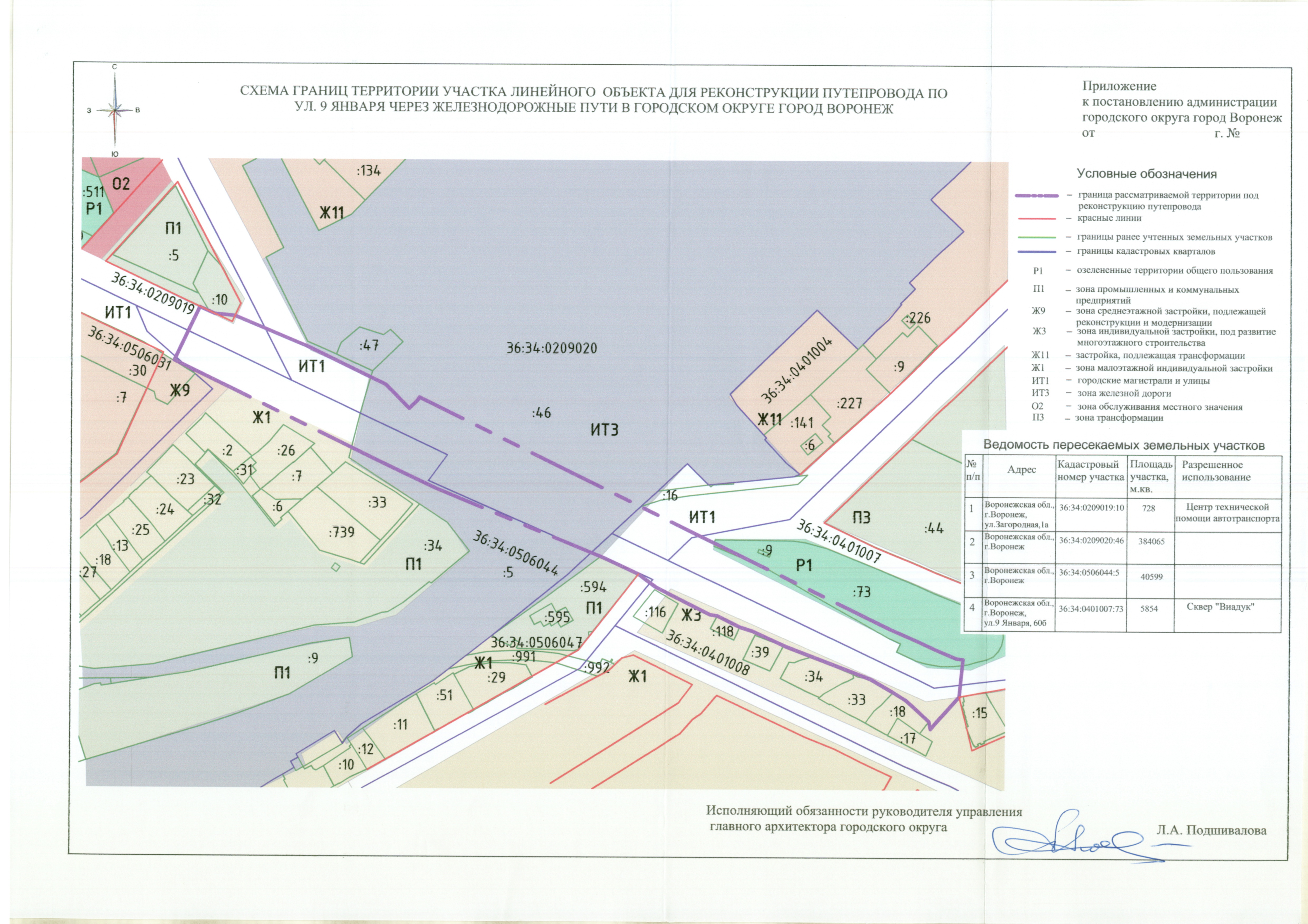 2.1. Подготовить в соответствии с утвержденным заданием документацию по планировке территории участка линейного объекта для реконструкции путепровода по ул. 9 Января через железнодорожные пути в городском округе город Воронеж согласно прилагаемой схеме.