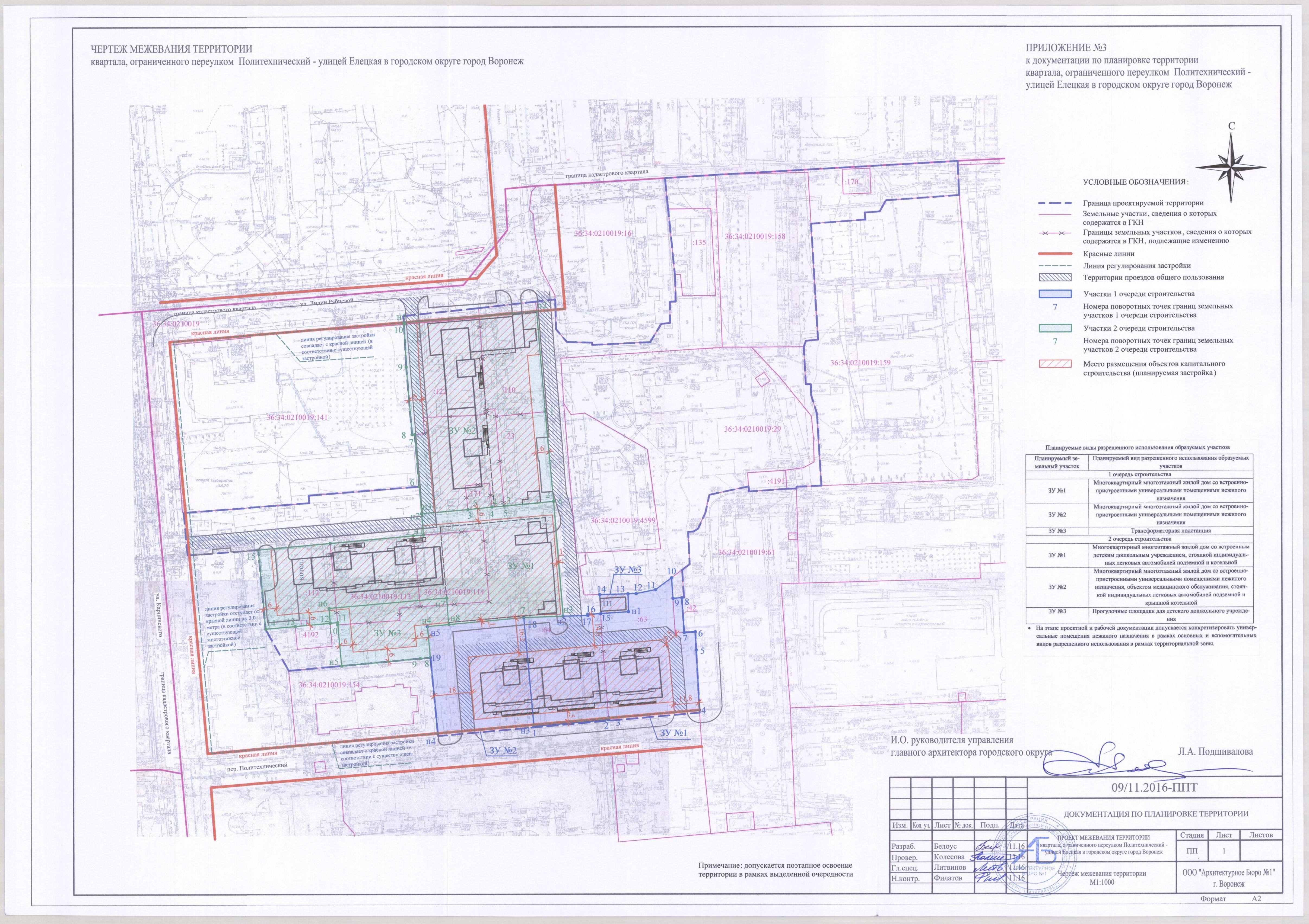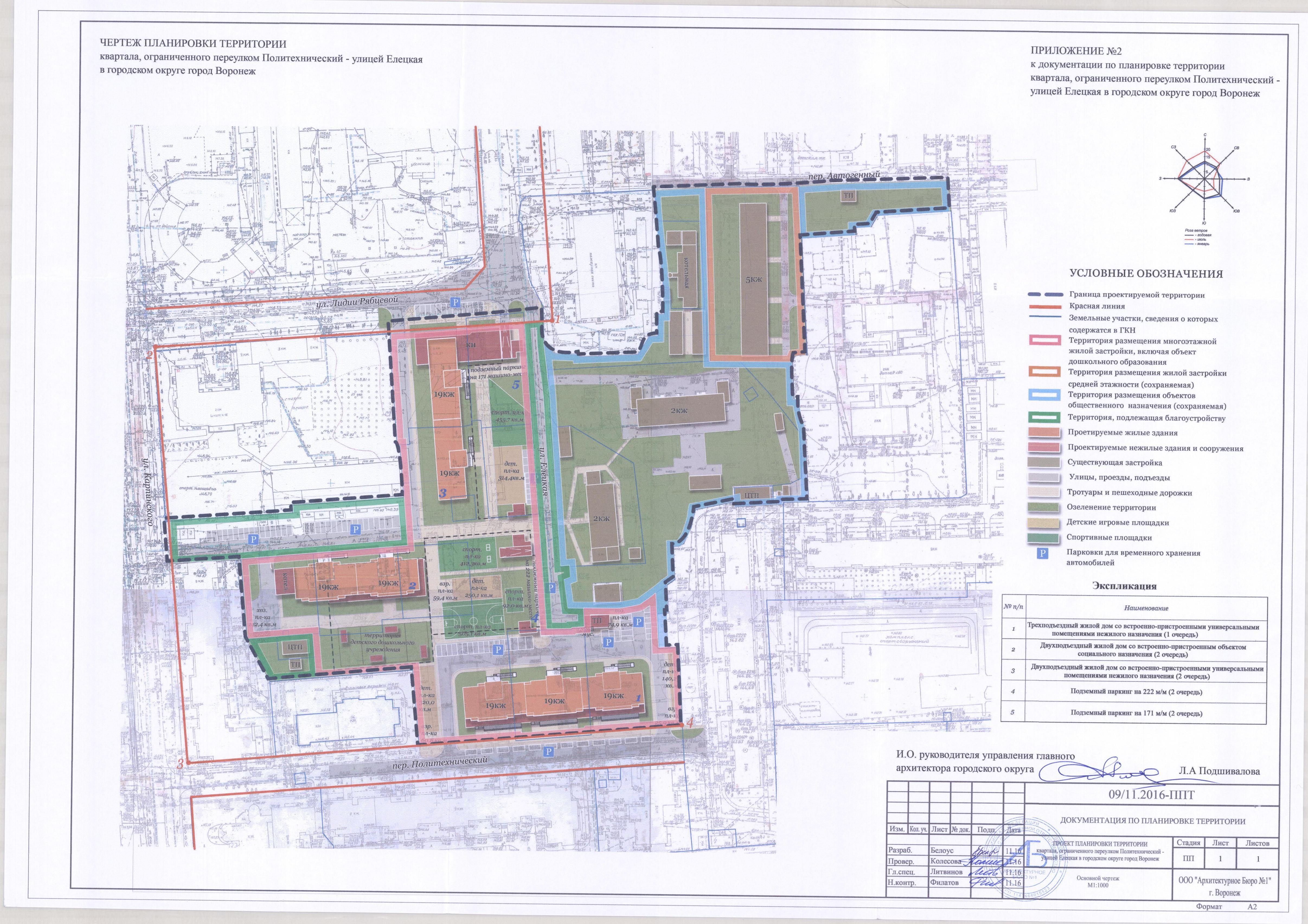 утвердить прилагаемую документацию по планировке территории квартала, ограниченного переулком Политехнический – улицей Елецкая в городском округе город Воронеж.