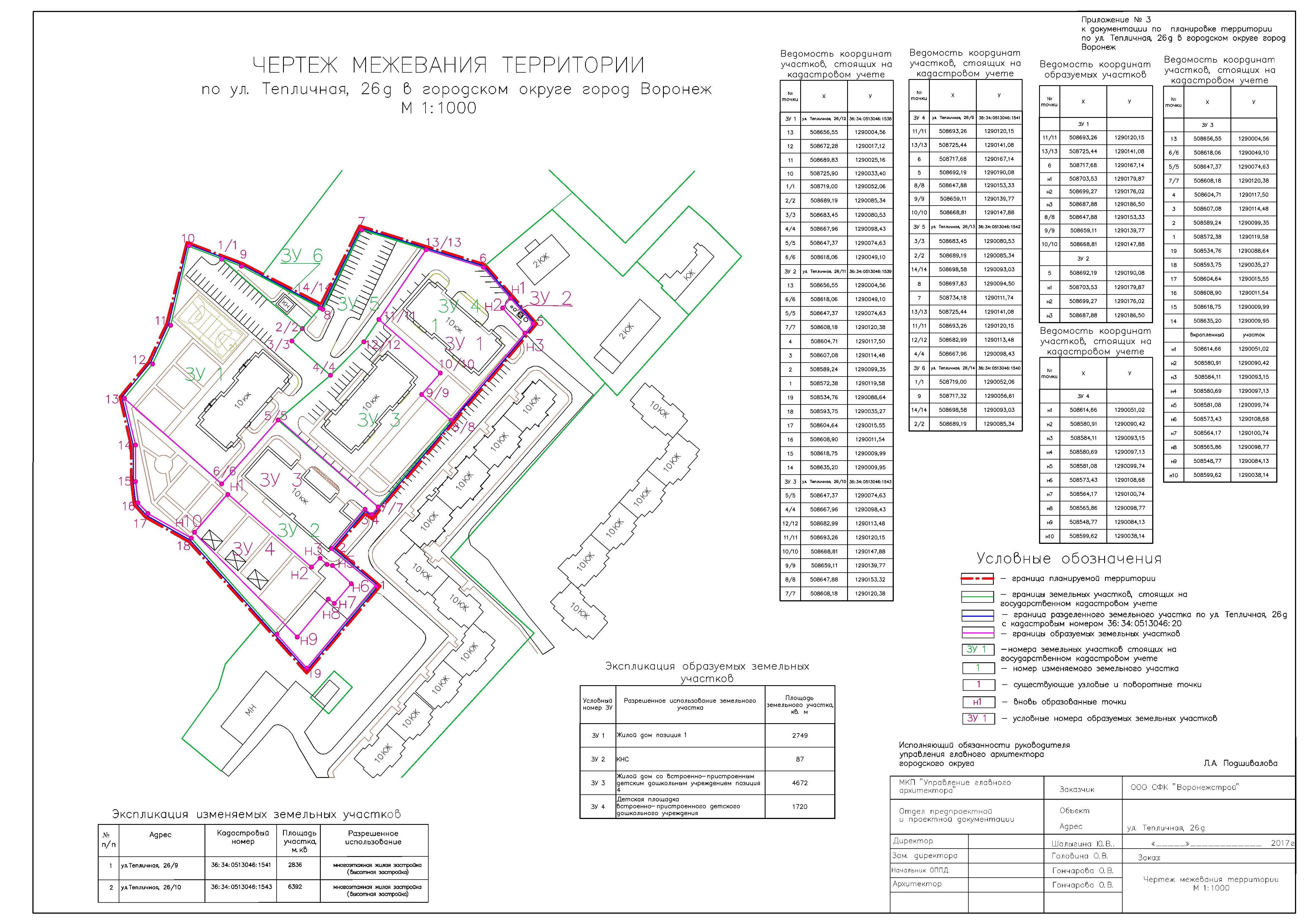 В соответствии с Градостроительным кодексом Российской Федерации, Федеральным законом от 06.10.2003 № 131-ФЗ «Об общих принципах организации местного самоуправления в Российской Федерации», постановлением Воронежской городской Думы от 27.10.2004 № 150-I «Об Уставе городского округа город Воронеж», в целях реализации Генерального плана городского округа город Воронеж, утвержденного решением Воронежской городской Думы от 19.12.2008 № 422-II «Об утверждении Генерального плана городского округа город Воронеж», на основании заявления Общества с ограниченной ответственностью «Строительно-финансовая компания «Воронежстрой» (ИНН 3664051544), в связи с исполнением постановления администрации городского округа город Воронеж от 27.06.2016 № 595 «О подготовке документации по планировке территории по ул. Тепличная, 26д городском округе город Воронеж», с учетом заключения от 19.04.2017 о результатах публичных слушаний по проекту планировки территории и проекту межевания территории, подготовленным в составе документации по планировке территории по ул. Тепличная, 26д в городском округе город Воронеж, администрация городского округа город Воронеж постановляет: