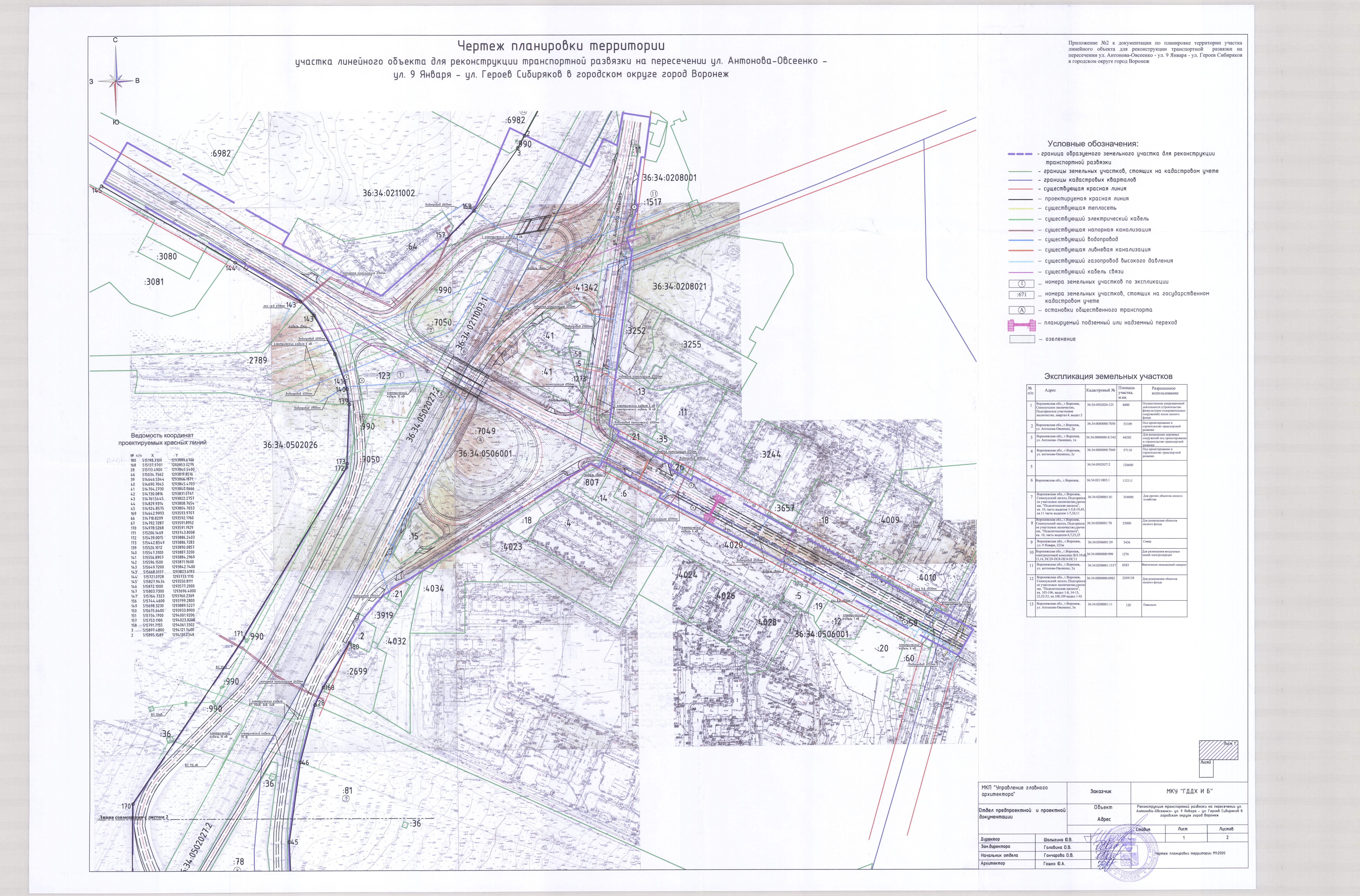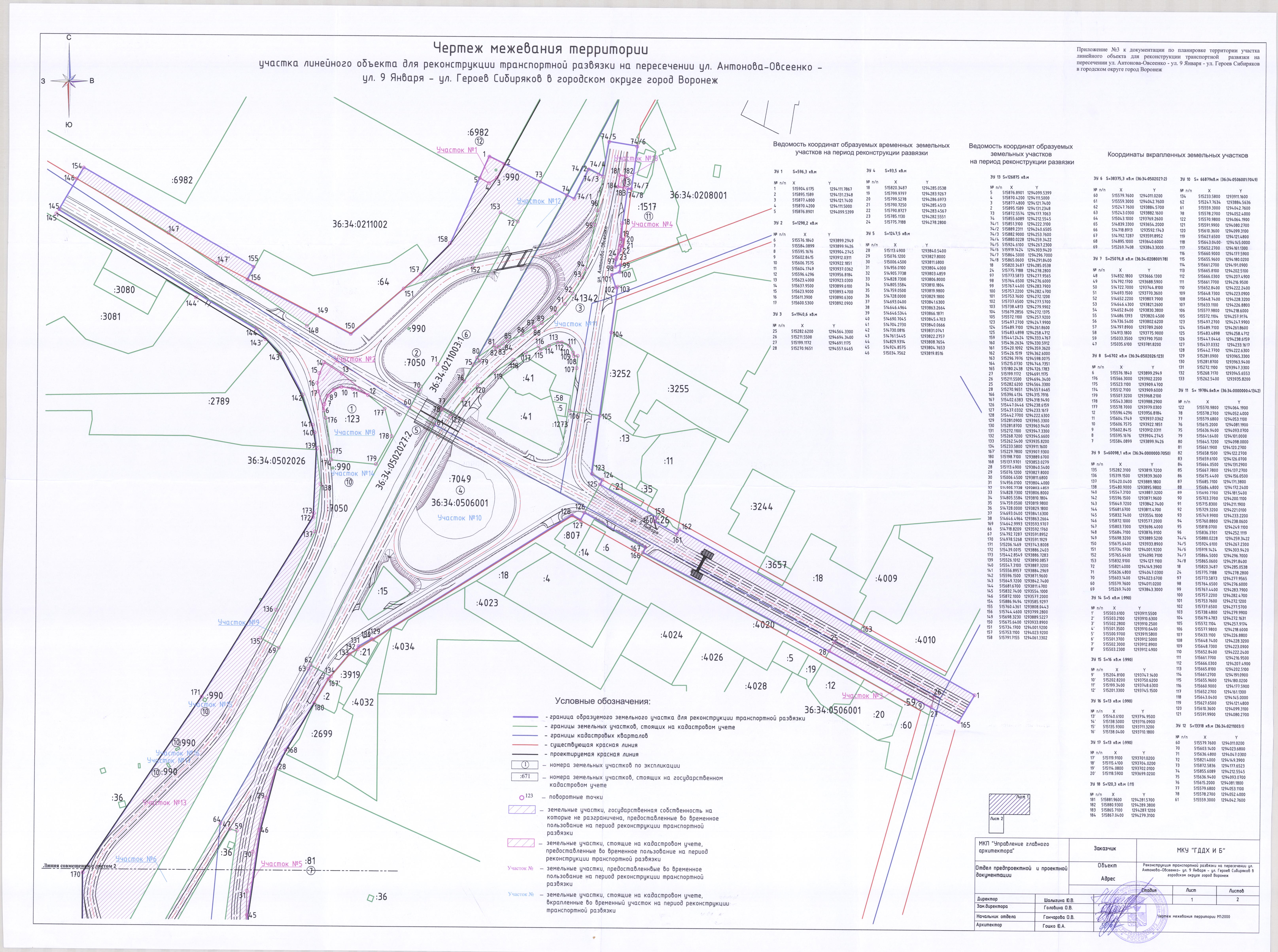 В соответствии с Градостроительным кодексом Российской Федерации, Федеральным законом от 06.10.2003 № 131-ФЗ «Об общих принципах организации местного самоуправления в Российской Федерации», постановлением Воронежской городской Думы от 27.10.2004 № 150-I «Об Уставе городского округа город Воронеж», в целях реализации Генерального плана городского округа город Воронеж, утвержденного решением Воронежской городской Думы от 19.12.2008 № 422-II «Об утверждении Генерального плана городского округа город Воронеж», на основании заявления муниципального казенного учреждения городского округа город Воронеж «Городская дирекция дорожного хозяйства и благоустройства» (ИНН 3666154383), в связи с исполнением постановления администрации городского округа город Воронеж от 18.08.2017 № 455 «О подготовке документации по планировке территории участка линейного объекта для реконструкции транспортной развязки на пересечении ул. Антонова-Овсеенко – ул. 9 Января – ул. Героев Сибиряков в городском округе город Воронеж», с учетом заключения от 20.11.2017 о результатах публичных слушаний по проекту планировки территории и проекту межевания территории, подготовленным в составе документации по планировке территории участка линейного объекта для реконструкции транспортной развязки на пересечении ул. Антонова-Овсеенко – ул. 9 Января – ул. Героев Сибиряков в городском округе город Воронеж, администрация городского округа город Воронеж постановляет: