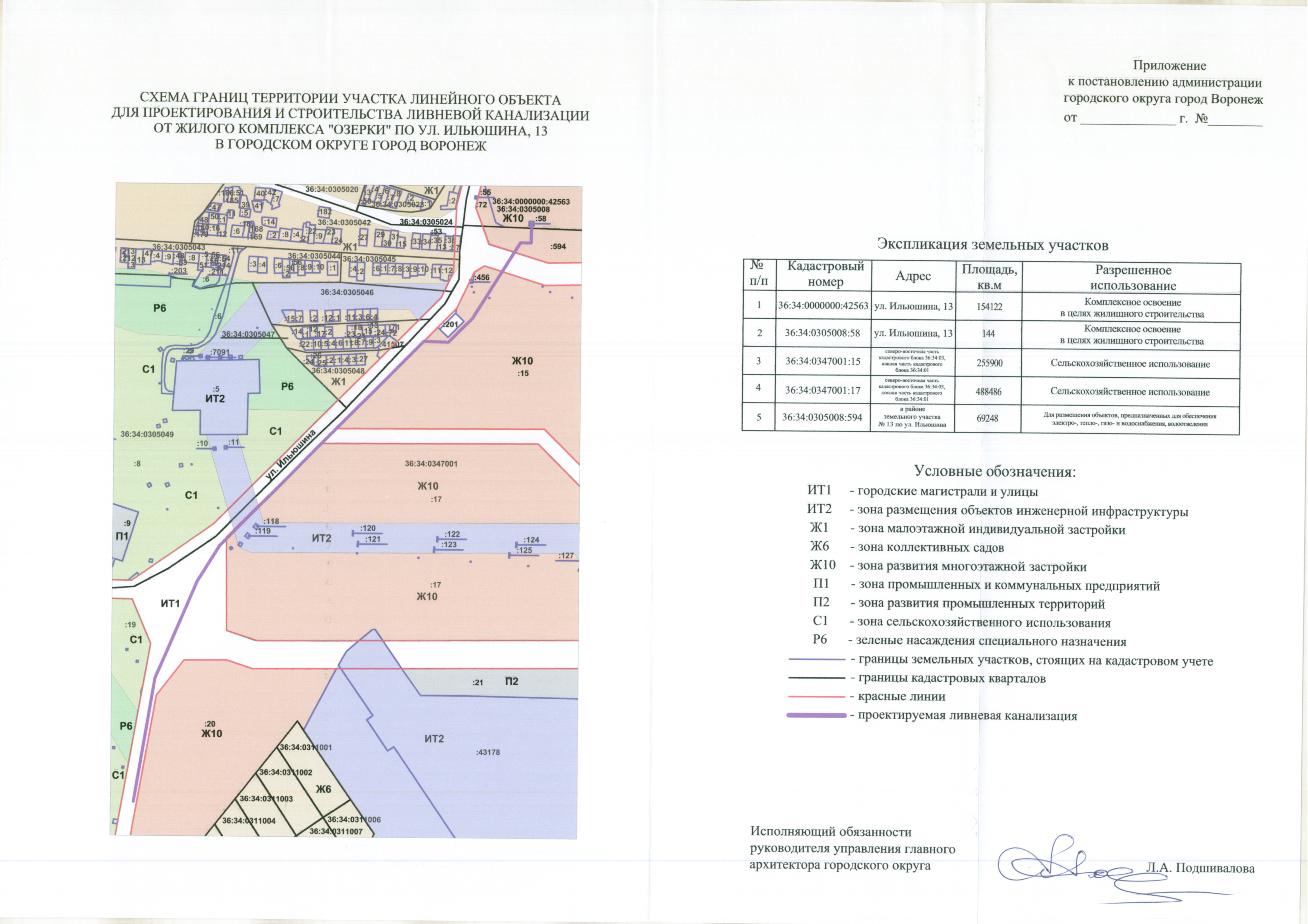 2.1. Подготовить в соответствии с утвержденным заданием документацию по планировке территории участка линейного объекта для проектирования и строительства ливневой канализации от жилого комплекса «Озерки» по ул. Ильюшина, 13 в городском округе город Воронеж согласно прилагаемой схеме.