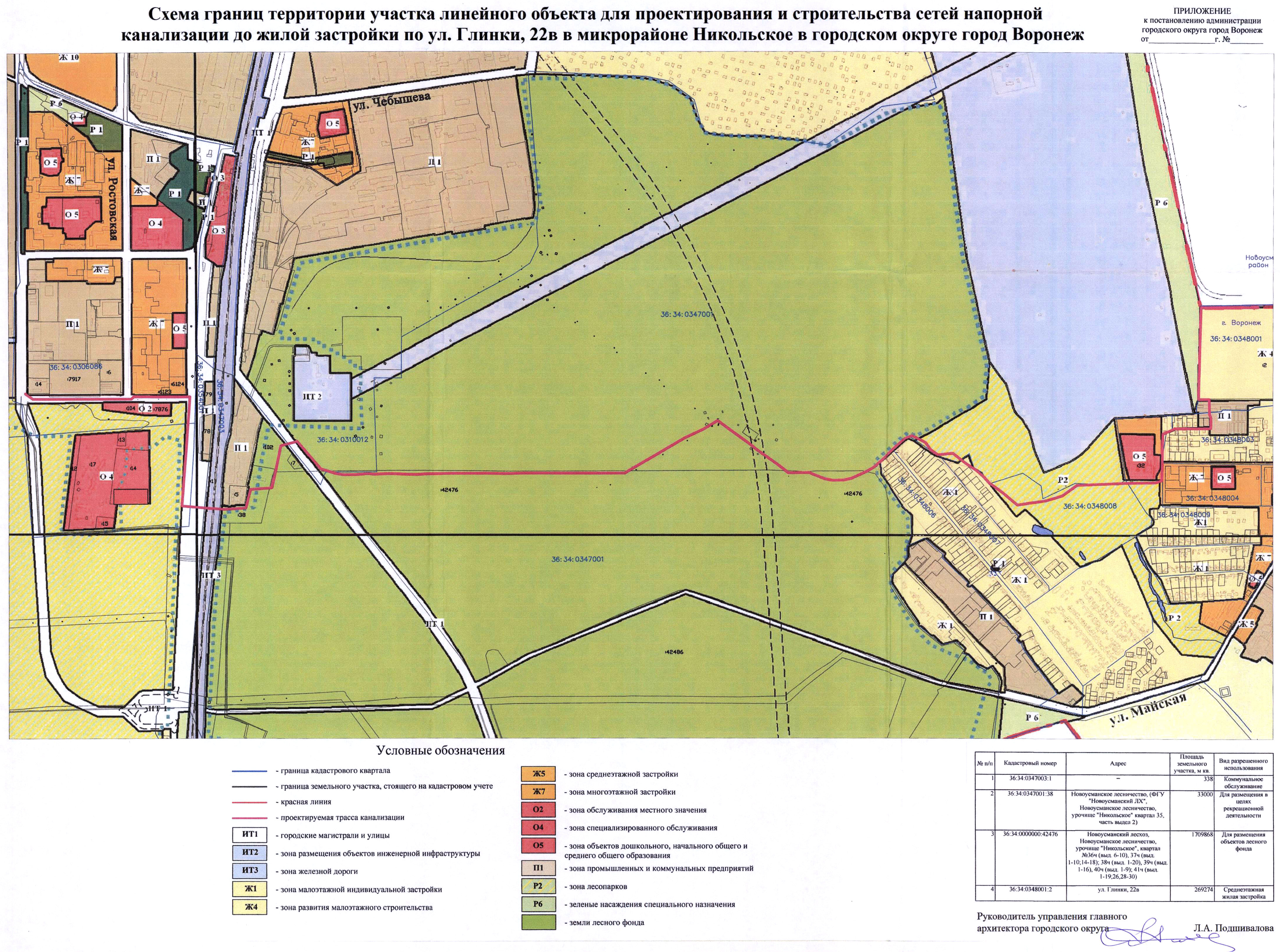 2.1. Подготовить в соответствии с утвержденным заданием документацию по планировке территории участка линейного объекта для проектирования и строительства сетей напорной канализации до жилой застройки по ул. Глинки, 22в в микрорайоне Никольское в городском округе город Воронеж, согласно прилагаемой схеме.