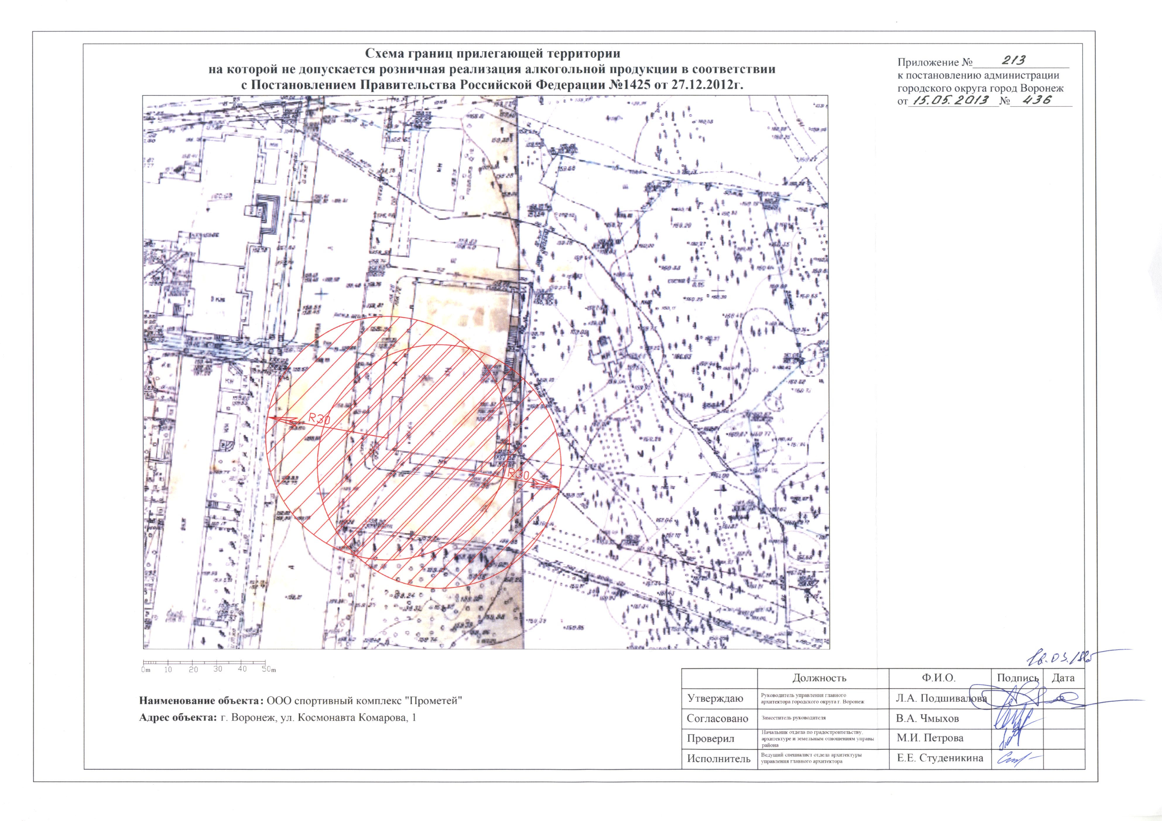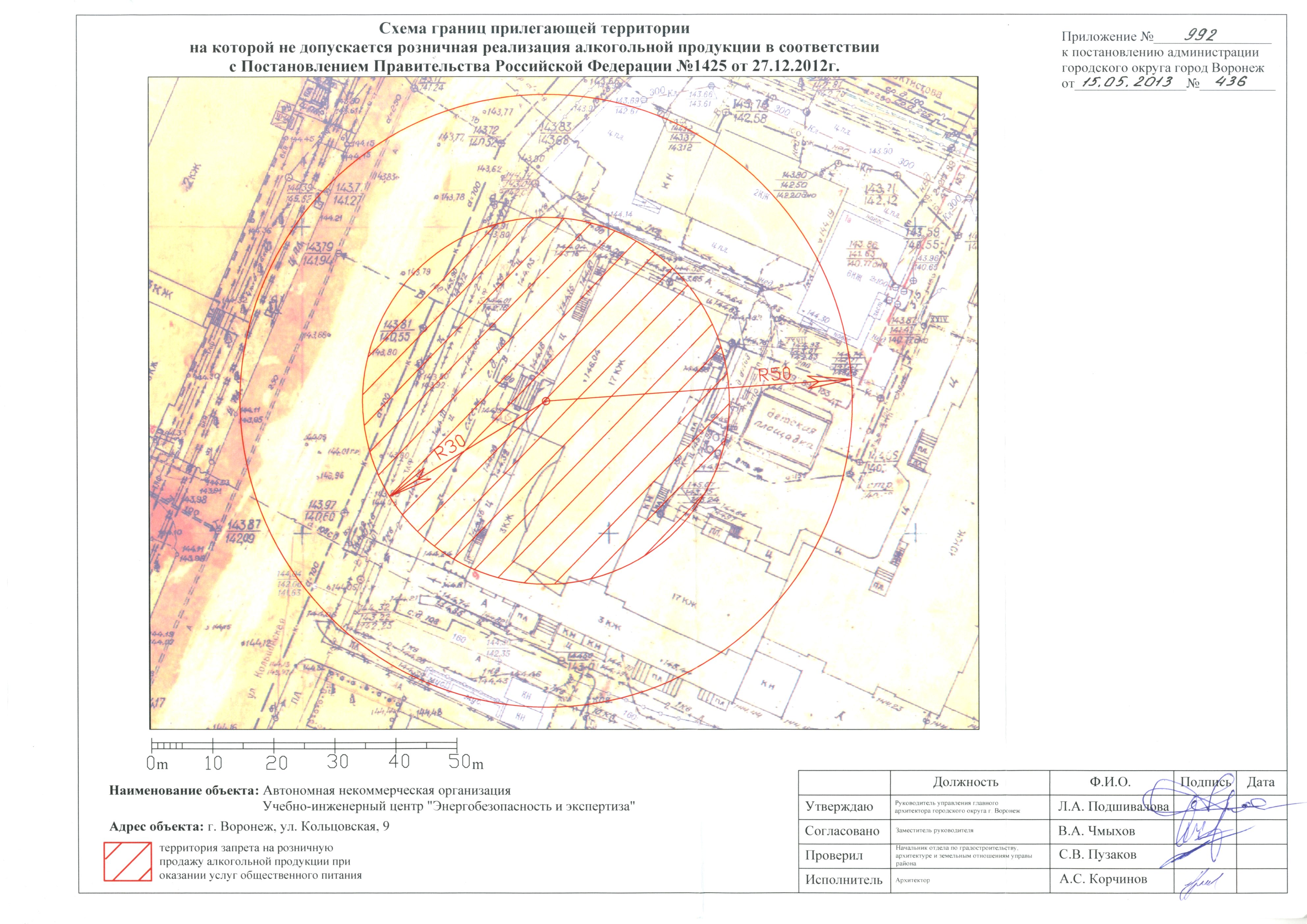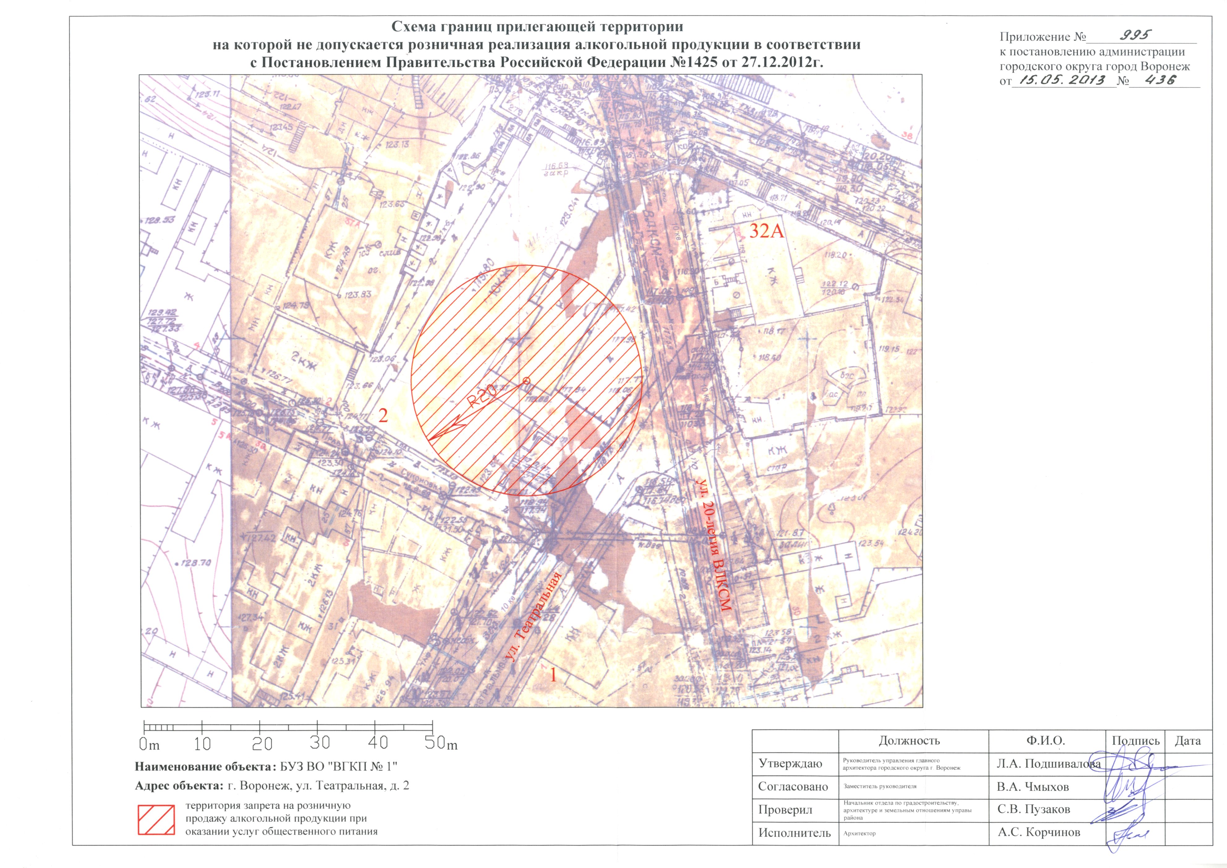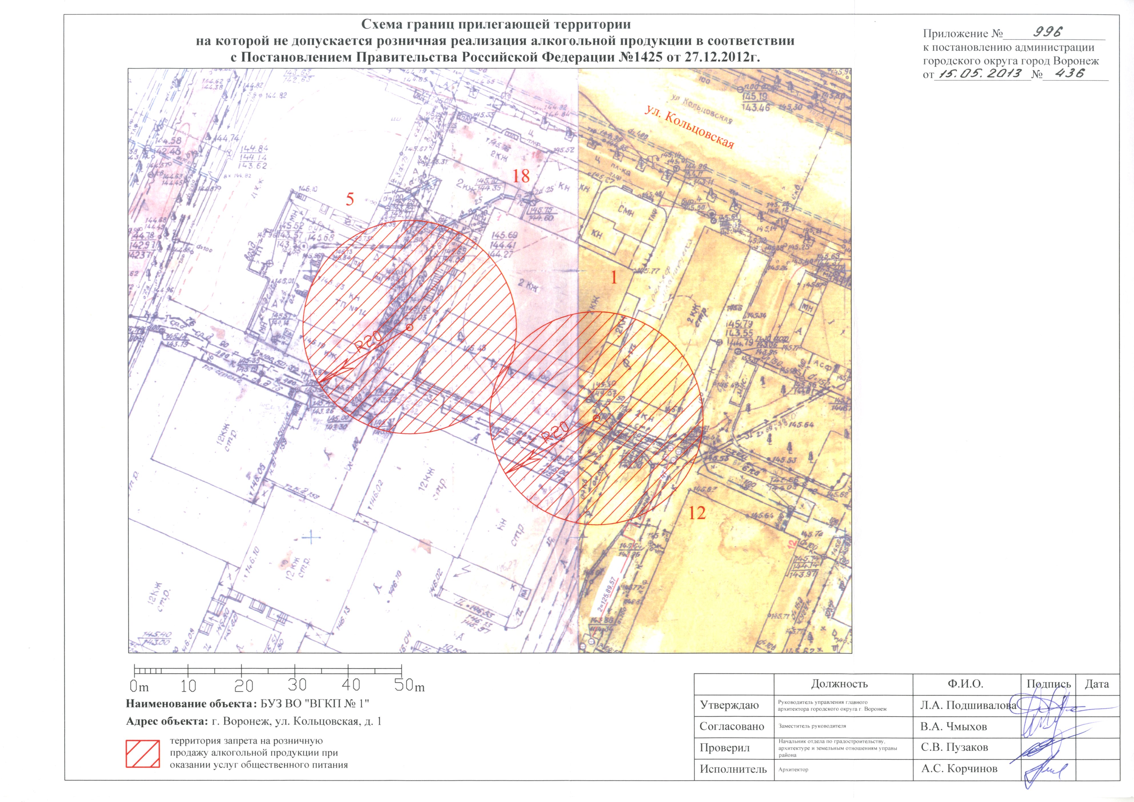 Во исполнение статьи 16 Федерального закона от 22.11.1995 № 171-ФЗ «О государственном регулировании производства и оборота этилового спирта, алкогольной и спиртосодержащей продукции и об ограничении потребления (распития) алкогольной продукции», в соответствии с постановлением Правительства Российской Федерации от 27.12.2012 № 1425 «Об определении органами государственной власти субъектов Российской Федерации мест массового скопления граждан и мест нахождения источников повышенной опасности, в которых не допускается розничная продажа алкогольной продукции, а также определении органами местного самоуправления границ прилегающих к некоторым организациям и объектам территорий, на которых не допускается розничная продажа алкогольной продукции», постановлением администрации городского округа город Воронеж от 14.05.2013 № 433 «Об утверждении минимального значения расстояния от организаций и объектов, в которых не допускается розничная продажа алкогольной продукции, до границ прилегающих к ним территорий» администрация городского округа город Воронеж постановляет: