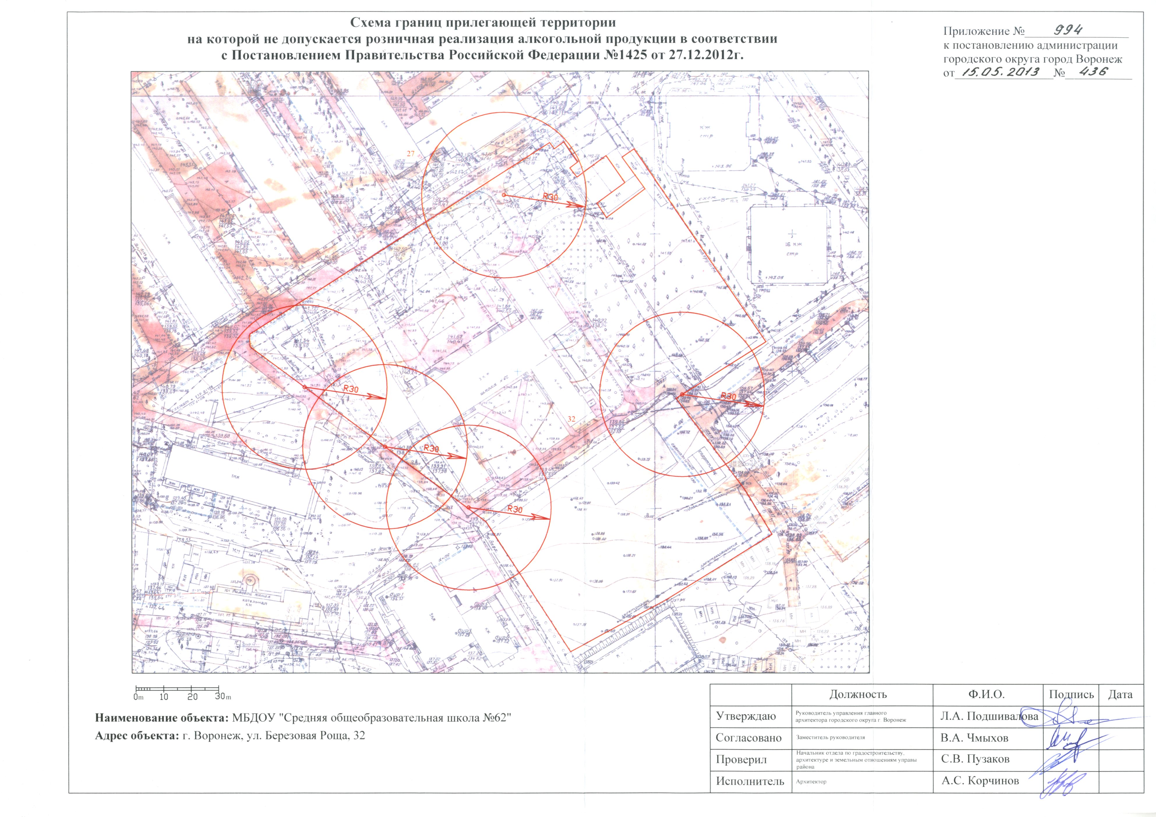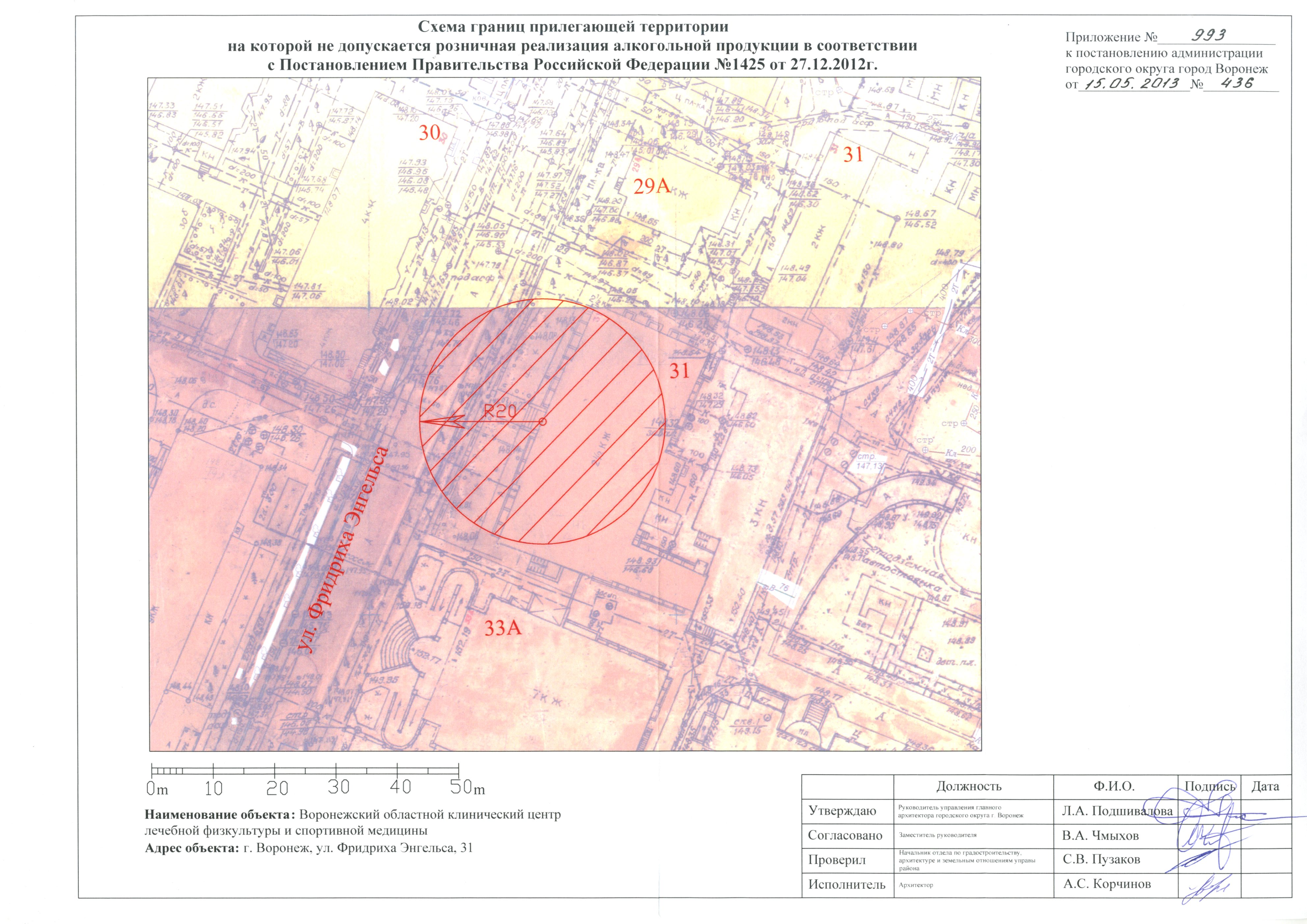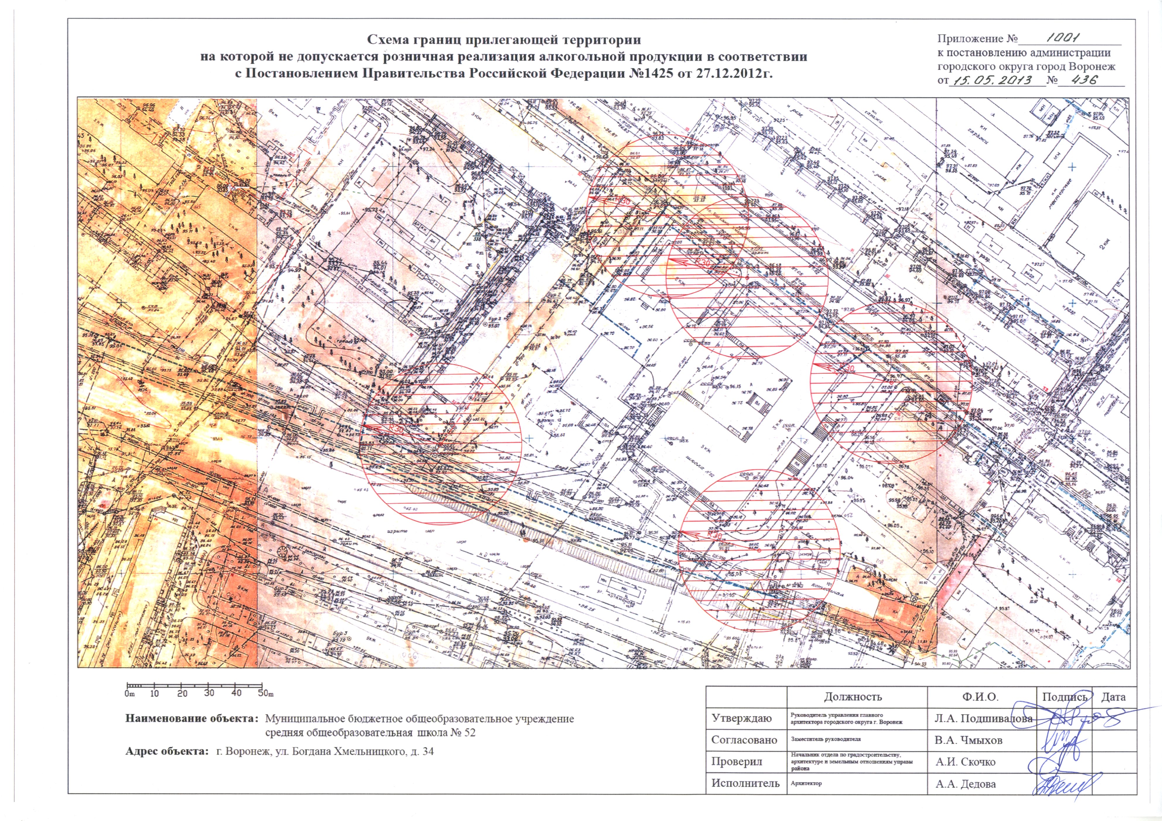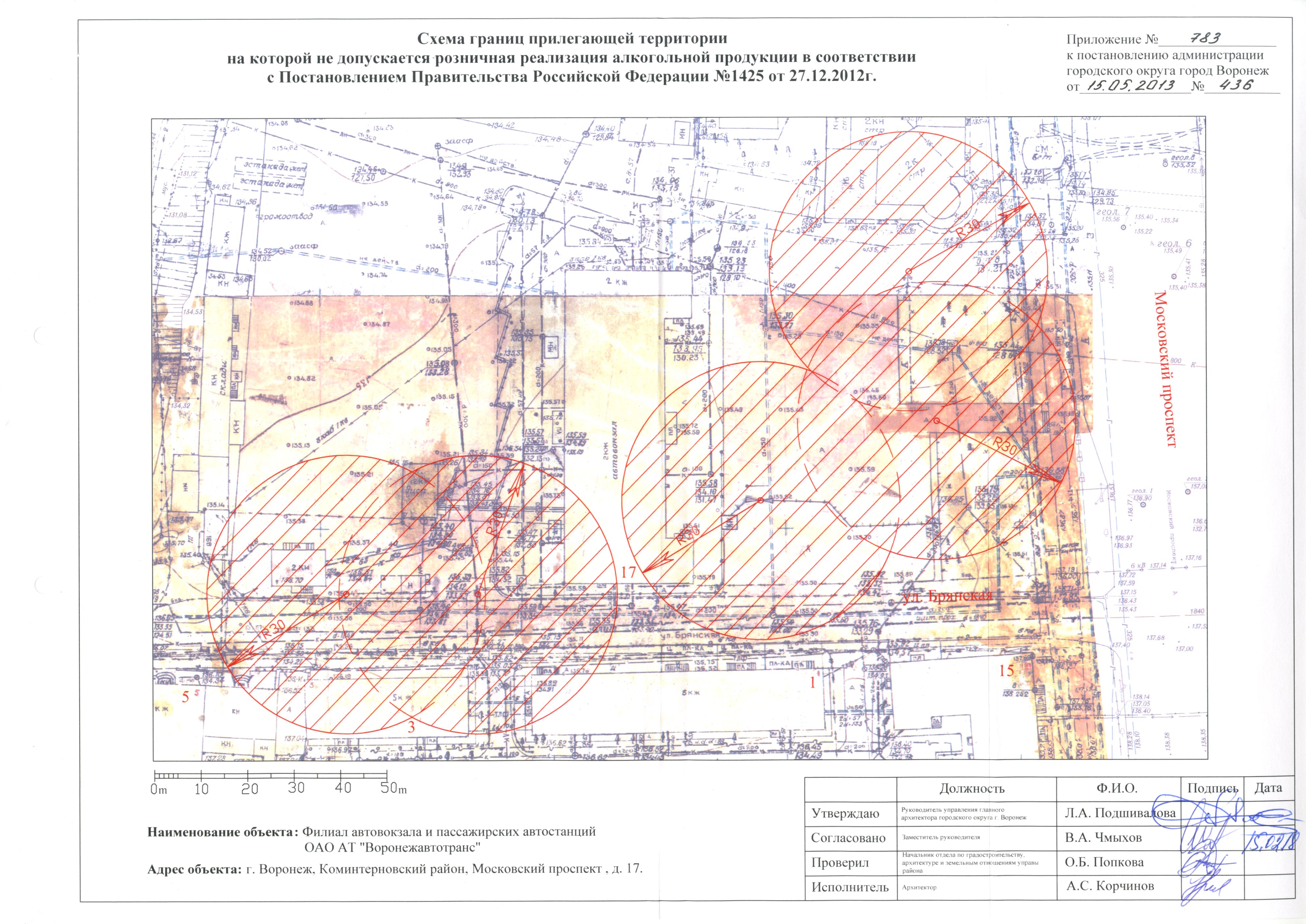 Во исполнение статьи 16 Федерального закона от 22.11.1995 № 171-ФЗ «О государственном регулировании производства и оборота этилового спирта, алкогольной и спиртосодержащей продукции и об ограничении потребления (распития) алкогольной продукции», в соответствии с постановлением Правительства Российской Федерации от 27.12.2012 № 1425 «Об определении органами государственной власти субъектов Российской Федерации мест массового скопления граждан и мест нахождения источников повышенной опасности, в которых не допускается розничная продажа алкогольной продукции, а также определении органами местного самоуправления границ прилегающих к некоторым организациям и объектам территорий, на которых не допускается розничная продажа алкогольной продукции», постановлением администрации городского округа город Воронеж от 14.05.2013 № 433 «Об утверждении минимального значения расстояния от организаций и объектов, в которых не допускается розничная продажа алкогольной продукции, до границ прилегающих к ним территорий» администрация городского округа город Воронеж постановляет: