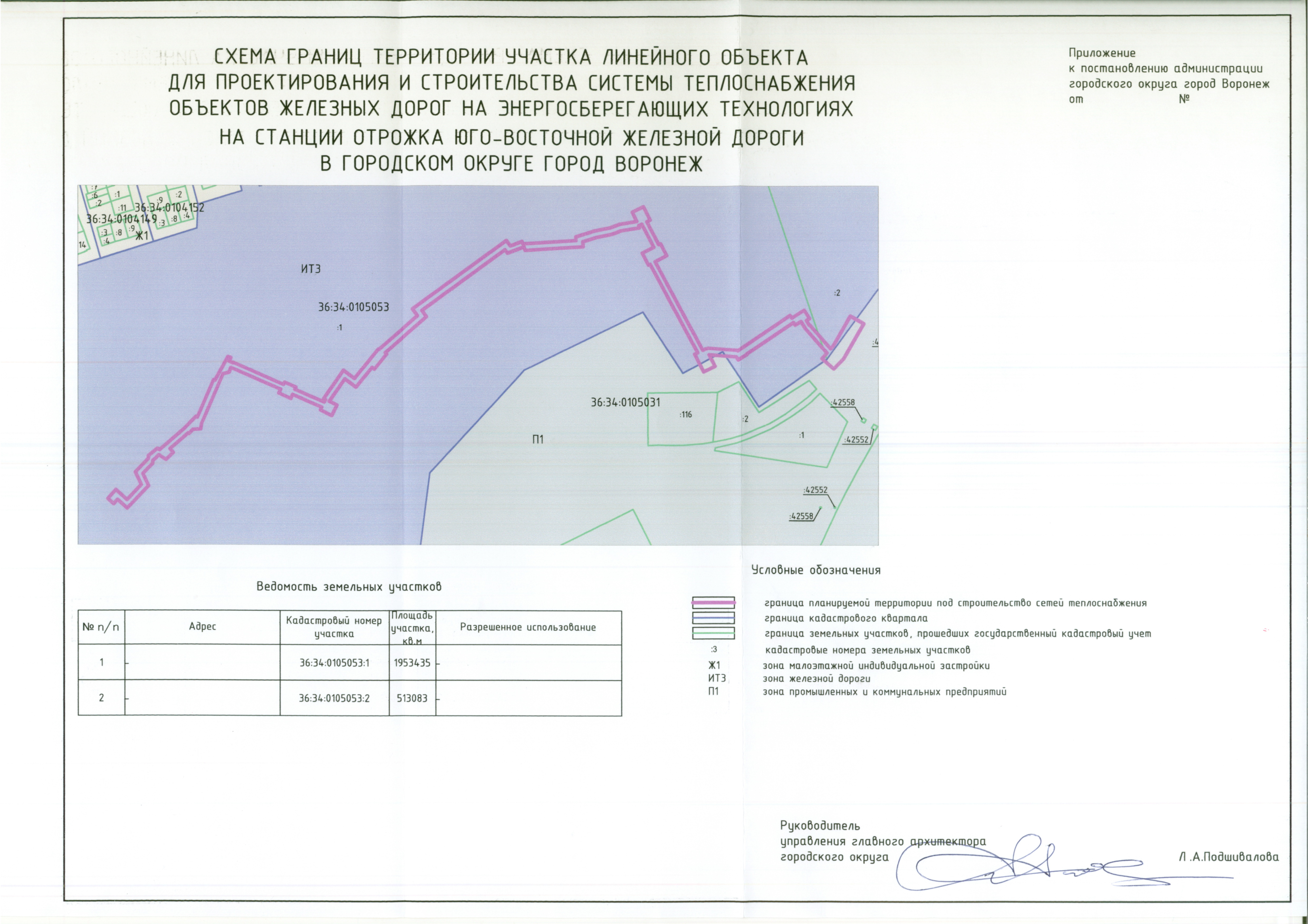2.1. Подготовить в соответствии с утвержденным заданием документацию по планировке территории участка линейного объекта для проектирования и строительства системы теплоснабжения объектов железных дорог на энергосберегающих технологиях на станции Отрожка Юго-Восточной железной дороги в городском округе город Воронеж согласно прилагаемой схеме.