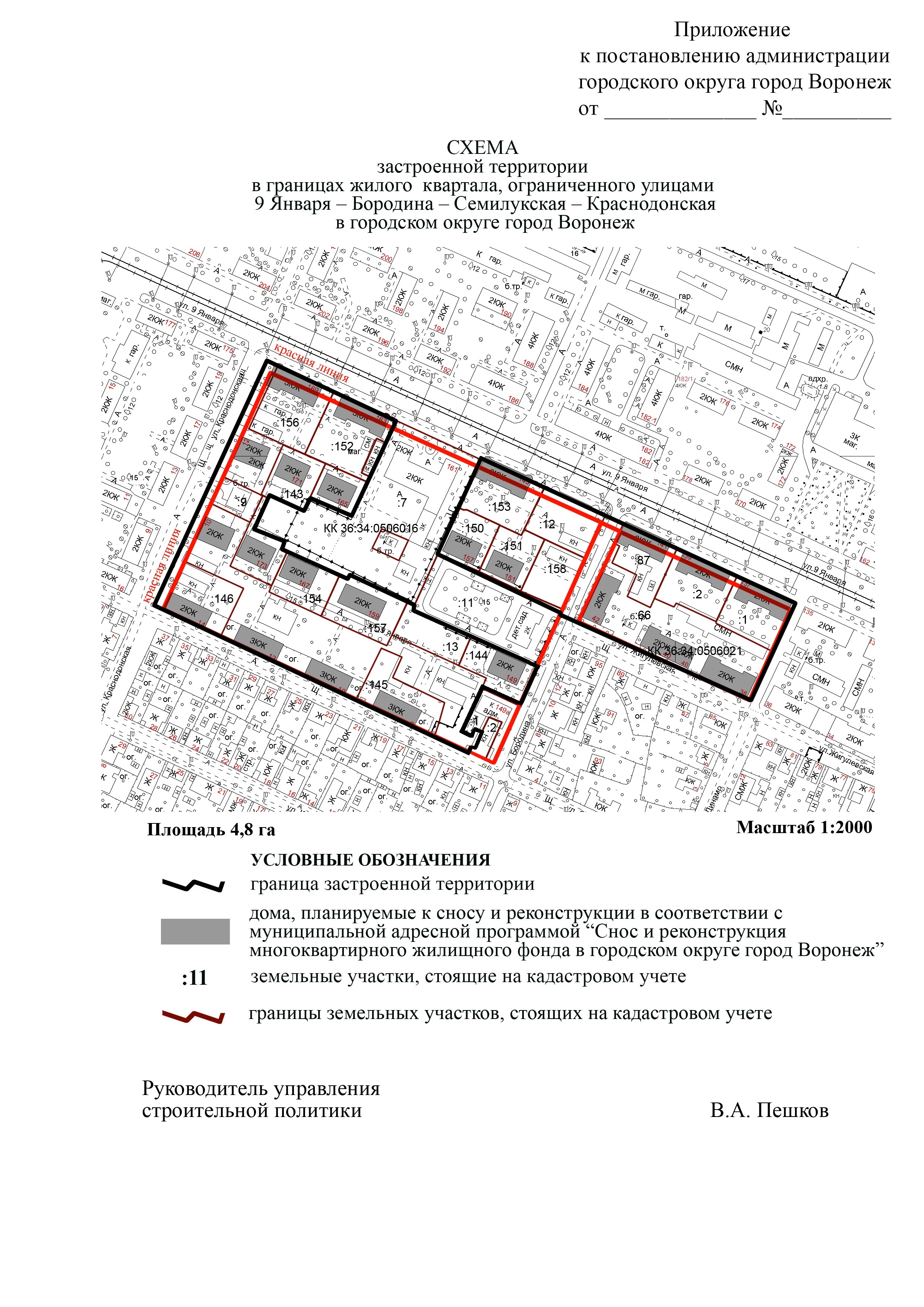 1. Принять решение о развитии застроенной территории жилого квартала, ограниченного улицами 9 Января – Бородина – Семилукская – Краснодонская в городском округе город Воронеж, ориентировочной площадью 4,8 га согласно схеме (приложение к настоящему постановлению) в соответствии с градостроительным регламентом Ж 8, установленным Правилами землепользования и застройки городского округа город Воронеж.