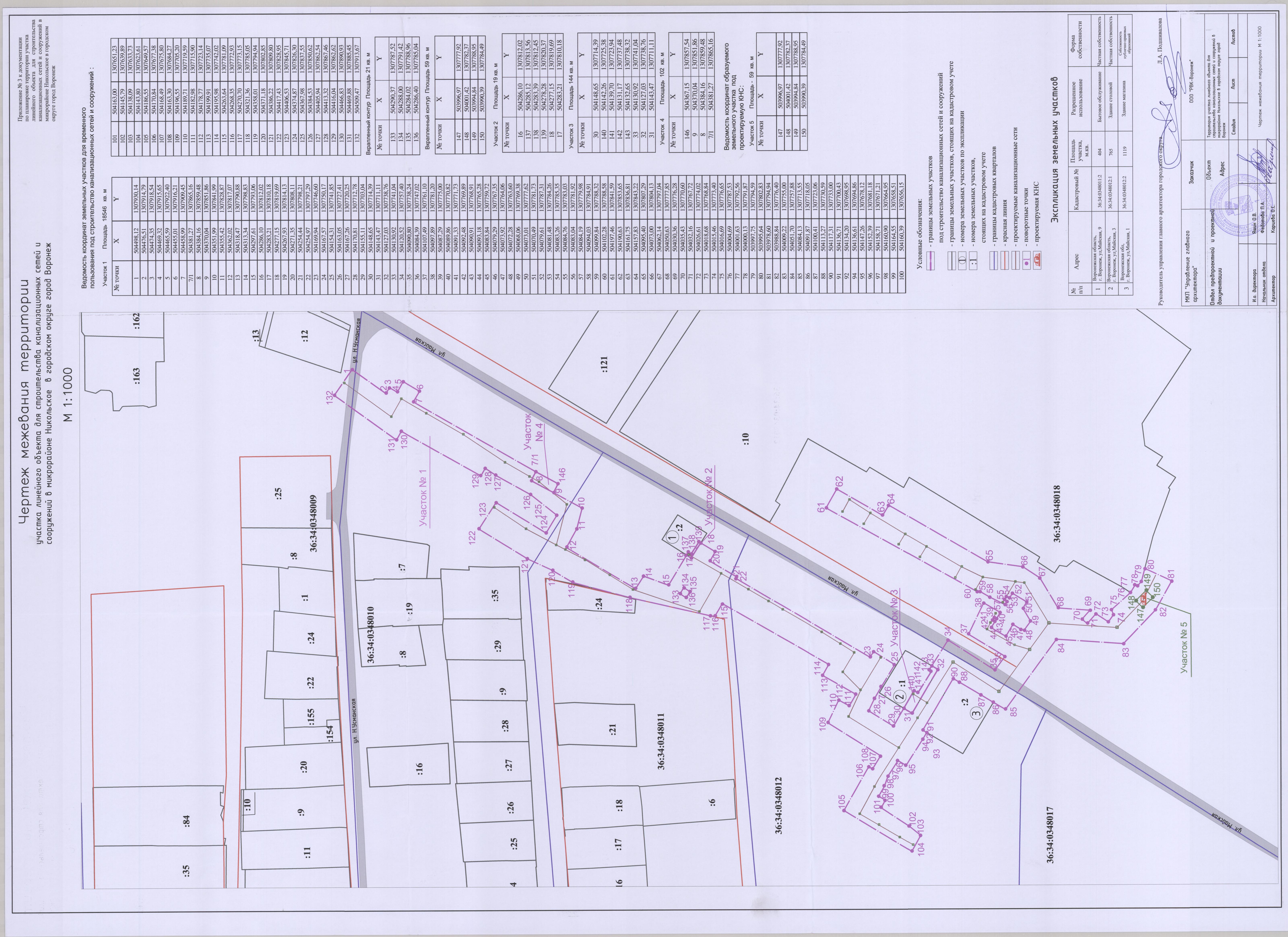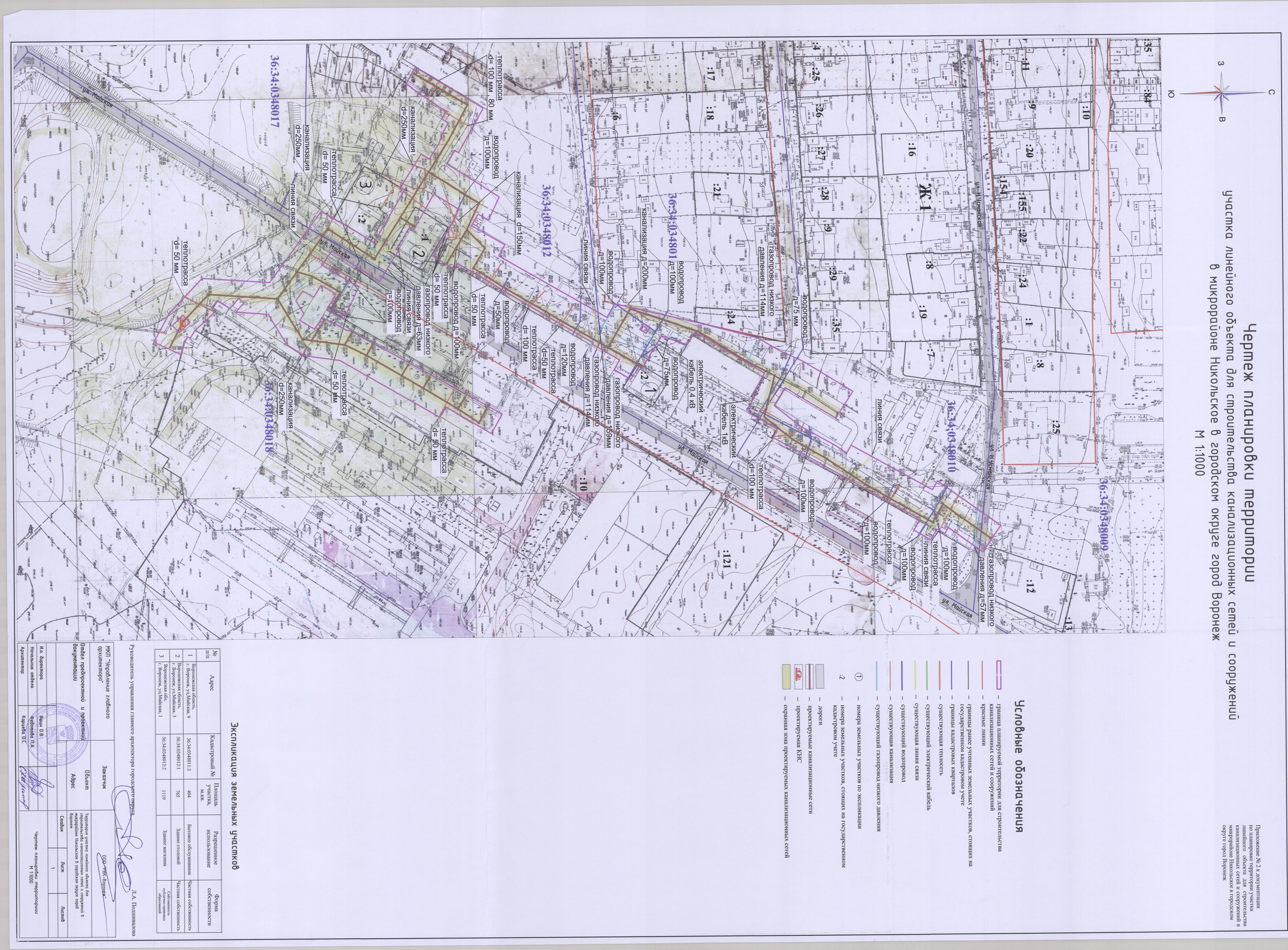 В соответствии с Градостроительным кодексом Российской Федерации, Федеральным законом от 06.10.2003 № 131-ФЗ «Об общих принципах организации местного самоуправления в Российской Федерации», постановлением Воронежской городской Думы от 27.10.2004 № 150-I «Об Уставе городского округа город Воронеж», в целях реализации Генерального плана городского округа город Воронеж, утвержденного решением Воронежской городской Думы от 19.12.2008 № 422-II «Об утверждении Генерального плана городского округа город Воронеж», на основании заявления Общества с ограниченной ответственностью «РВК-Воронеж» (ИНН 7726671234), в связи с исполнением постановления администрации городского округа город Воронеж от 12.07.2017 № 371 «О подготовке документации по планировке территории участка линейного объекта для строительства канализационных сетей и сооружений в микрорайоне Никольское в городском округе город Воронеж», с учетом заключения от 17.05.2018 о результатах публичных слушаний по проекту планировки территории и проекту межевания территории, подготовленным в составе документации по планировке территории участка линейного объекта для строительства канализационных сетей и сооружений в микрорайоне Никольское в городском округе город Воронеж, администрация городского округа город Воронеж постановляет: