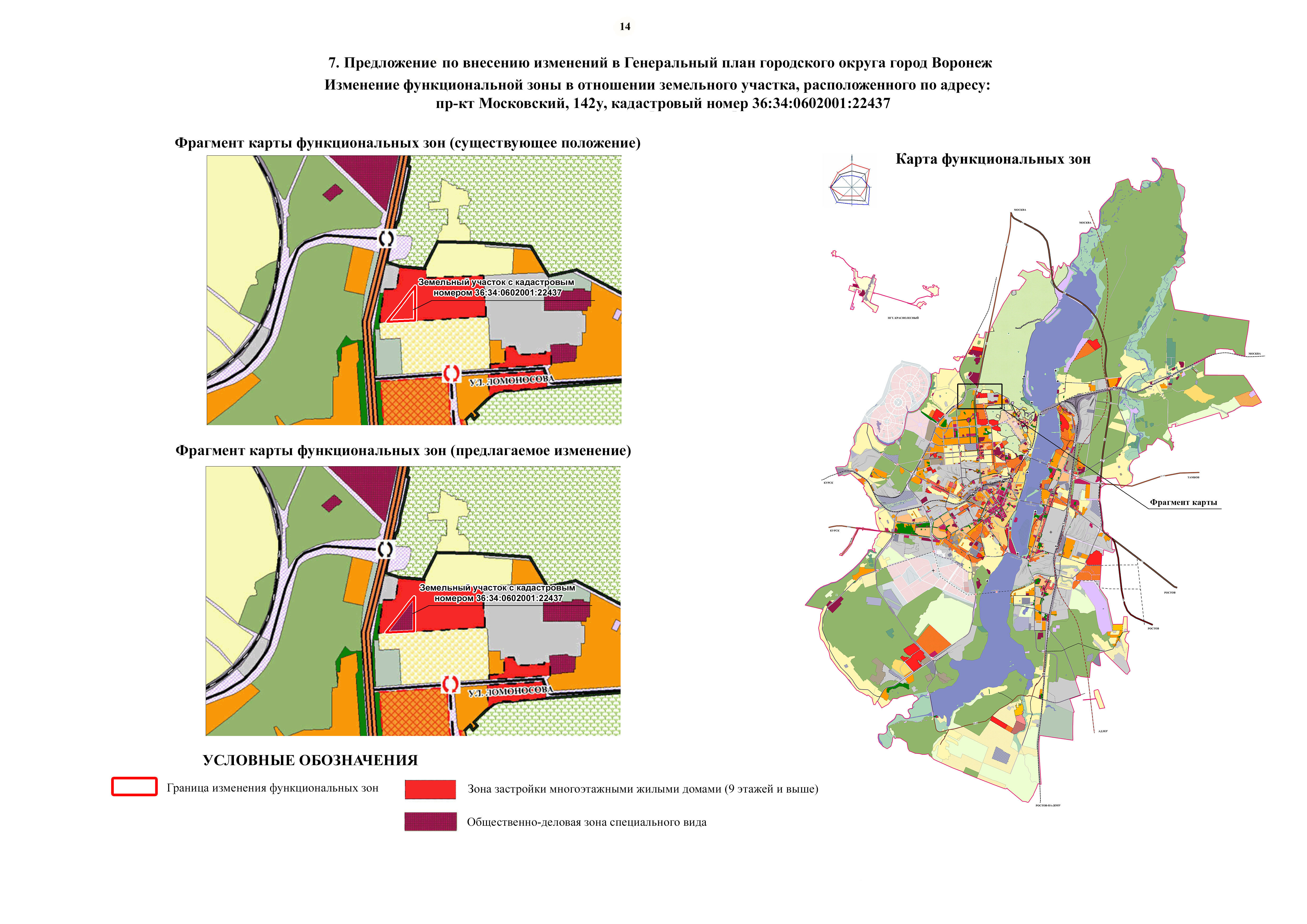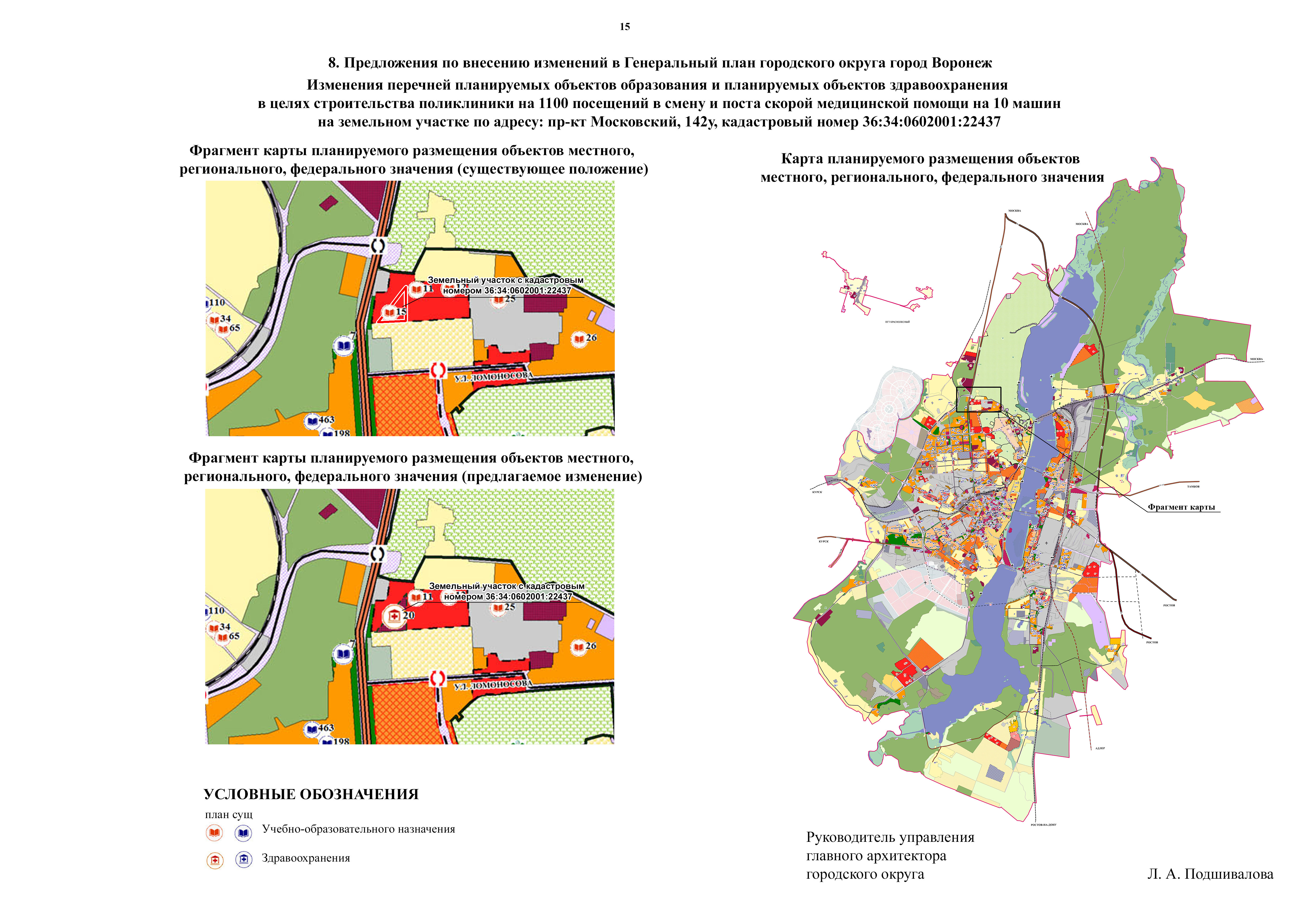 - по проекту внесения изменений в Генеральный план городского округа город Воронеж в части внесения изменений в Карту планируемого размещения объектов местного, регионального и федерального значения путем исключения пункта 15 перечня планируемых объектов образования, включения пункта 20 в перечень планируемых объектов здравоохранения, а также внесения изменений в Карту функциональных зон городского округа город Воронеж в части изменения функциональной зоны застройки многоэтажными жилыми домами (9 этажей и выше) на общественно-деловую зону специального вида на земельном участке по пр-кту Московский, 142у (кадастровый номер 36:34:0602001:22437);