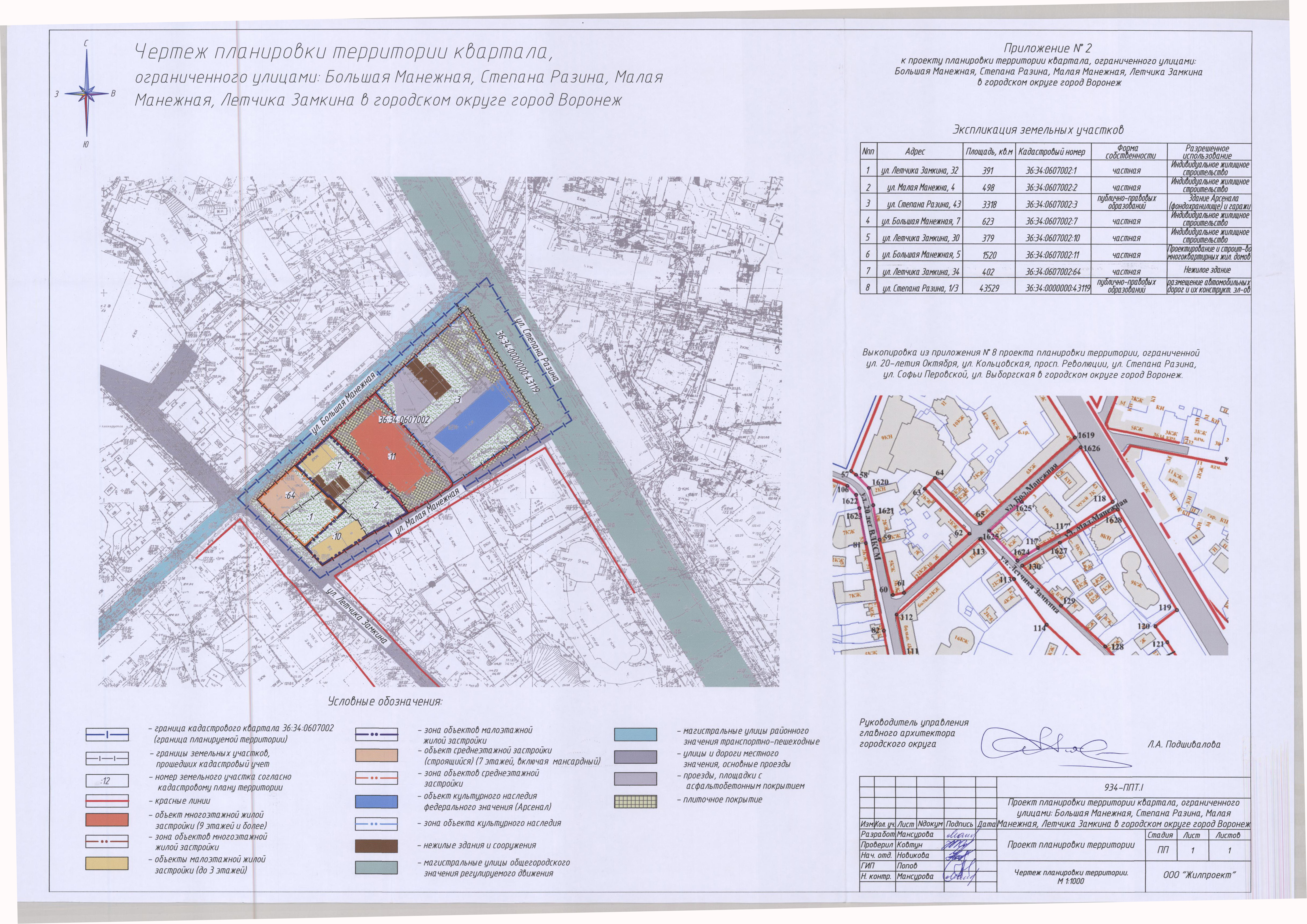 утвердить прилагаемый проект планировки территории квартала, ограниченного улицами: Большая Манежная, Степана Разина, Малая Манежная, Летчика Замкина в городском округе город Воронеж.