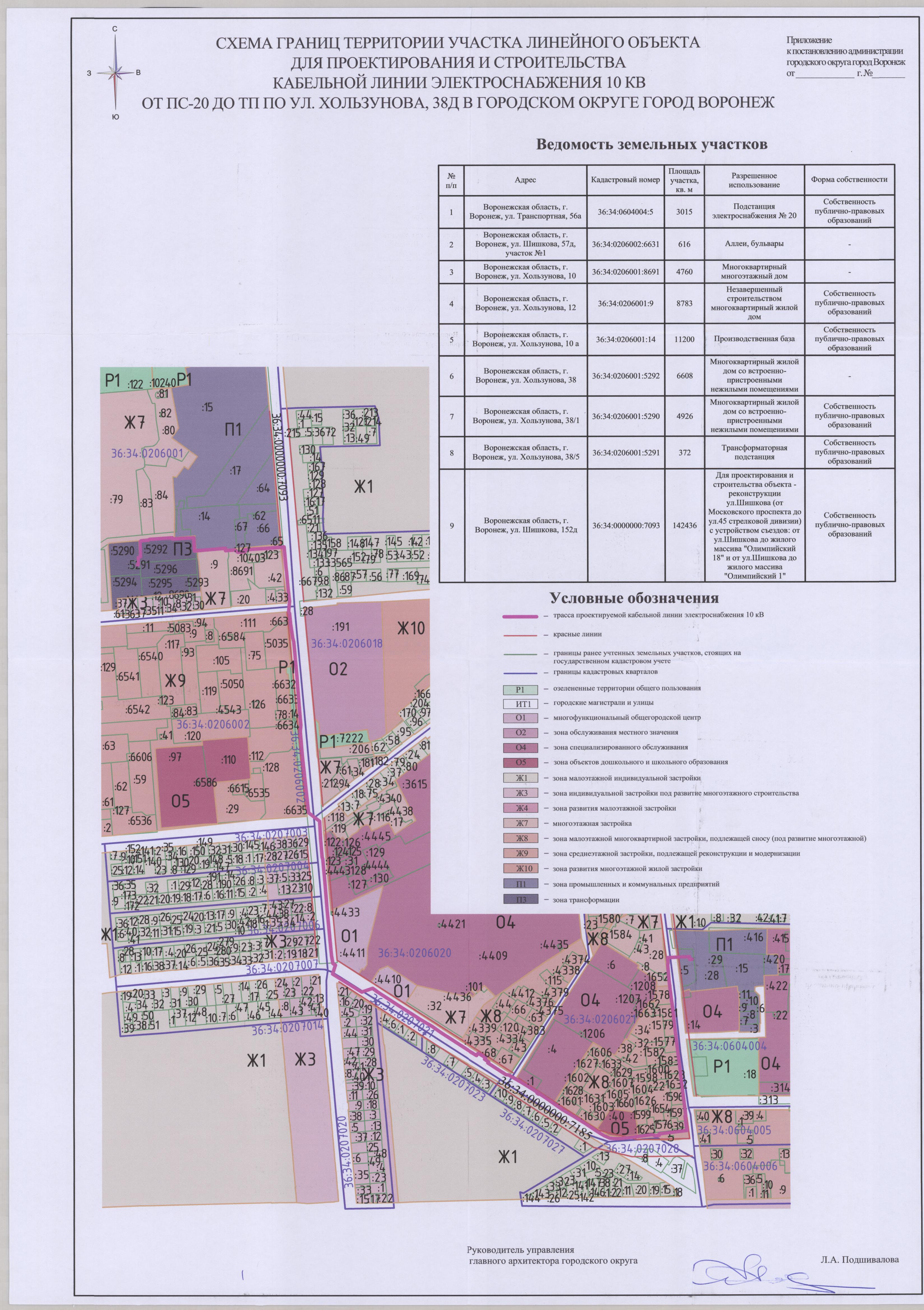 2.1. Подготовить в соответствии с утвержденным заданием документацию по планировке территории участка линейного объекта для проектирования и строительства кабельной линии электроснабжения 10 кВ от ПС-20 до ТП по ул. Хользунова, 38д в городском округе город Воронеж согласно прилагаемой схеме.