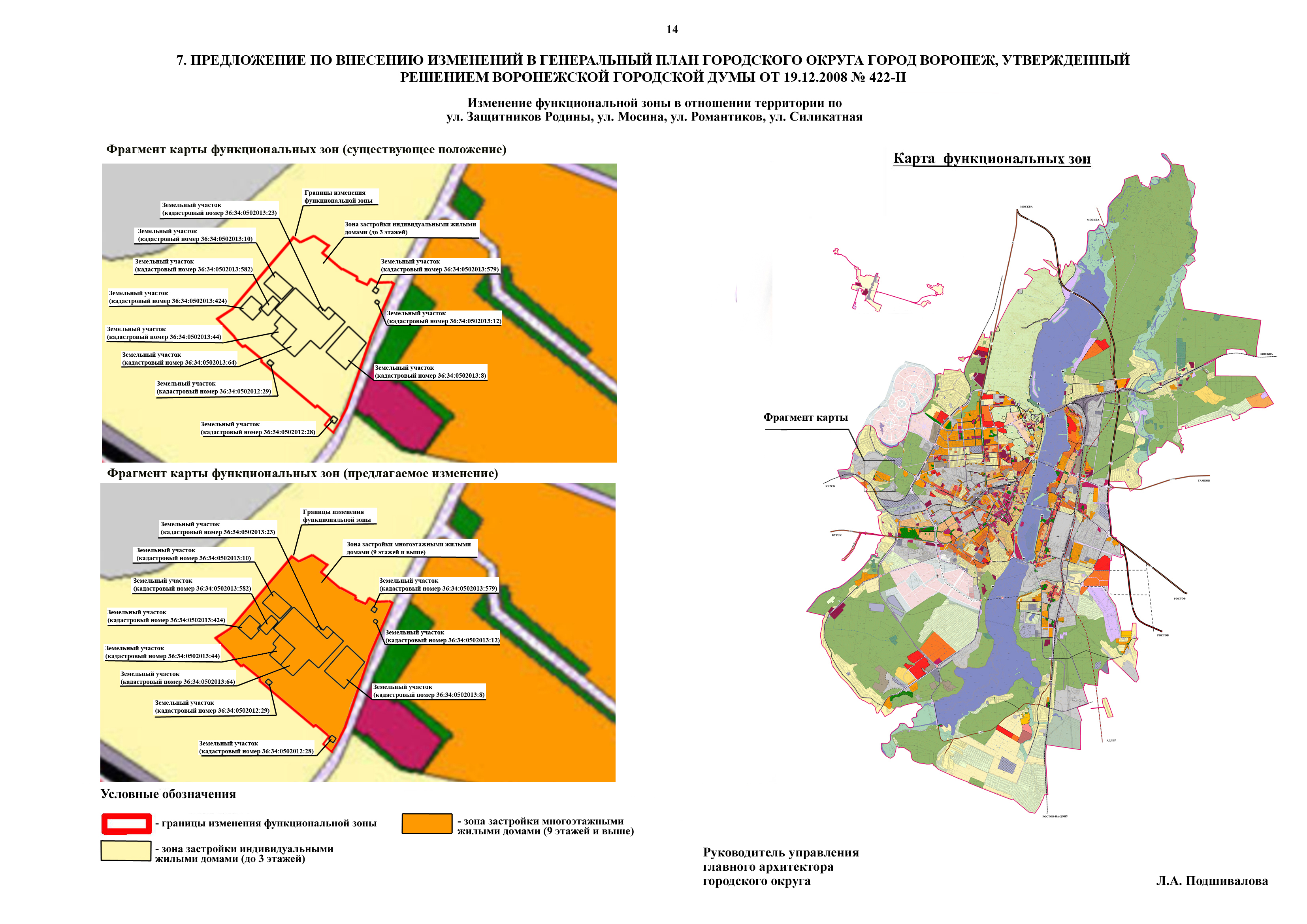 - по проекту внесения изменений в Генеральный план городского округа город Воронеж в части изменения функциональной зоны застройки индивидуальными жилыми домами (до 3 этажей) на зону застройки многоэтажными жилыми домами (9 этажей и выше) в отношении территории по ул. Защитников Родины, ул. Мосина, ул. Романтиков, ул. Силикатная;