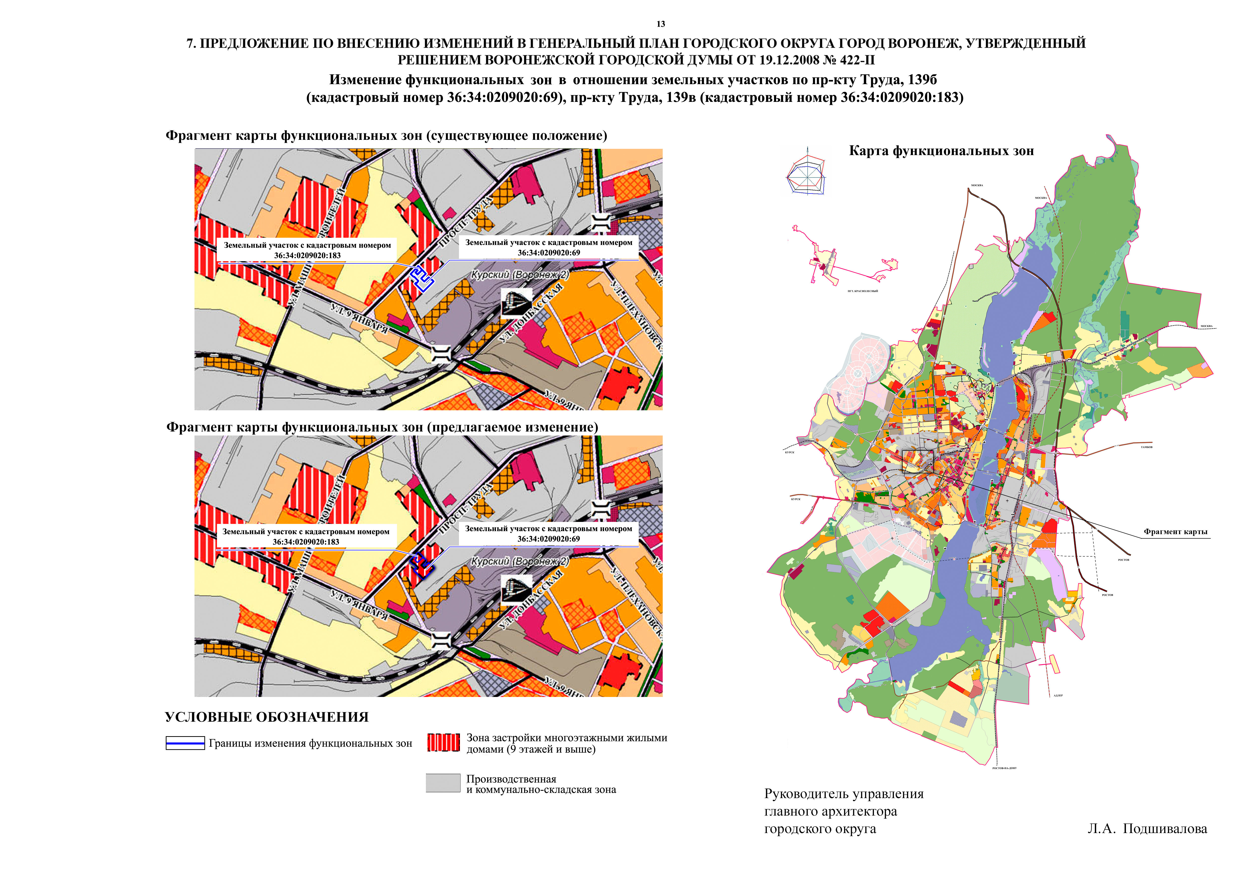 - - по проекту внесения изменений в Генеральный план городского округа город Воронеж в части изменения функциональной производственной и коммунально-складской зоны на зону застройки многоэтажными жилыми домами (9 этажей и выше) для земельных участков, расположенных по адресам: г. Воронеж, пр-кт Труда, 139б (кадастровый номер 36:34:0209020:69), г. Воронеж, пр-кт Труда, 139в (кадастровый номер 36:34:0209020:183);