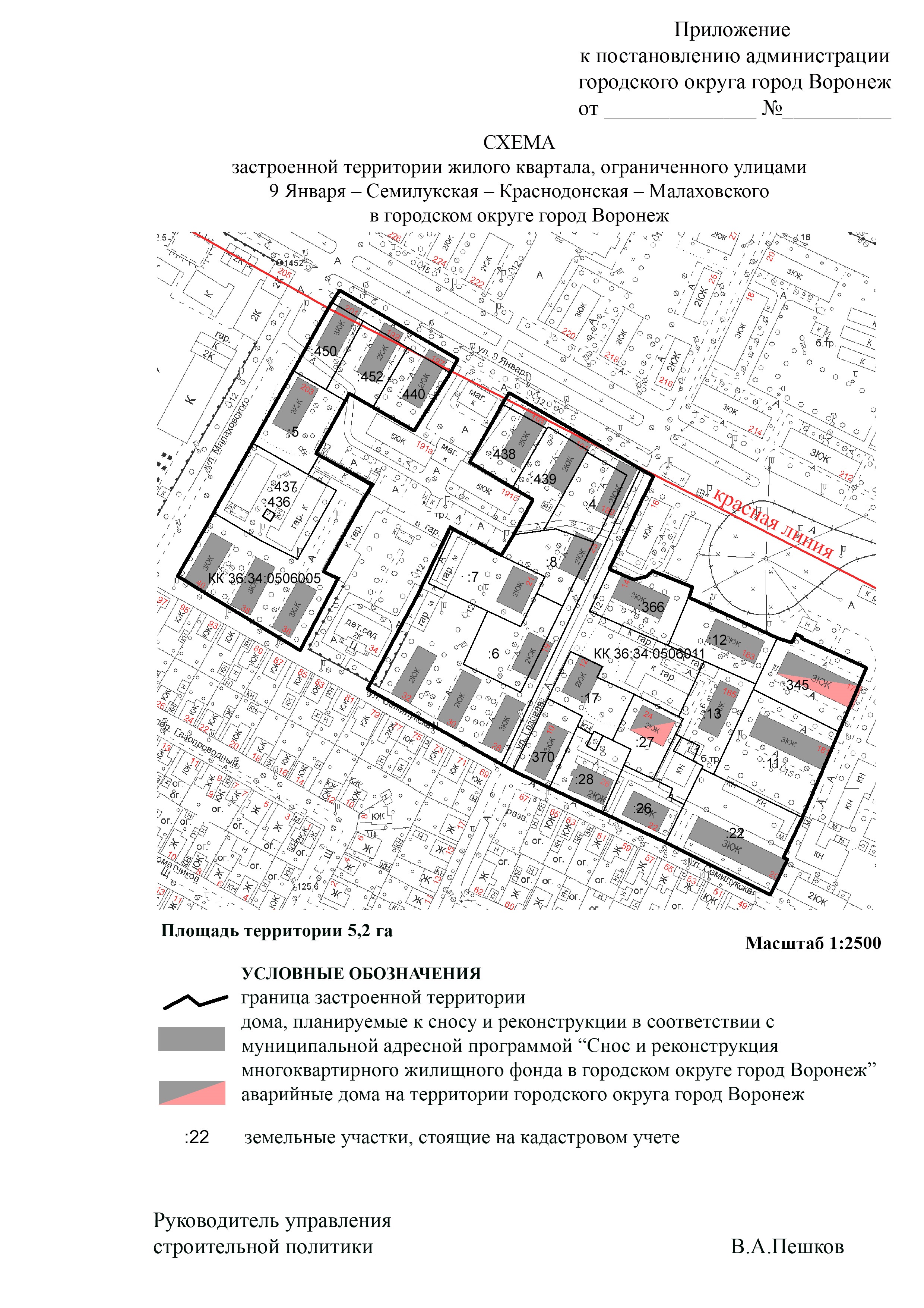 1. Принять решение о развитии застроенной территории жилого квартала, ограниченного улицами 9 Января – Семилукская – Краснодонская – Малаховского в городском округе город Воронеж, ориентировочной площадью 5,2 га согласно схеме (приложение к настоящему постановлению), в соответствии с градостроительным регламентом Ж 8, установленным Правилами землепользования и застройки городского округа город Воронеж.
