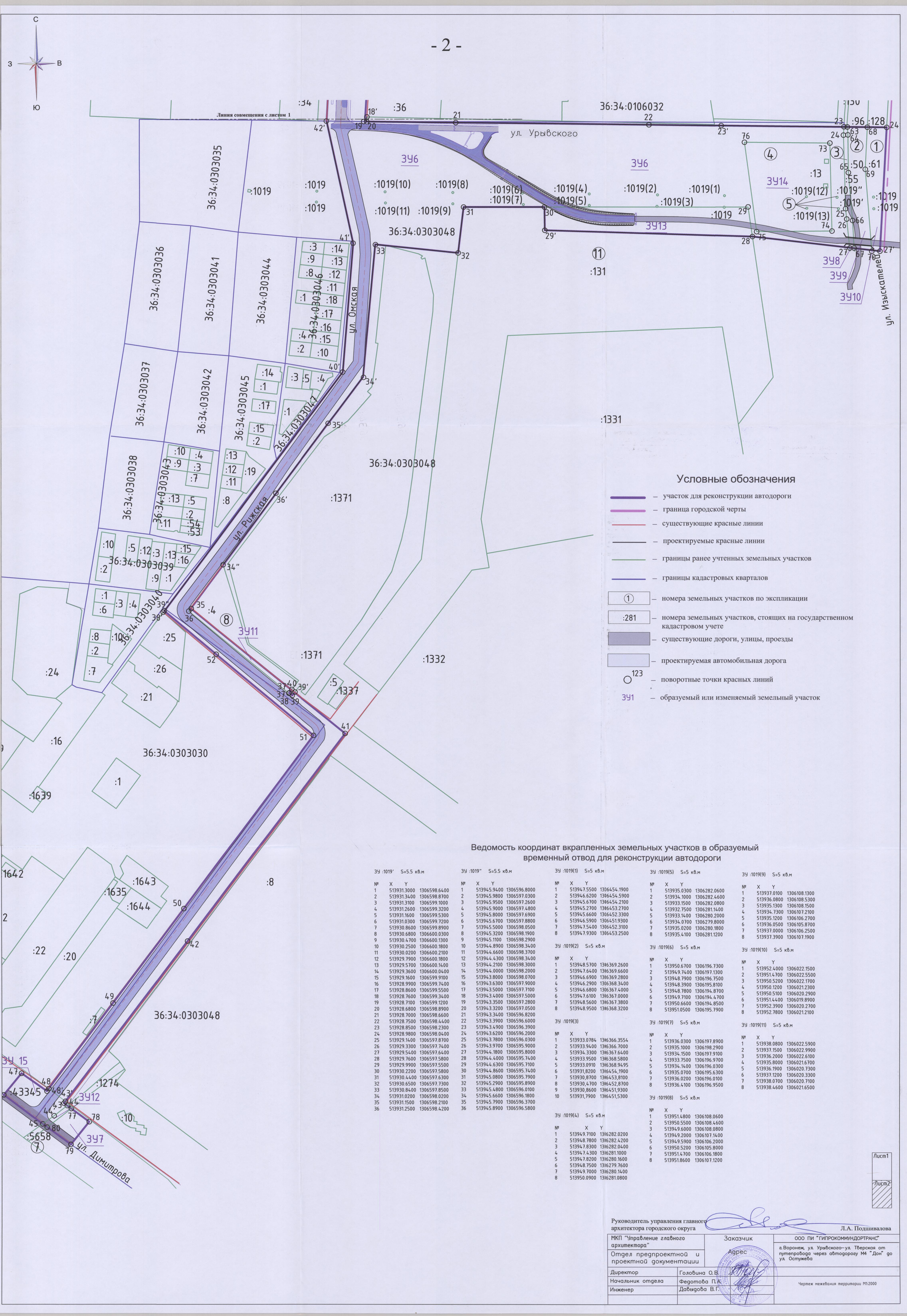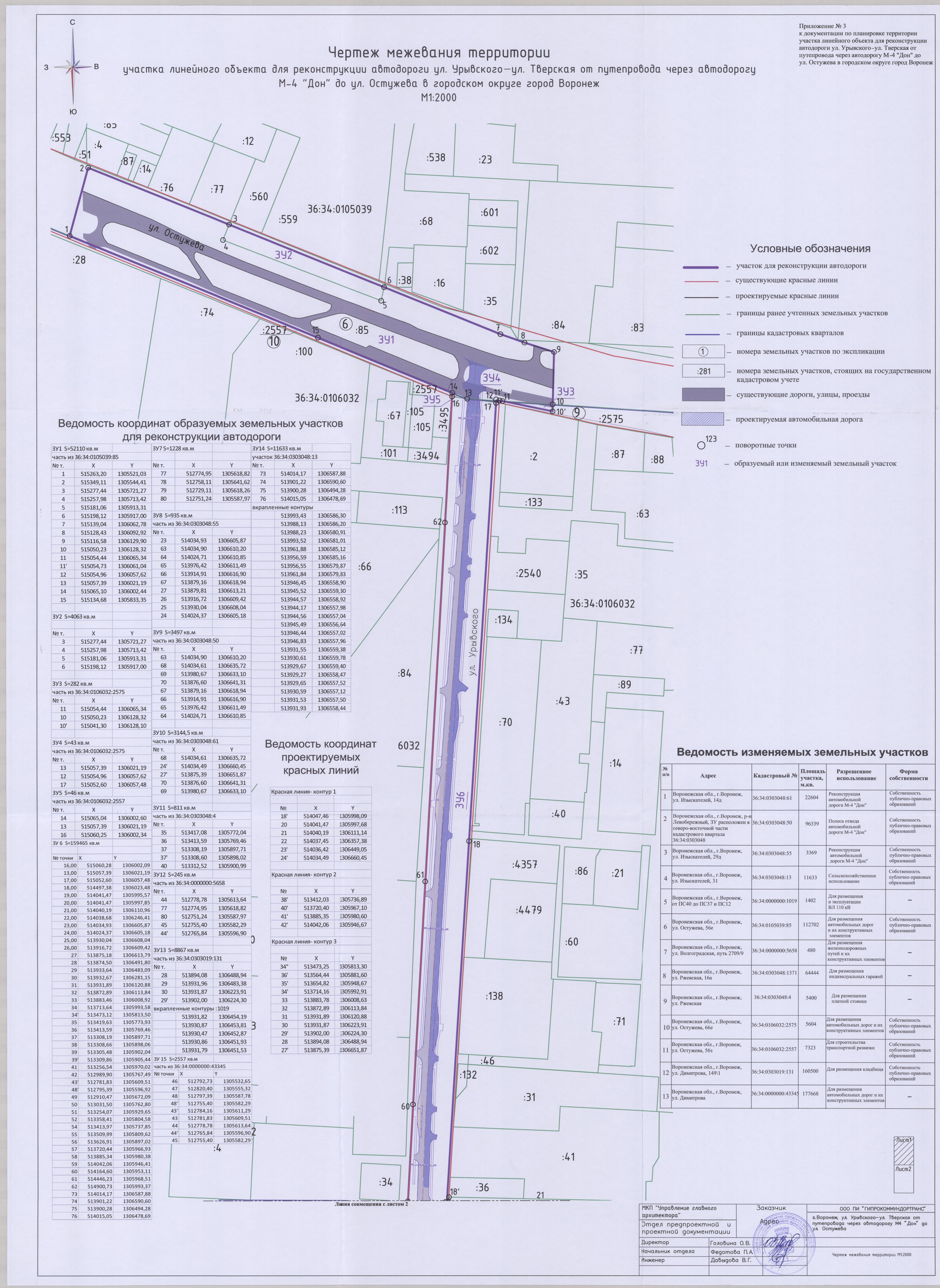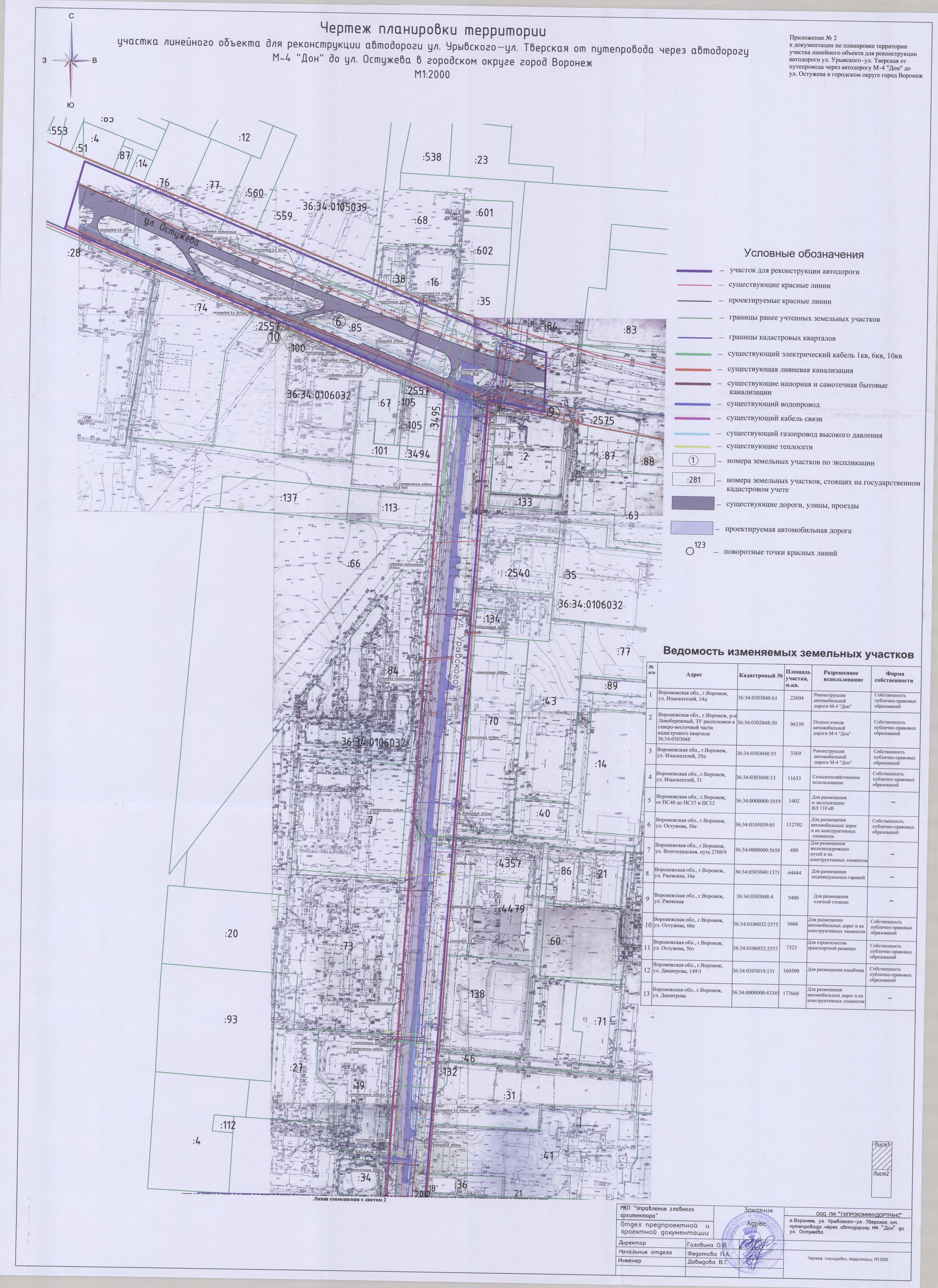 В соответствии с Градостроительным кодексом Российской Федерации, Федеральным законом от 06.10.2003 № 131-ФЗ «Об общих принципах организации местного самоуправления в Российской Федерации», постановлением Воронежской городской Думы от 27.10.2004 № 150-I «Об Уставе городского округа город Воронеж», в целях реализации Генерального плана городского округа город Воронеж, утвержденного решением Воронежской городской Думы от 19.12.2008 № 422-II «Об утверждении Генерального плана городского округа город Воронеж», на основании заявления муниципального казенного учреждения городского округа город Воронеж «Городская дирекция дорожного хозяйства и благоустройства» (ИНН 3666154383), в связи с исполнением постановления администрации городского округа город Воронеж от 17.08.2017 № 448 «О подготовке документации по планировке территории участка линейного объекта для реконструкции автодороги ул. Урывского – ул. Тверская от путепровода через автодорогу М-4 «Дон» до ул. Остужева в городском округе город Воронеж», с учетом заключения от 01.11.2018 о результатах публичных слушаний по проекту планировки территории и проекту межевания территории, подготовленным в составе документации по планировке территории участка линейного объекта для реконструкции автодороги ул. Урывского – ул. Тверская от путепровода через автодорогу М-4 «Дон» до ул. Остужева в городском округе город Воронеж, администрация городского округа город Воронеж постановляет: