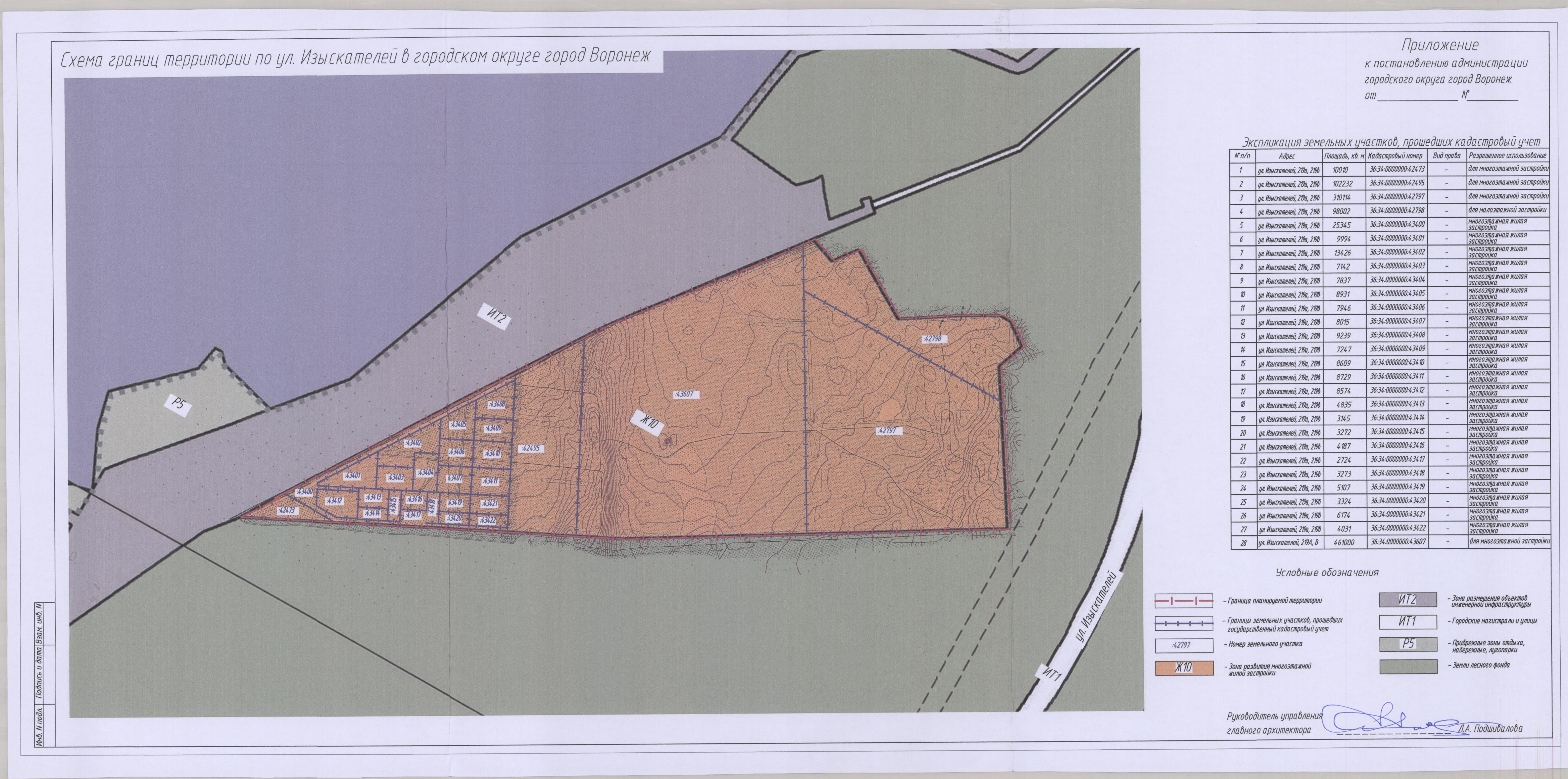 2.1. Подготовить в соответствии с утвержденным заданием, указанным в пункте 1 настоящего постановления, документацию по планировке территории по ул. Изыскателей в городском округе город Воронеж согласно прилагаемой схеме.