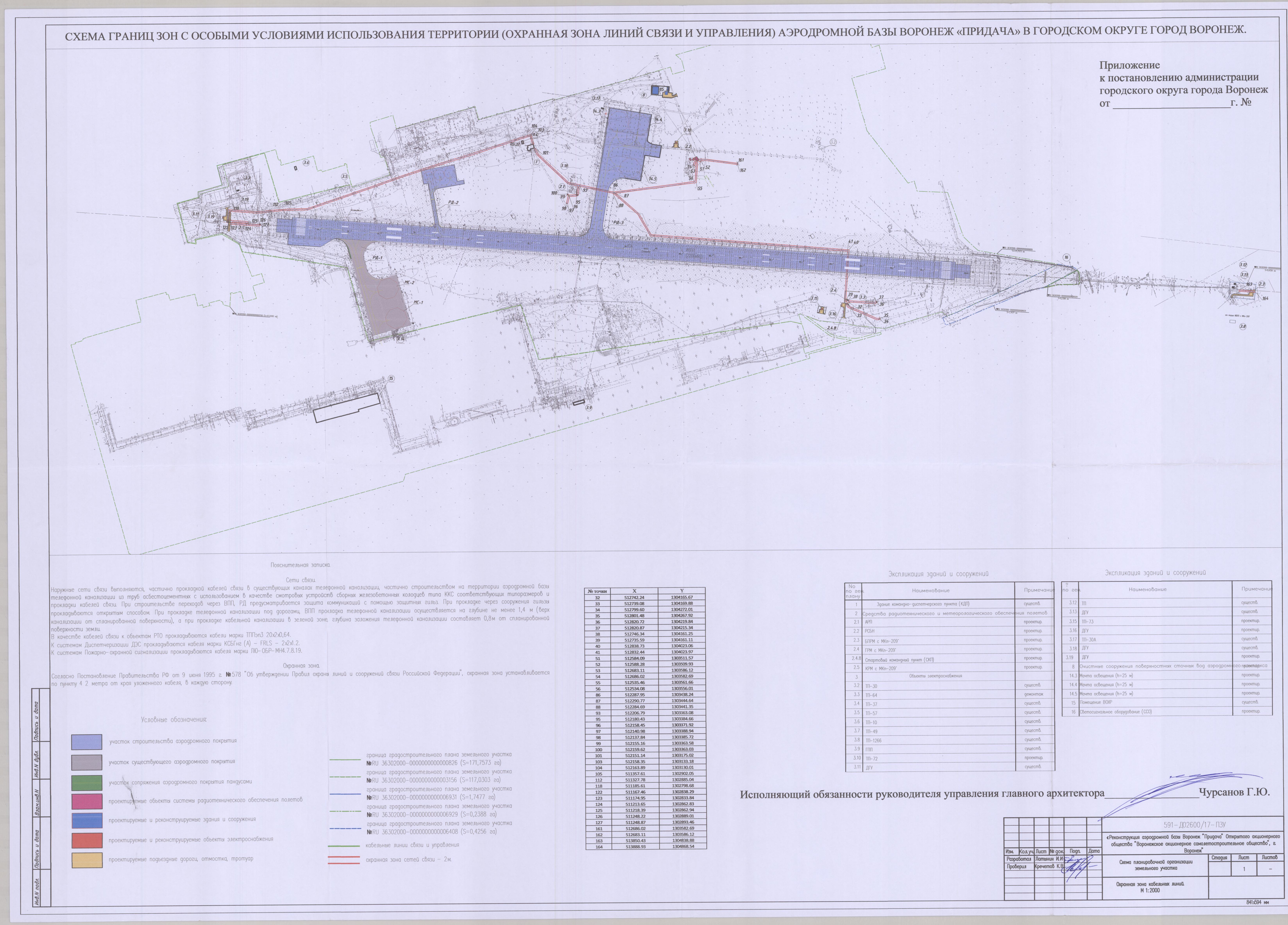 1. Утвердить границы зон с особыми условиями использования территории (охранная зона линий связи и управления) аэродромной базы «Придача» в городском округе город Воронеж согласно прилагаемой схеме к настоящему постановлению.