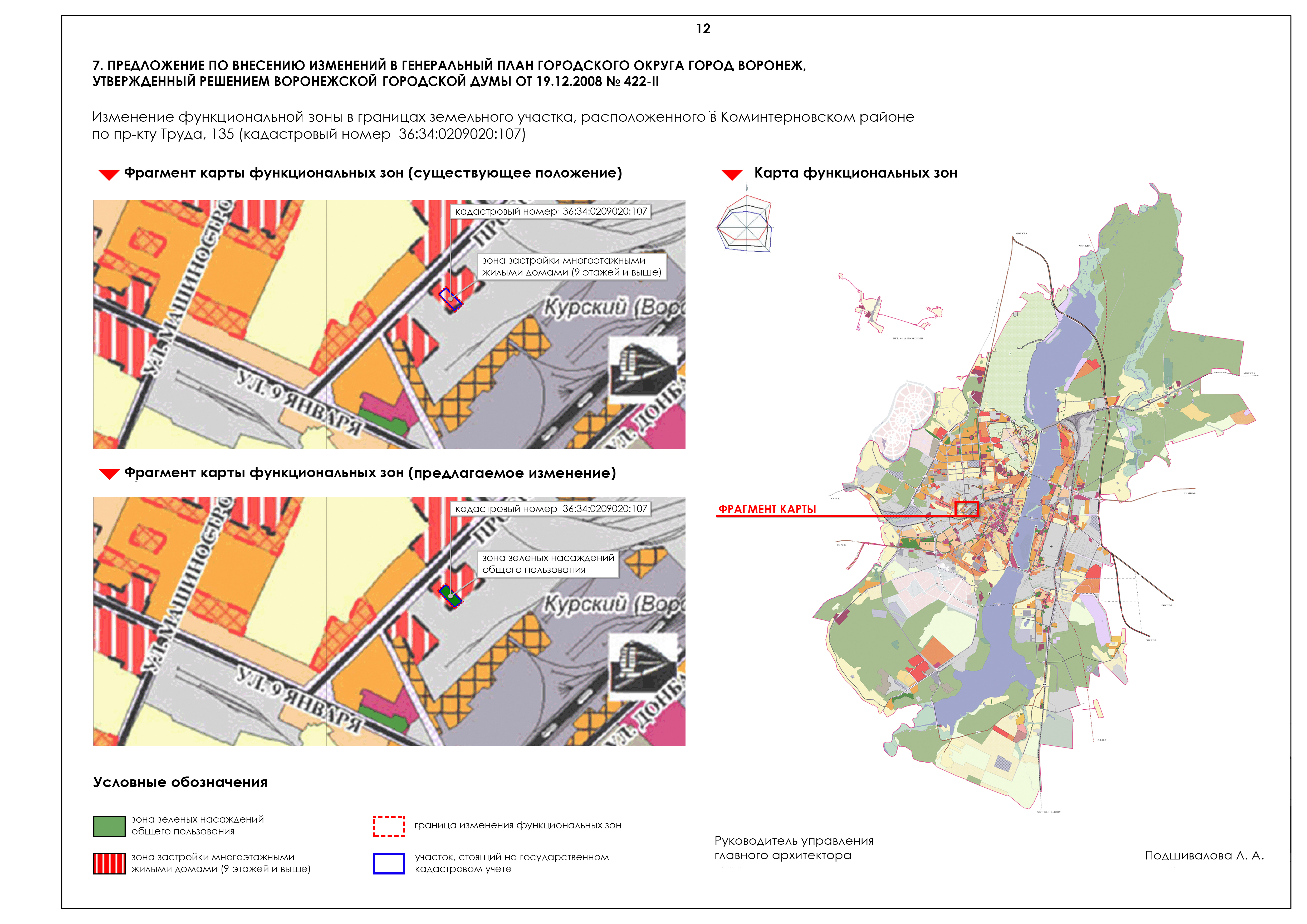 - - по проекту внесения изменений в Генеральный план городского округа город Воронеж в части изменения границ функциональной зоны застройки многоэтажными жилыми домами (9 этажей и выше) на зону зеленых насаждений общего пользования в отношении земельного участка по пр-кту Труда, 135 (кадастровый номер 36:34:0209020:107);