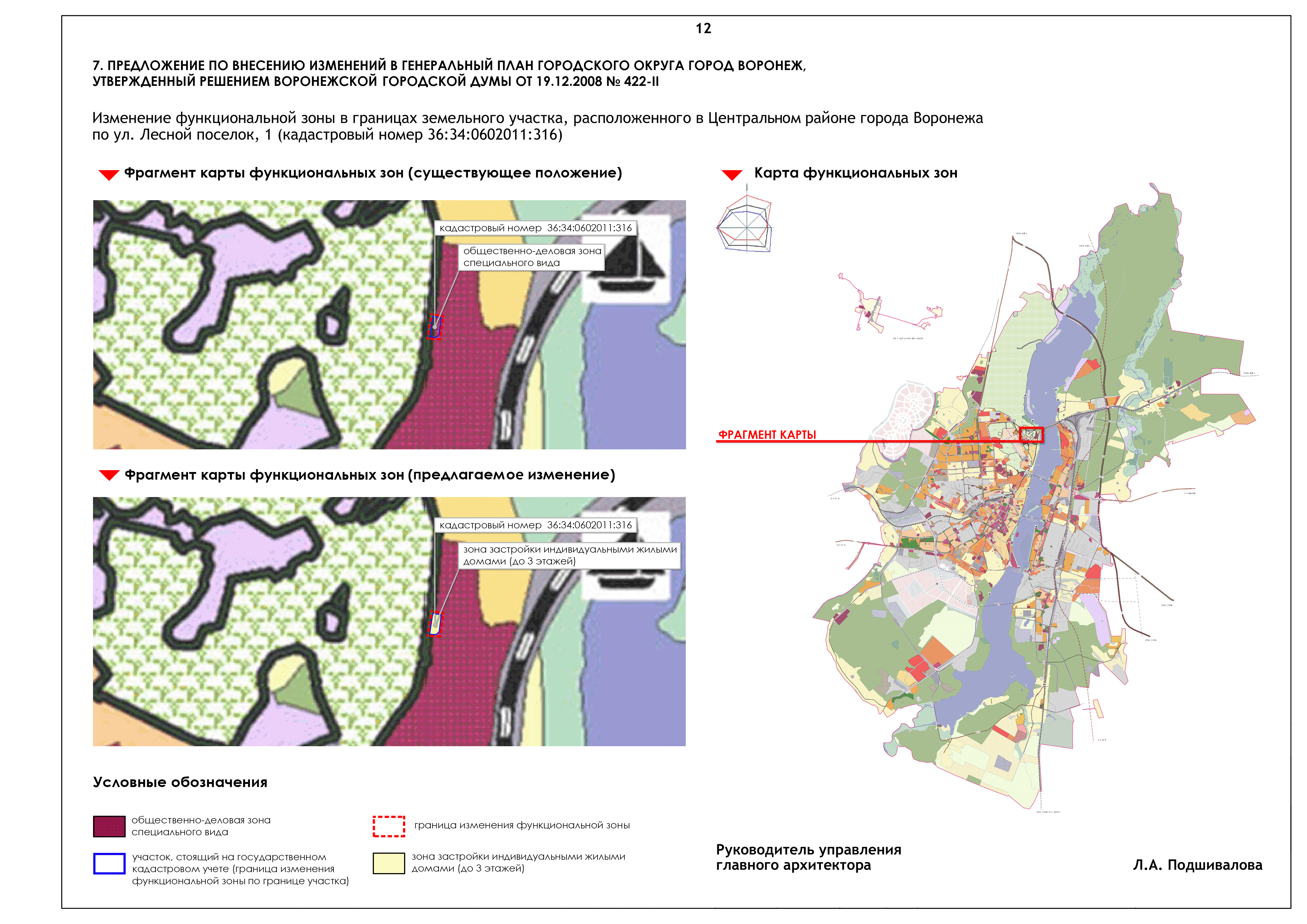- - по проекту внесения изменений в Генеральный план городского округа город Воронеж в части изменения границ функциональной общественно-деловой зоны специального вида на зону застройки малоэтажными жилыми домами (до 3 этажей) в отношении земельного участка по ул. Лесной поселок, 1, (кадастровый номер 36:34:0602011:316);