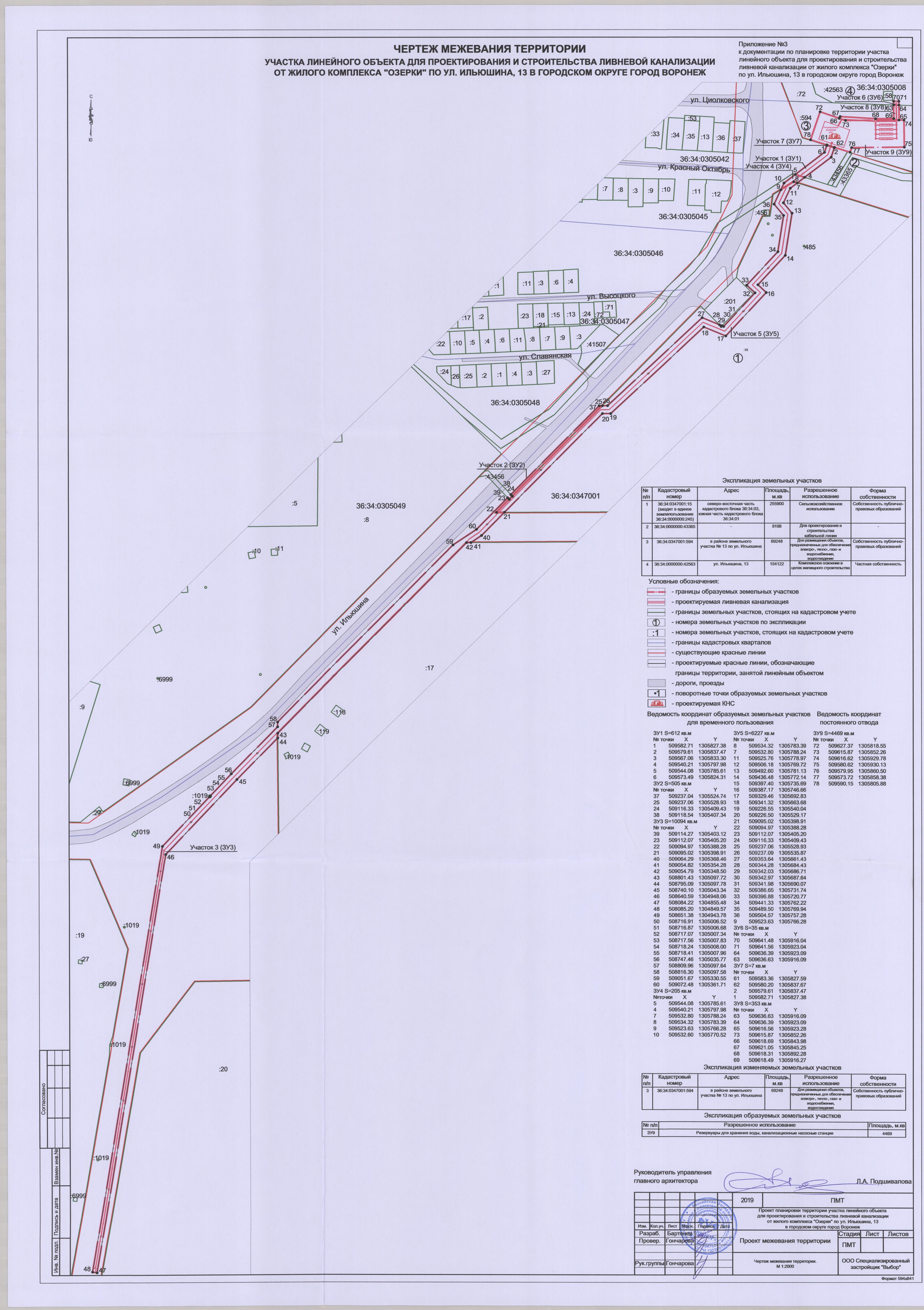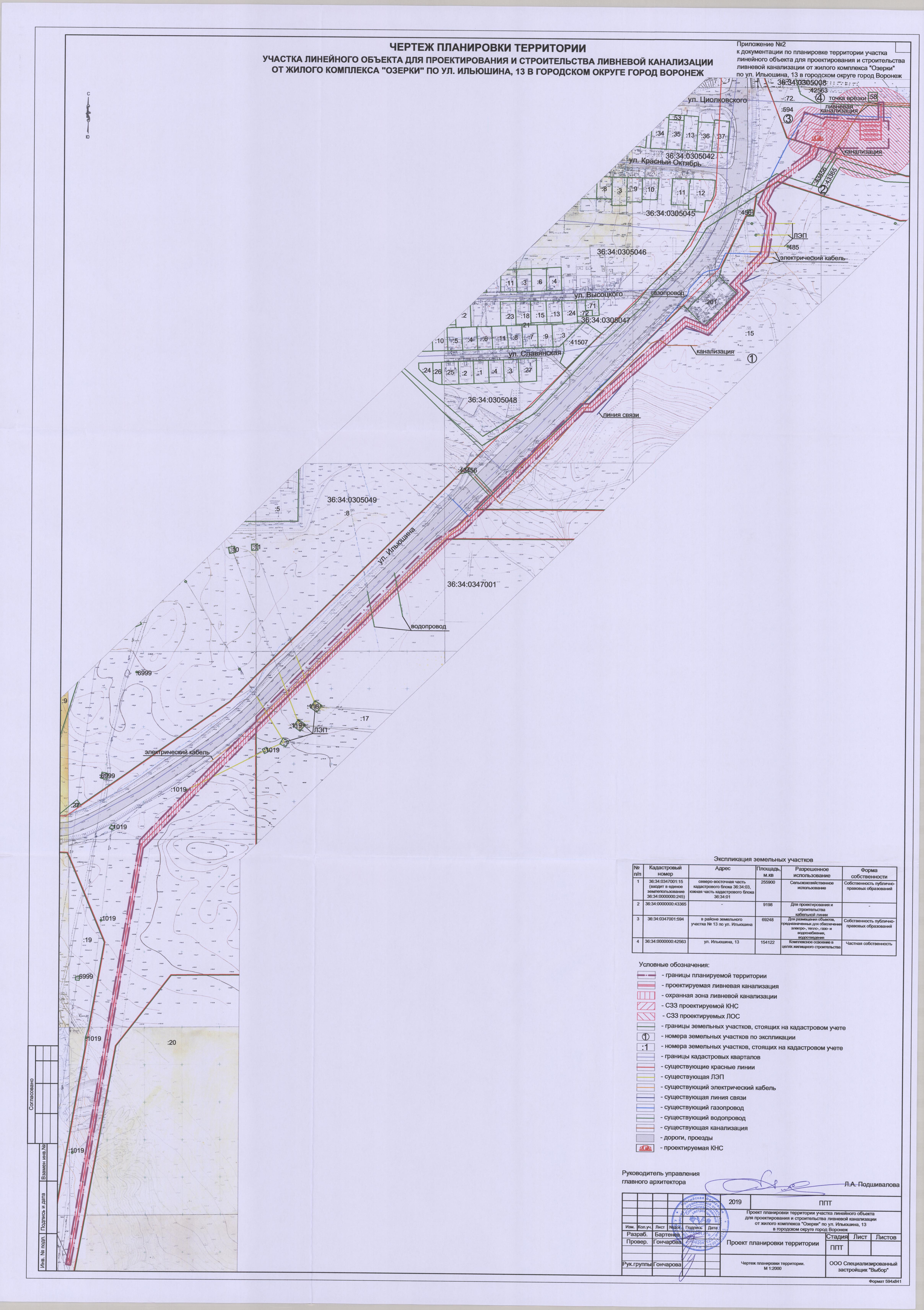В соответствии с Градостроительным кодексом Российской Федерации, Федеральным законом от 06.10.2003 № 131-ФЗ «Об общих принципах организации местного самоуправления в Российской Федерации», постановлением Воронежской городской Думы от 27.10.2004 № 150-I «Об Уставе городского округа город Воронеж», в целях реализации Генерального плана городского округа город Воронеж, утвержденного решением Воронежской городской Думы от 19.12.2008 № 422-II «Об утверждении Генерального плана городского округа город Воронеж», на основании заявления Общества с ограниченной ответственностью специализированный застройщик «Озерки» (ИНН 3662178344), в связи с исполнением постановления администрации городского округа город Воронеж от 04.12.2017 № 679 «О подготовке документации по планировке территории участка линейного объекта для проектирования и строительства ливневой канализации от жилого комплекса «Озерки» по ул. Ильюшина, 13 в городском округе город Воронеж», с учетом заключения от 19.06.2019 о результатах публичных слушаний по проекту планировки территории и проекту межевания территории, подготовленным в составе документации по планировке территории участка линейного объекта для проектирования и строительства ливневой канализации от жилого комплекса «Озерки» по ул. Ильюшина, 13 в городском округе город Воронеж, администрация городского округа город Воронеж постановляет: