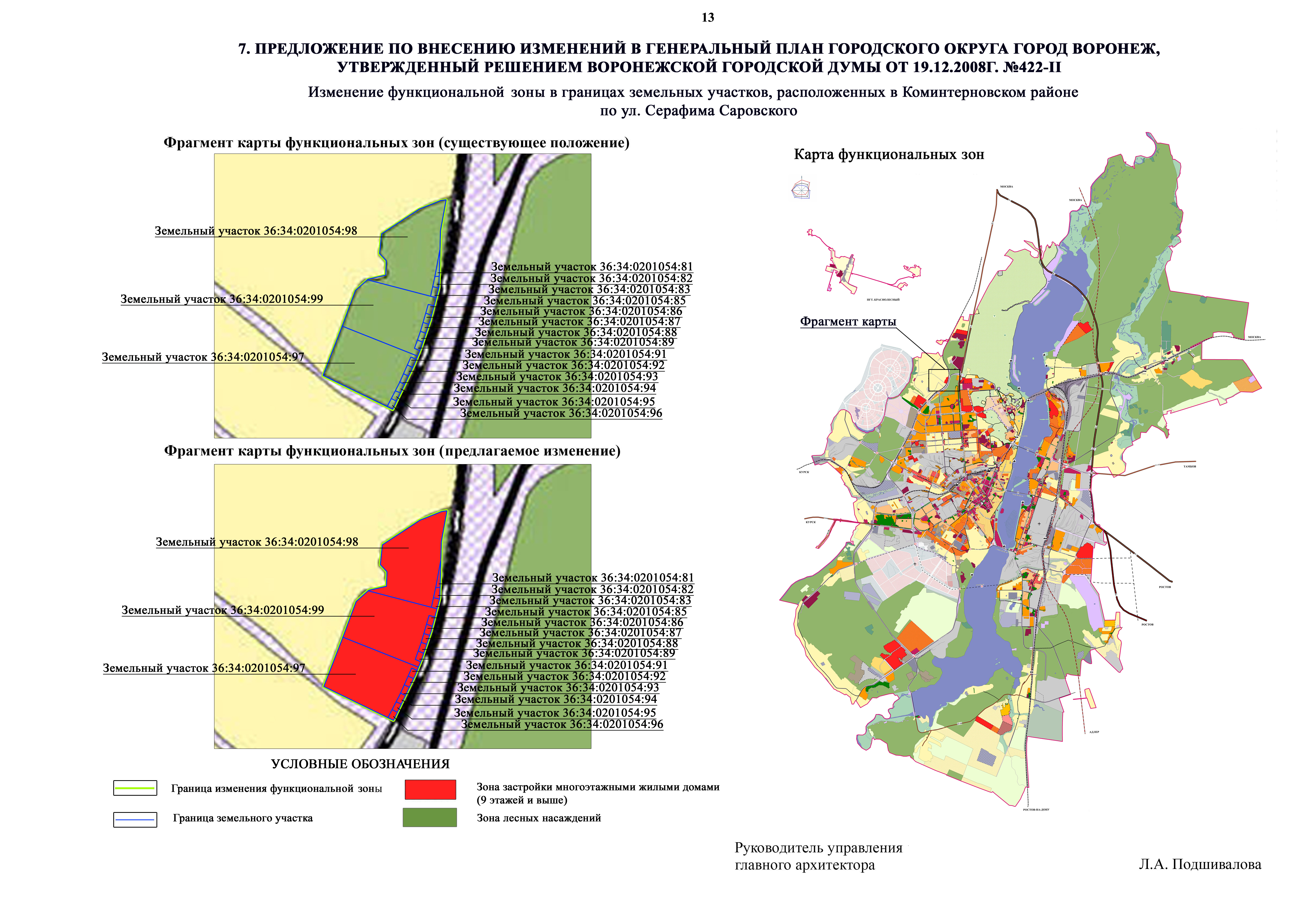 - по проекту о внесении изменений в Правила землепользования и застройки городского округа город Воронеж в части изменения границ территориальных зон Р 6 «Зеленые насаждения специального назначения» и Ж 7 «Многоэтажная застройка» с целью включения земельных участков по ул. Серафима Саровского, 175/17 (кадастровый номер 36:34:0201054:81), ул. Серафима Саровского, 175/16 (кадастровый номер 36:34:0201054:82), ул. Серафима Саровского, 175/15 (кадастровый номер 36:34:0201054:83), ул. Серафима Саровского, 175/13 (кадастровые номера 36:34:0201054:85), ул. Серафима Саровского, 175/12 (кадастровый номер 36:34:0201054:86), ул. Серафима Саровского, 175/11 (кадастровый номер 36:34:0201054:87), ул. Серафима Саровского, 175/10 (кадастровый номер 36:34:0201054:88), ул. Серафима Саровского, 175/9 (кадастровый номер 36:34:0201054:89), ул. Серафима Саровского, 175/7 (кадастровый номер 36:34:0201054:91), ул. Серафима Саровского, 175/6 (кадастровый номер 36:34:0201054:92), ул. Серафима Саровского, 175/5 (кадастровый номер 36:34:0201054:93), ул. Серафима Саровского, 175/4 (кадастровый номер 36:34:0201054:94), ул. Серафима Саровского, 175/3 (кадастровый номер 36:34:0201054:95), ул. Серафима Саровского, 175/2 (кадастровый номер 36:34:0201054:96), ул. Серафима Саровского, 175/1, 175/8, 175/14 (кадастровый номер 36:34:0201054:97), ул. Серафима Саровского, 175/1, 175/8, 175/14 (кадастровый номер 36:34:0201054:98), ул. Серафима Саровского, 175/1, 175/8, 175/14 (кадастровый номер 36:34:0201054:99) в состав территориальной зоны Ж 7 «Многоэтажная застройка».
