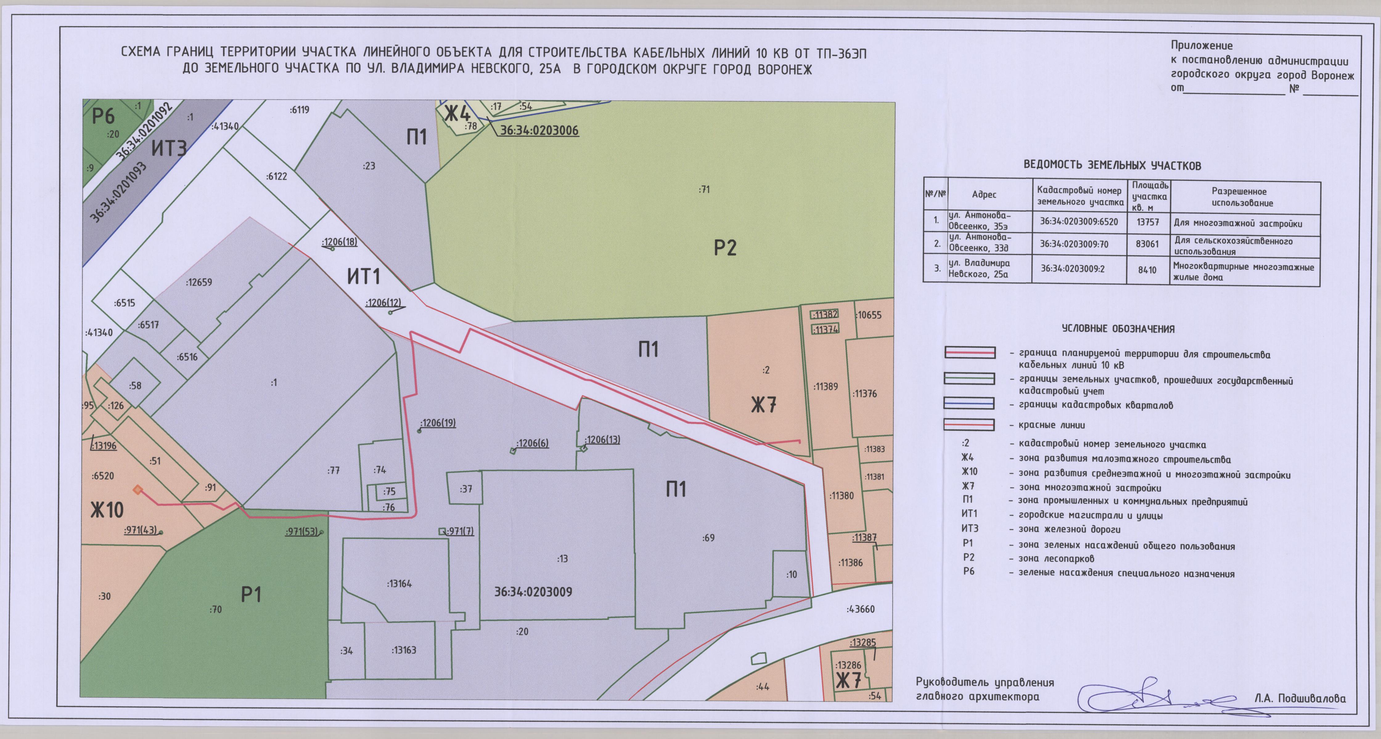2.1. Подготовить в соответствии с утвержденным заданием документацию по планировке территории участка линейного объекта для строительства кабельных линий 10 кВ от ТП-36ЭП до земельного участка по ул. Владимира Невского, 25а в городском округе город Воронеж согласно прилагаемой схеме.