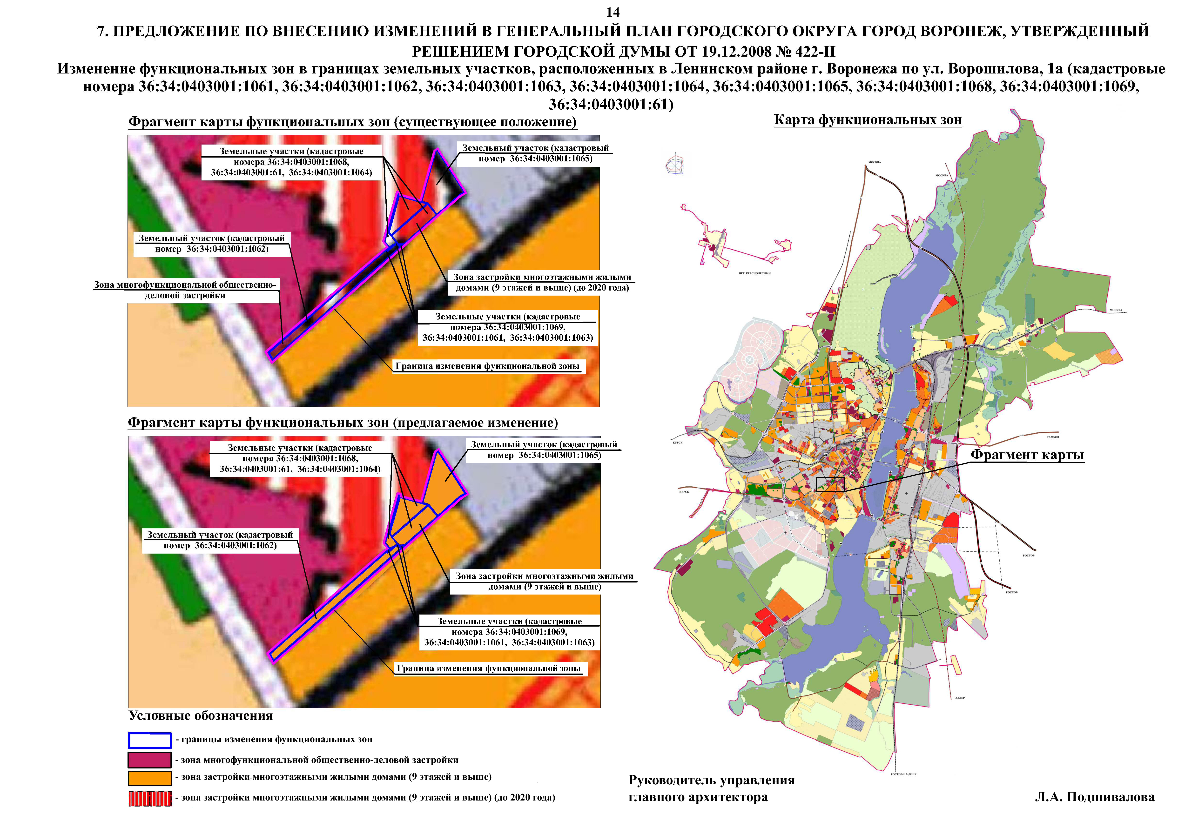 - - по проекту внесения изменений в Генеральный план городского округа город Воронеж в части изменения функциональных зон многофункциональной общественно-деловой застройки, застройки многоэтажными жилыми домами (9 этажей и выше) (до 2020 года) на зону застройки многоэтажными жилыми домами (9 этажей и выше) для земельных участков по ул. Ворошилова, 1а (кадастровые номера 36:34:0403001:1061, 36:34:0403001:1062, 36:34:0403001:1063, 36:34:0403001:1064, 36:34:0403001:1065, 36:34:0403001:1068, 36:34:0403001:1069, 36:34:0403001:61);