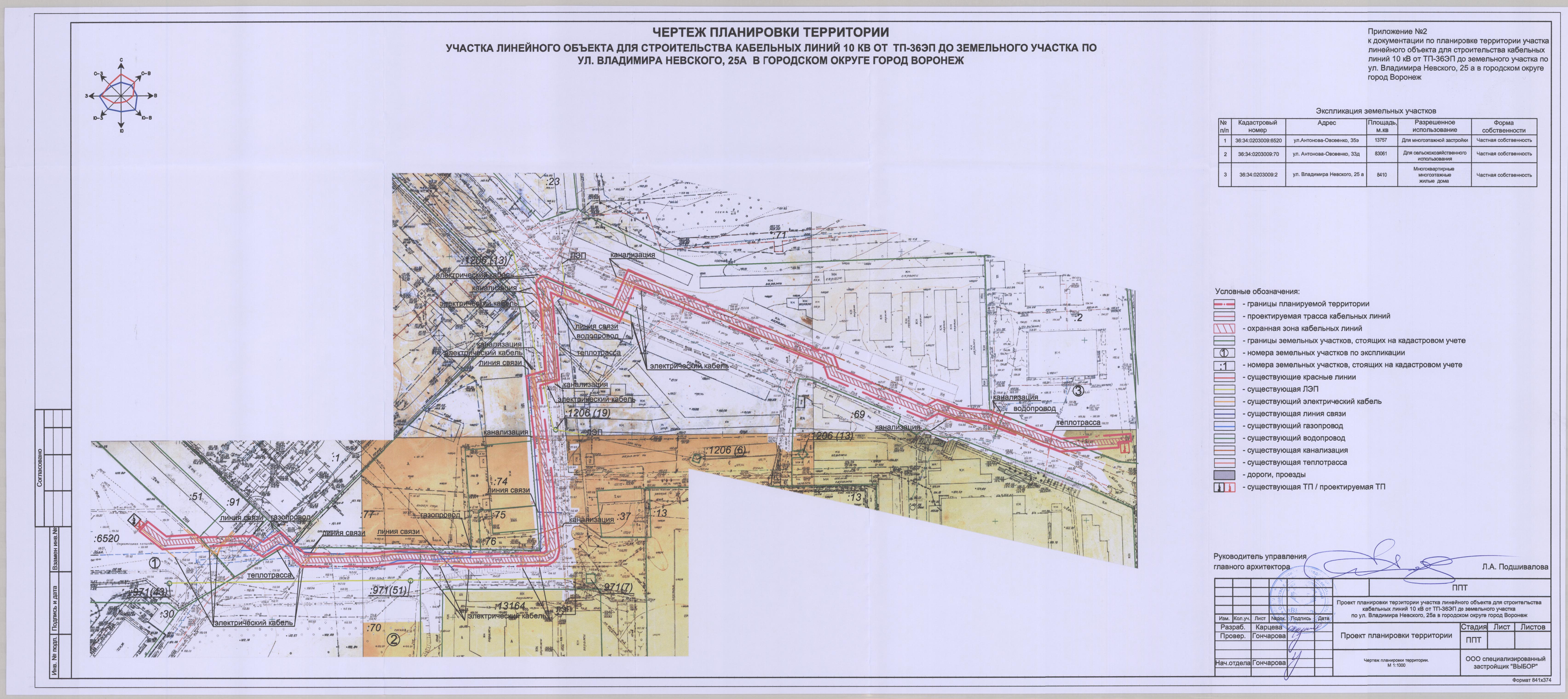 - - обеспечить размещение экспозиции демонстрационных материалов по проекту планировки территории и проекту межевания территории, подготовленным в составе документации по планировке территории участка линейного объекта для строительства кабельных линий 10 кВ от ТП-36ЭП до земельного участка по ул. Владимира Невского, 25а в городском округе город Воронеж, в зале Дома архитектора (394018, г. Воронеж, ул. Плехановская, 22) в соответствии с требованиями действующего законодательства, правовых актов городского округа город Воронеж по организации и проведению публичных слушаний;