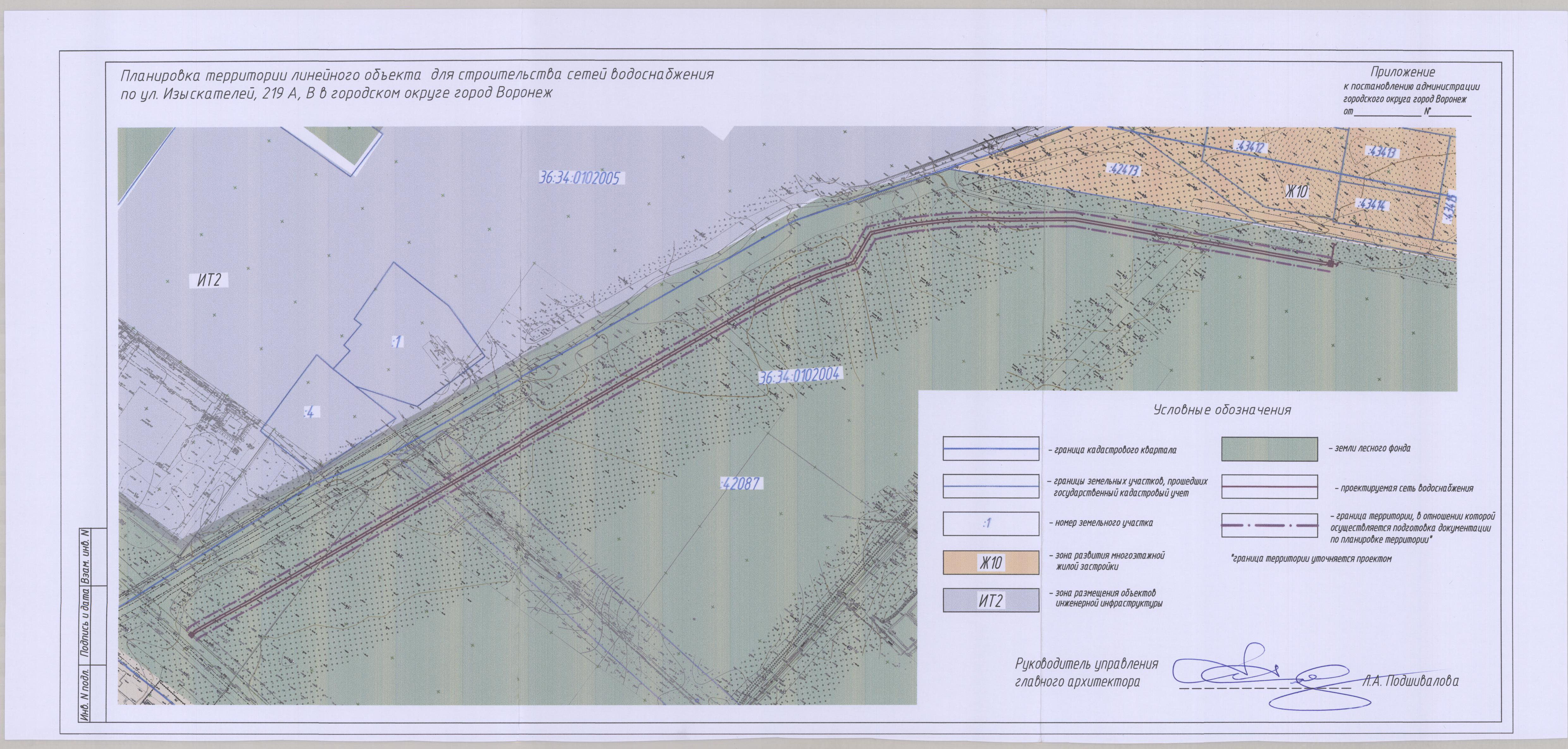 2.1. Подготовить в соответствии с утвержденным заданием документацию по планировке территории участка линейного объекта для строительства сетей водоснабжения по ул. Изыскателей, 219 А, В в городском округе город Воронеж согласно прилагаемой схеме.