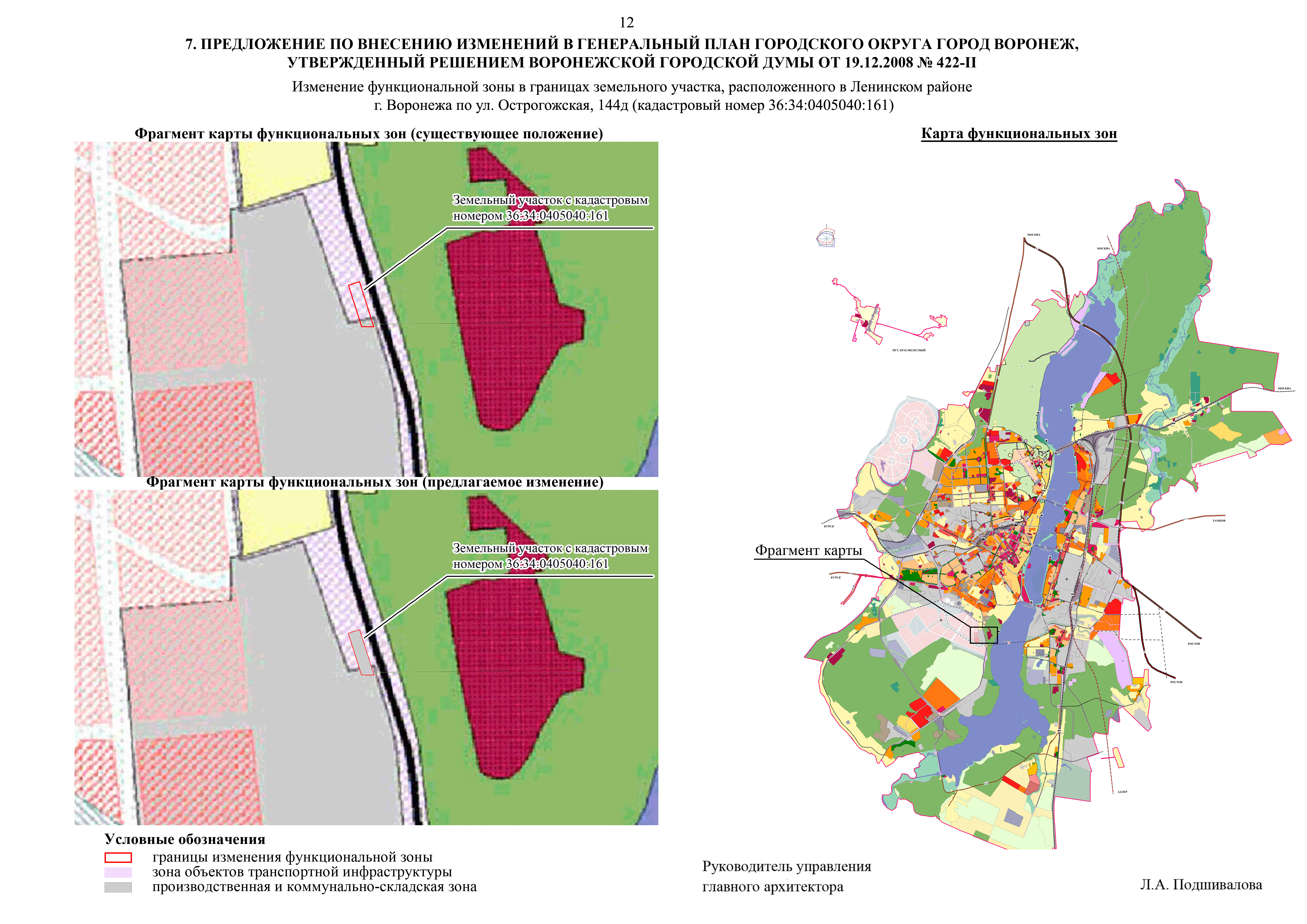 - - по проекту внесения изменений в Генеральный план городского округа город Воронеж в части изменения функциональной зоны объектов транспортной инфраструктуры на производственную и коммунально-складскую зону для земельного участка по ул. Острогожская, 144д (кадастровый номер 36:34:0405040:161);