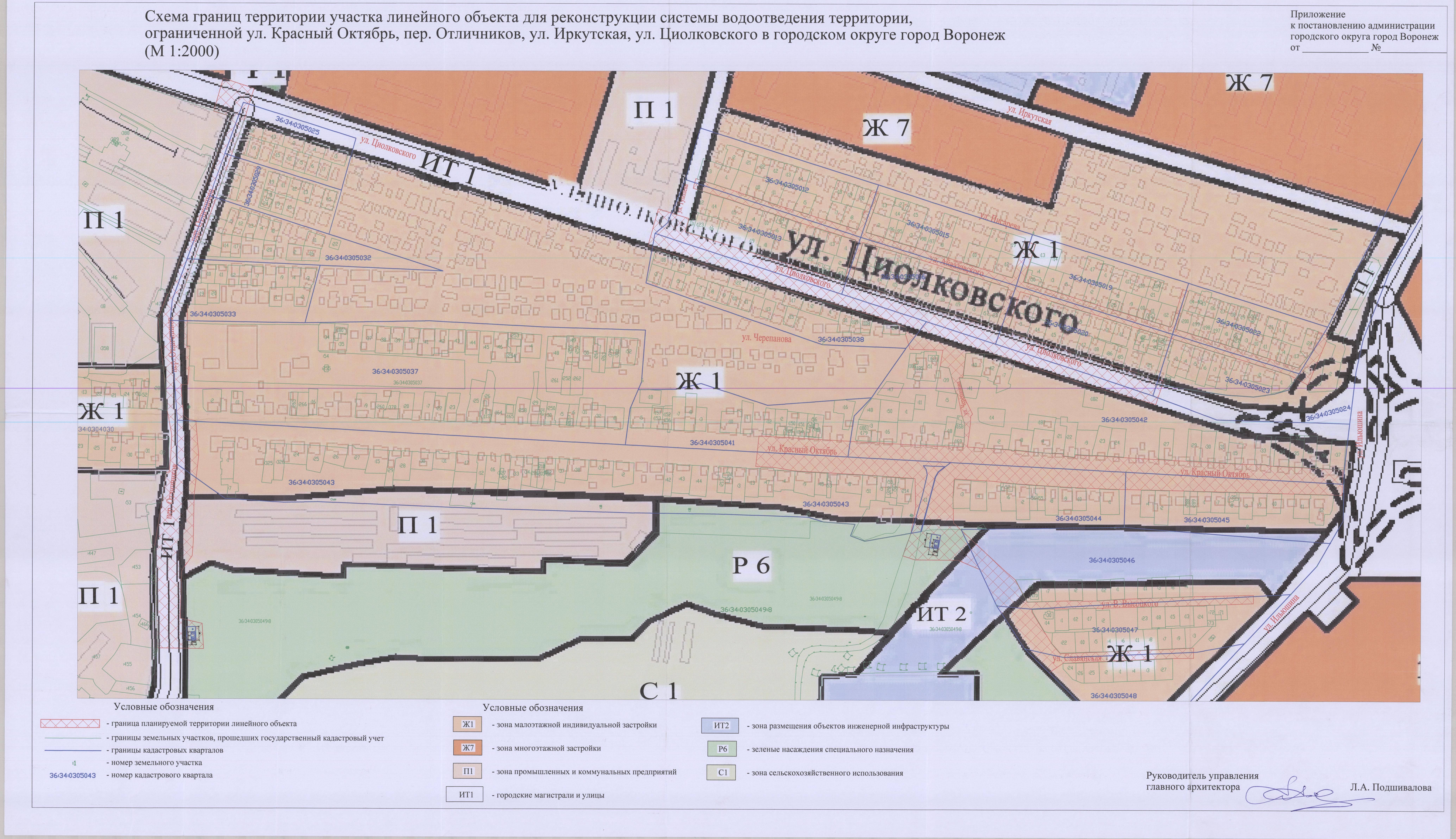 2.1. Подготовить в соответствии с утвержденным заданием документацию по планировке территории участка линейного объекта для реконструкции системы водоотведения территории, ограниченной ул. Красный Октябрь, пер. Отличников, ул. Иркутская, ул. Циолковского в городском округе город Воронеж, согласно прилагаемой схеме.