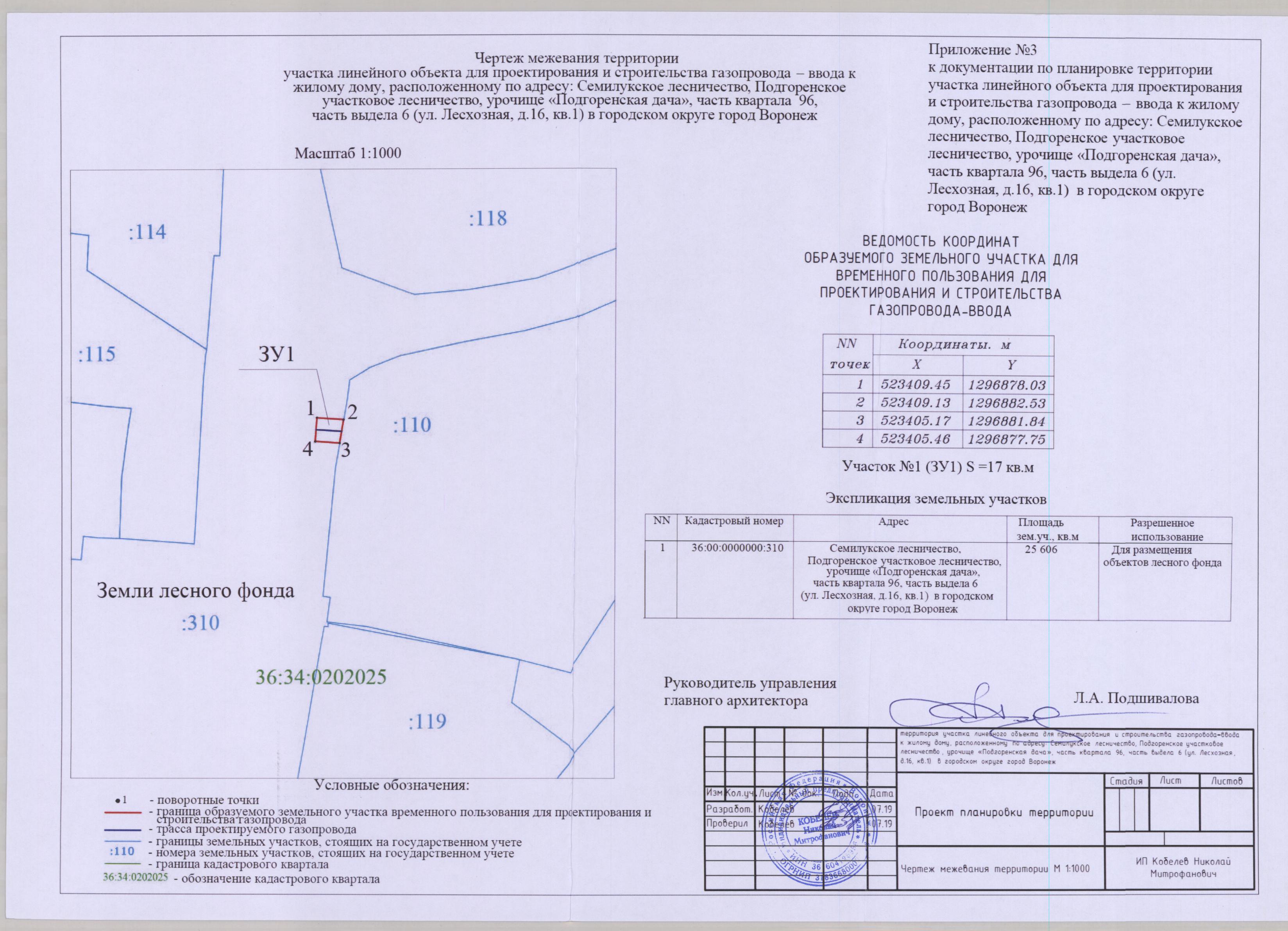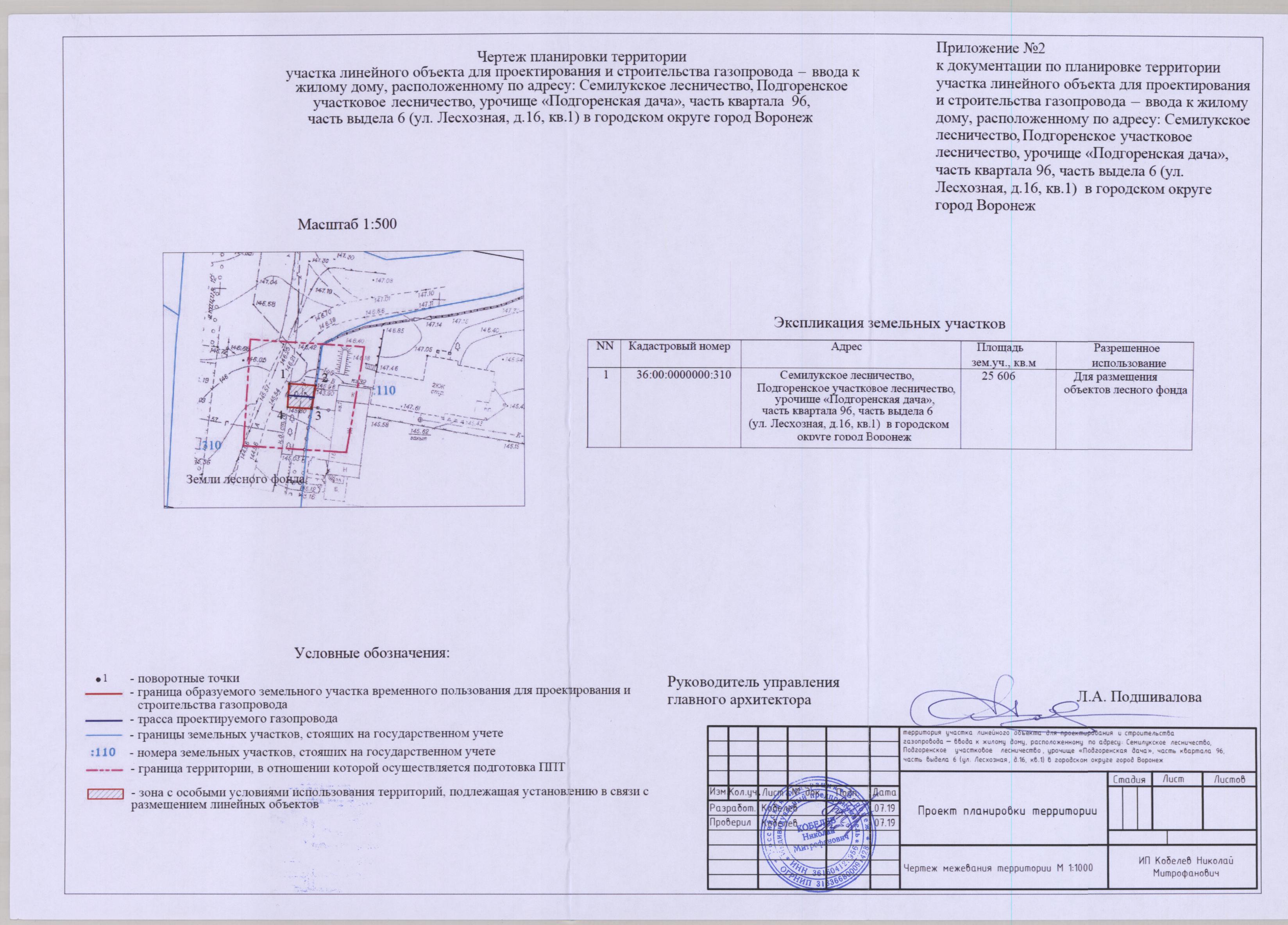 утвердить прилагаемую документацию по планировке территории участка линейного объекта для проектирования и строительства газопровода – ввода к жилому дому, расположенному по адресу: Семилукское лесничество, Подгоренское участковое лесничество, урочище «Подгоренская дача», часть квартала 96, часть выдела 6 (ул. Лесхозная, д. 16, кв. 1) в городском округе город Воронеж.