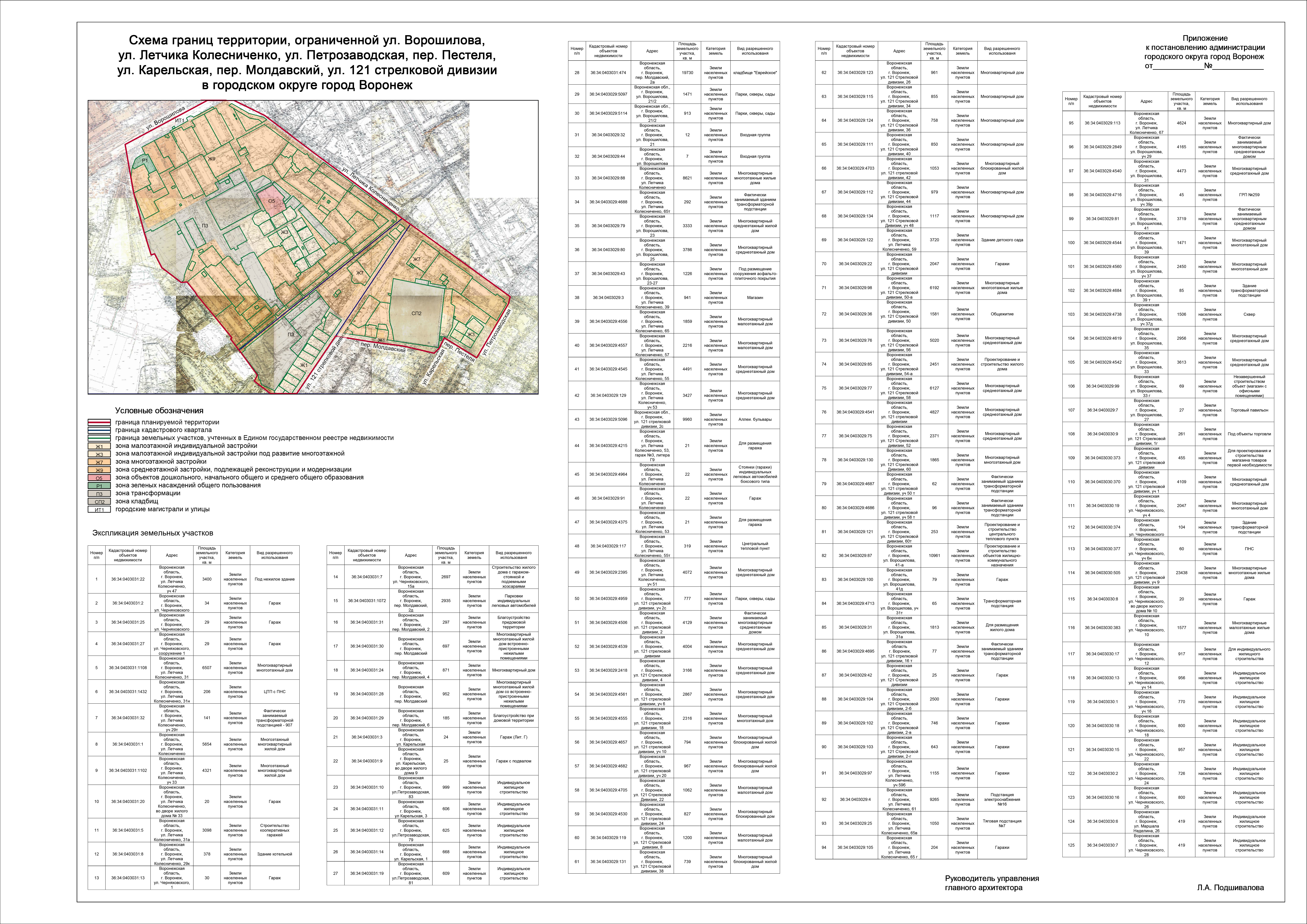 2.1. Организовать подготовку в соответствии с утвержденным заданием, указанным в пункте 1 настоящего постановления, проекта межевания территории, ограниченной ул. Ворошилова, ул. Летчика Колесниченко, ул. Петрозаводская, пер. Пестеля, ул. Карельская, пер. Молдавский, ул. 121 стрелковой дивизии в городском округе город Воронеж, согласно прилагаемой схеме.